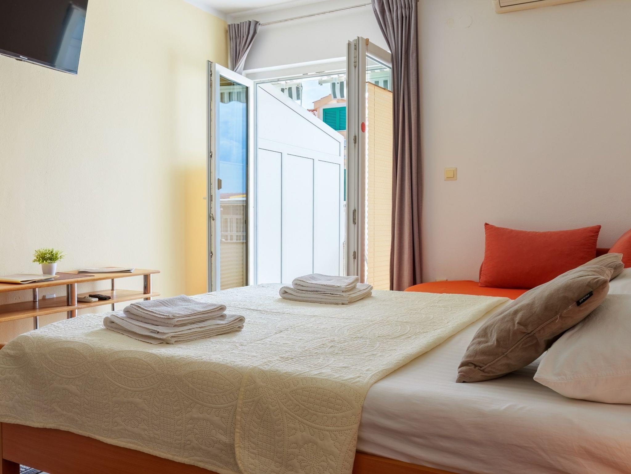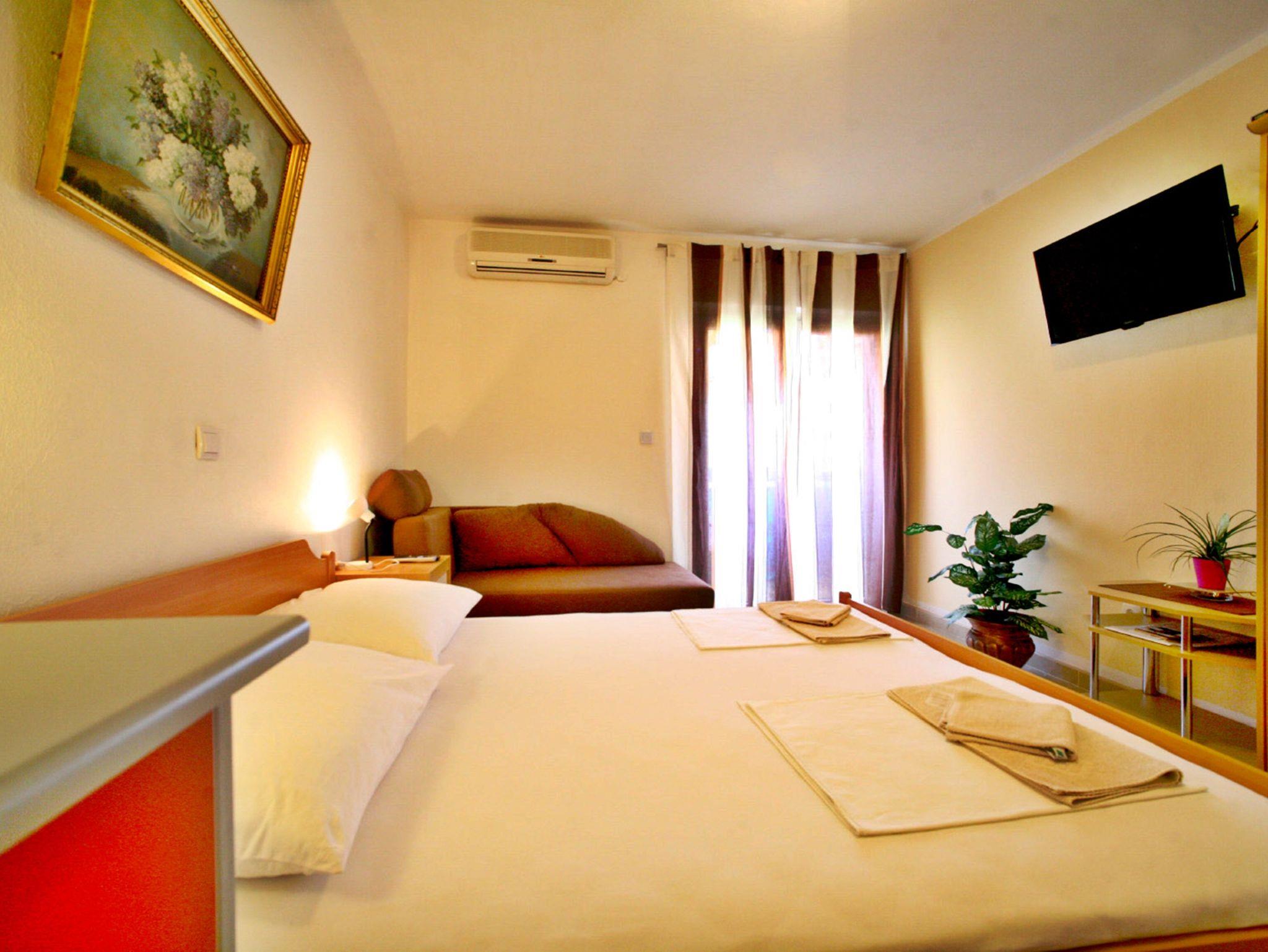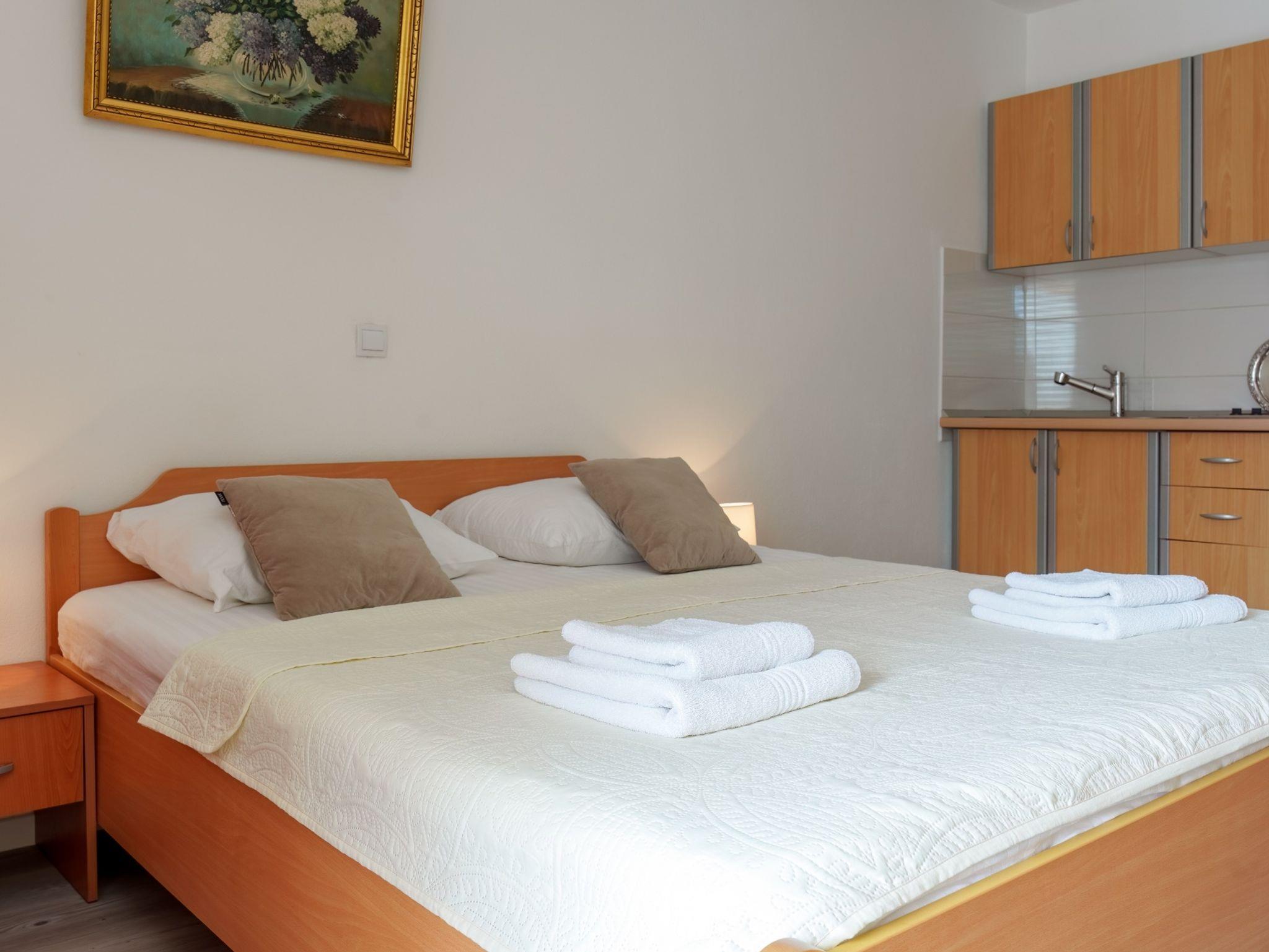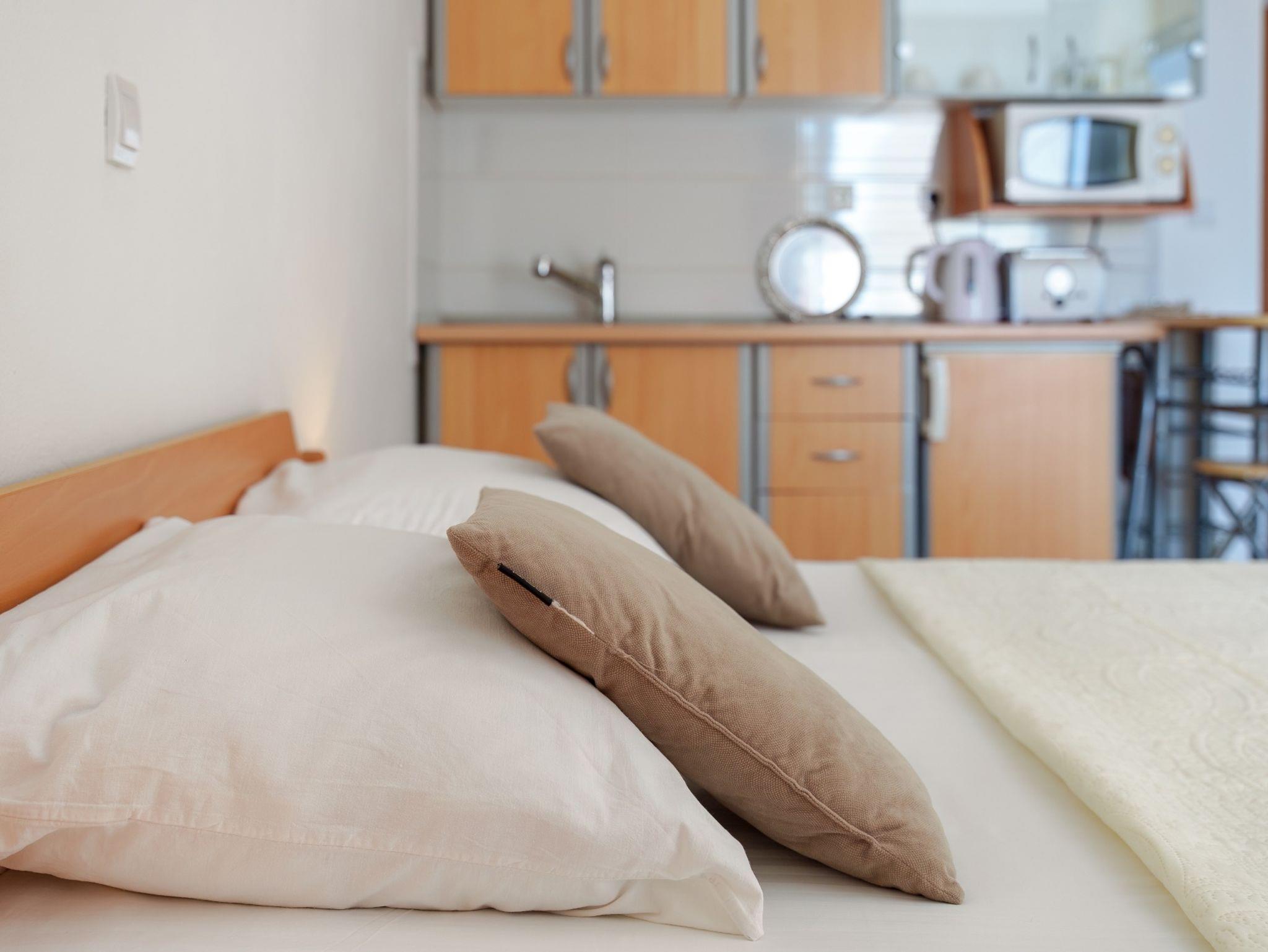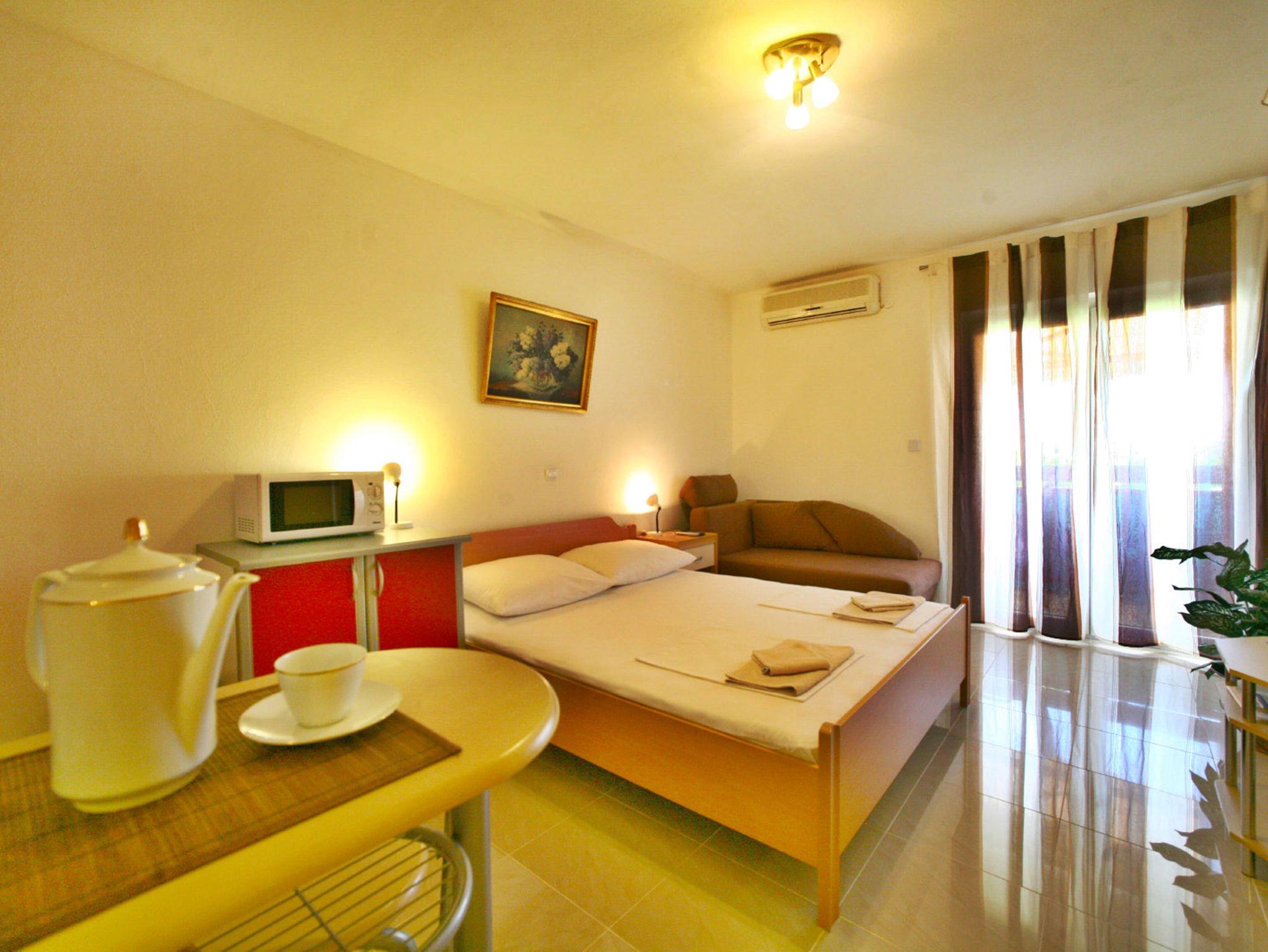 Studio bietet Platz für 2 Gäste. Die Betten sind in Schlafzimmern, die es 1 gibt, innerhalb einer Gesamtfläche von 23m2, angeordnet. Die Gäste haben einen eigenen Balkon zur Verfügung, auf der sie in warmen Sommernächten genießen können. Das Studio-Apartment bietet Meerblick. Es ist erlaubt, Speisen auf dem Gemeinschafts-Grill vorzubereiten. IM PREIS INBEGRIFFEN: Kurtaxe, Endreinigung, Klimatisierung, Parkplatz, Internet, Kinderbett, Bügeleisen, Bügelbrett, Föhn. VERBINDLICHE ZUSÄTZLICHE KOSTEN: Aufzahlung für Kurzaufenthalte (prozentualer Zuschlag pro Nächtigungsanzahl: 30% - 1, 20% - 2, 10% - 3). UNVERBINDLICHE ZUSÄTZLICHE KOSTEN: Wäschewaschen (10,00 € Waschen). Die Verfügbarkeit zusätzlicher Dienstleistungen in Ihrem reservierten Termin und die Preise derselben (falls nicht aufgeführt) müssen im Voraus überprüft werden. Zusätzliche Dienstleistungen die in der Zahlungsaufforderung nicht aufgeführt sind werden direkt beim Vermieter bezahlt, angenommen der Gast nutzt auch diese. Ermäßigung auf den Grundpreis: Gratistag 21=19 (bei einem Aufenthalt von 21 Tagen oder mehr erhalten Sie 2 Gratistage für den Aufenthalt bis 31.12.26).