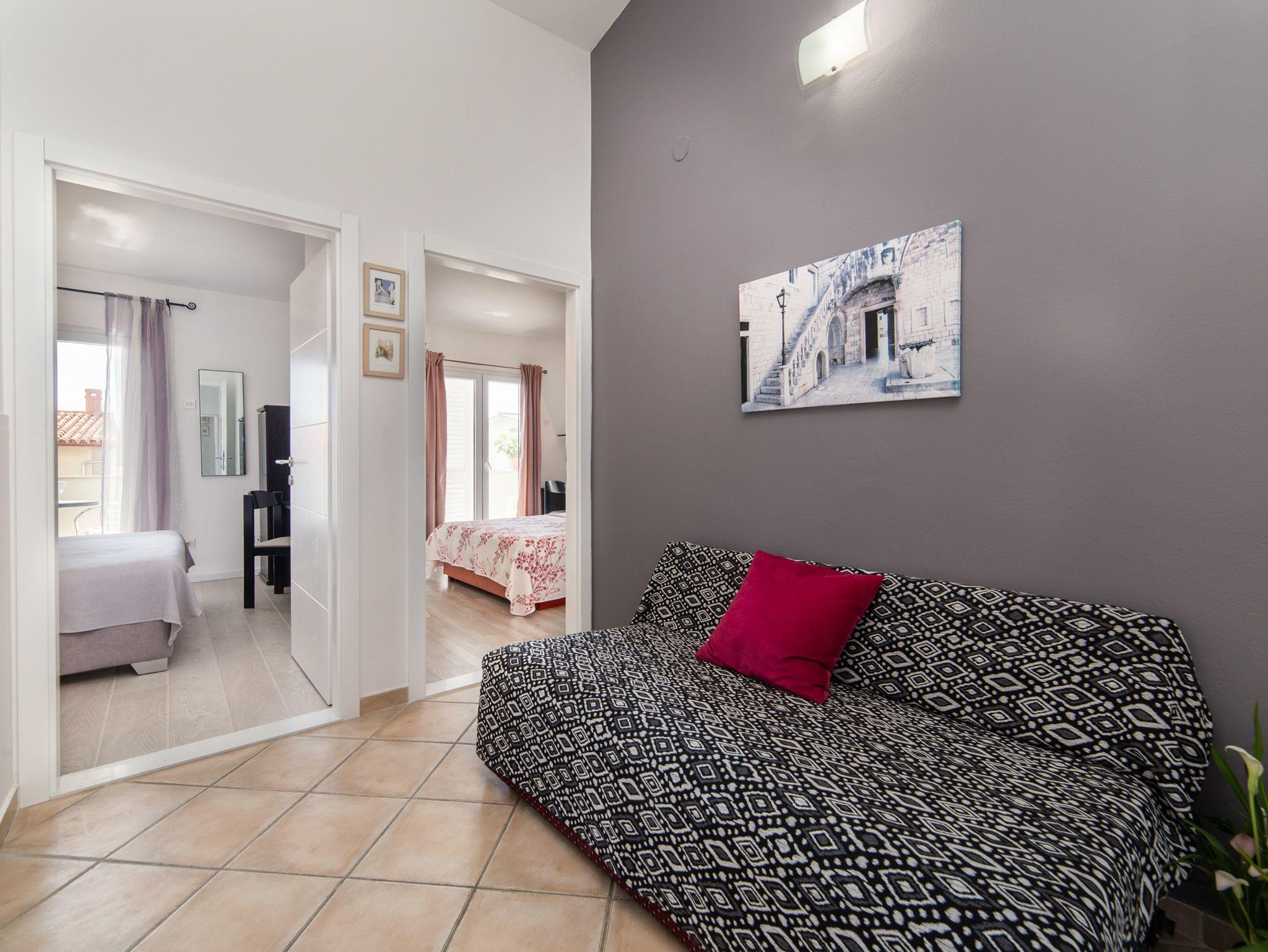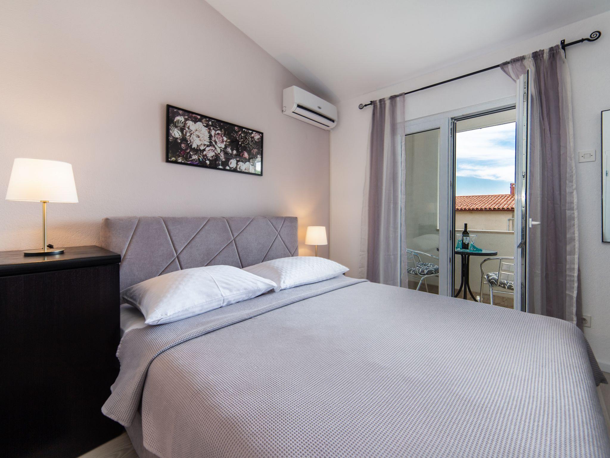 Ferienwohnung bietet Platz für 6 Gäste. Die Betten sind in Schlafzimmern, die es 3 gibt, innerhalb einer Gesamtfläche von 65m2, angeordnet. Die Gäste haben eine eigene Terrasse zur Verfügung, auf der sie in warmen Sommernächten genießen können. IM PREIS INBEGRIFFEN: Kurtaxe, Endreinigung, Klimatisierung, Parkplatz, Internet, Kinderbett, Bügeleisen, Bügelbrett, Föhn. VERBINDLICHE ZUSÄTZLICHE KOSTEN: Aufzahlung für Kurzaufenthalte (prozentualer Zuschlag pro Nächtigungsanzahl: 30% - 1, 20% - 2, 10% - 3). UNVERBINDLICHE ZUSÄTZLICHE KOSTEN: Zusatzbett (8,00 € pro Nacht). Die Verfügbarkeit zusätzlicher Dienstleistungen in Ihrem reservierten Termin und die Preise derselben (falls nicht aufgeführt) müssen im Voraus überprüft werden. Zusätzliche Dienstleistungen die in der Zahlungsaufforderung nicht aufgeführt sind werden direkt beim Vermieter bezahlt, angenommen der Gast nutzt auch diese. Ermäßigung auf den Grundpreis: Gratistag 14=13 (bei einem Aufenthalt von 14 Tagen oder mehr erhalten Sie einen Gratistag für den Aufenthalt bis 31.12.26).