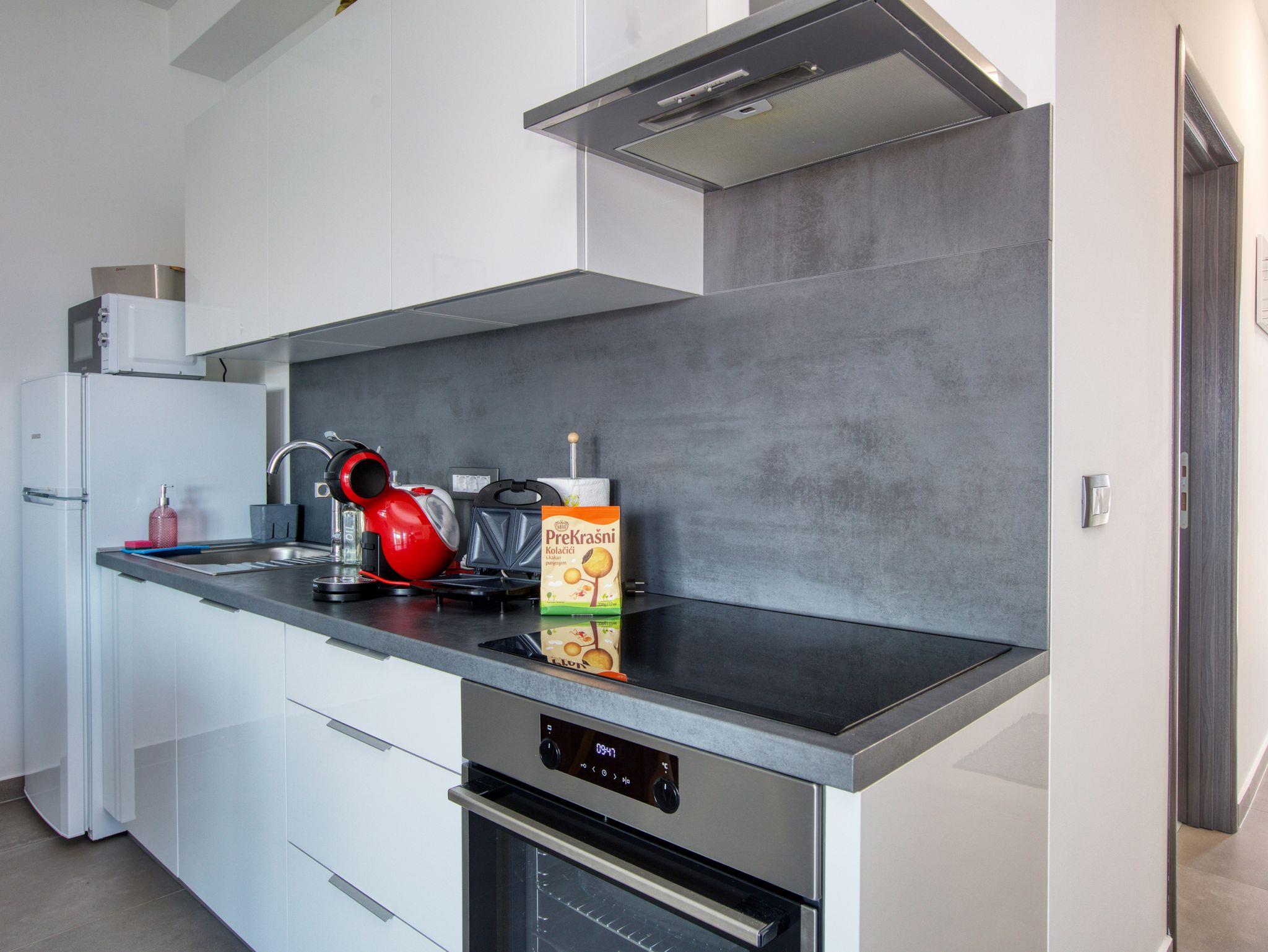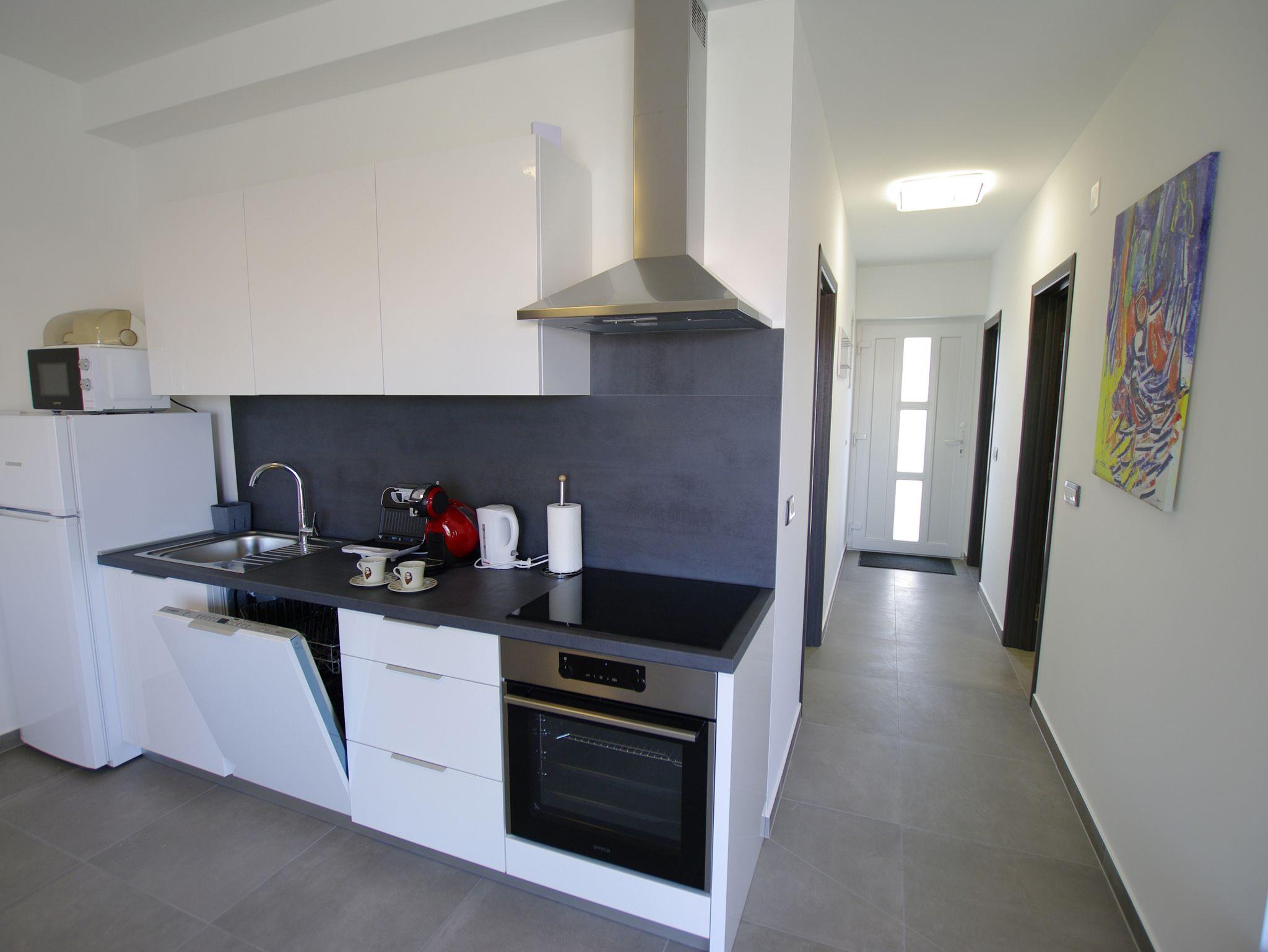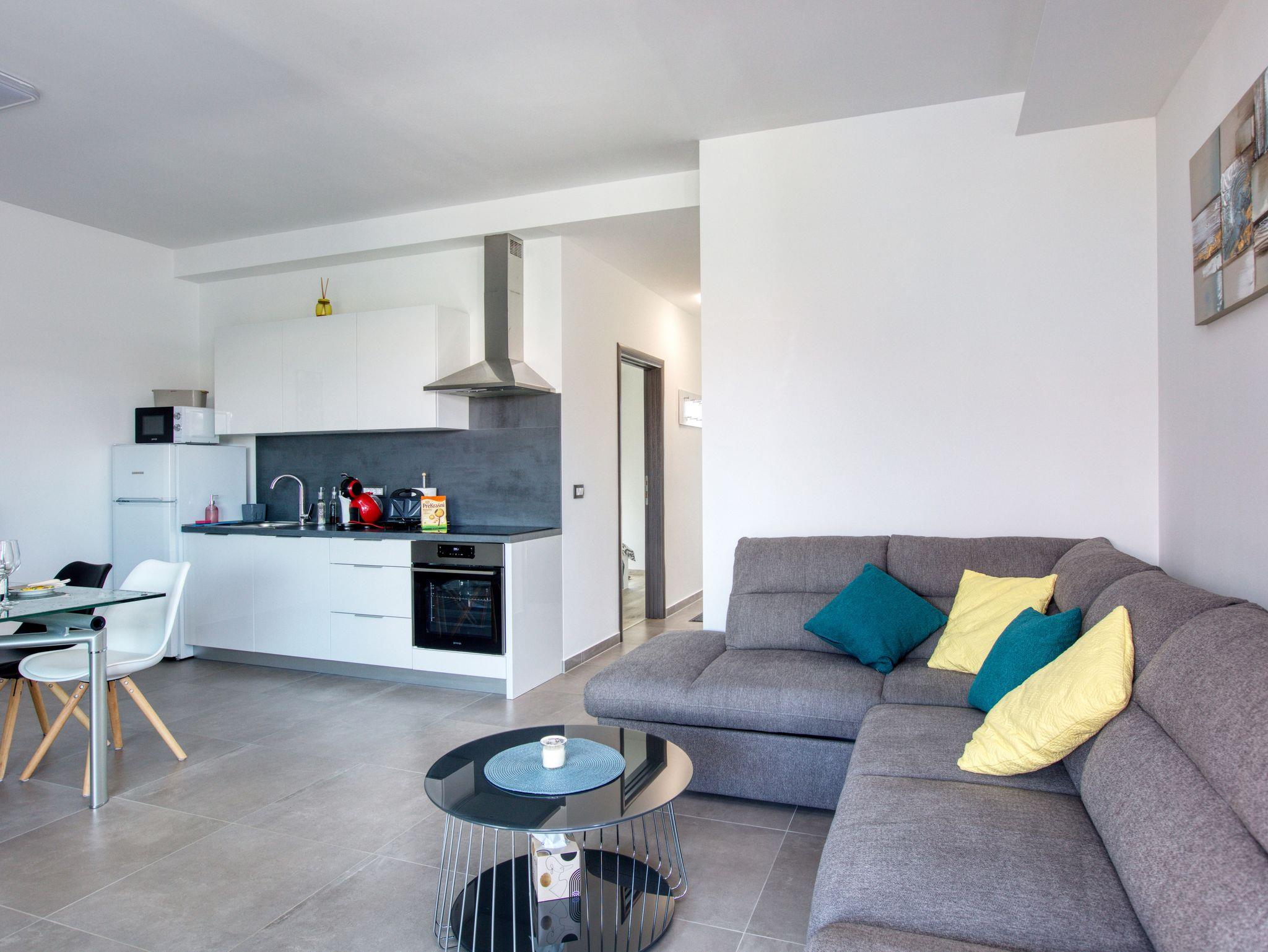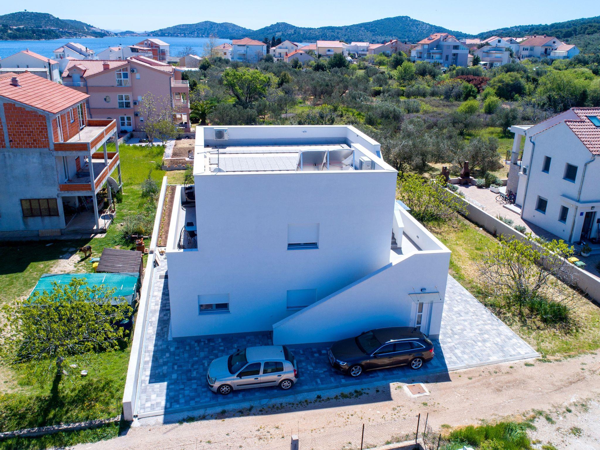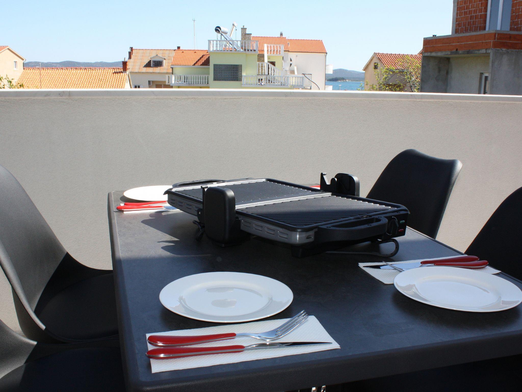 Ferienwohnung bietet Platz für 4 Gäste. Die Betten sind in Schlafzimmern, die es 1 gibt, und in Wohnzimmer, innerhalb einer Gesamtfläche von 47m2, angeordnet. Die Gäste haben eine eigene Terrasse zur Verfügung, auf der sie in warmen Sommernächten genießen können. Das Apartment bietet Meerblick. Es ist erlaubt, Speisen auf dem Gemeinschafts-Grill vorzubereiten. IM PREIS INBEGRIFFEN: Kurtaxe, Endreinigung, Klimatisierung, Parkplatz, Internet, Wäschewaschen, Kinderbett, Bügeleisen, Bügelbrett, Föhn, tragbarer Grill. VERBINDLICHE ZUSÄTZLICHE KOSTEN: Aufzahlung für Kurzaufenthalte (prozentualer Zuschlag pro Nächtigungsanzahl: 30% - 1, 20% - 2, 10% - 3). Die Verfügbarkeit zusätzlicher Dienstleistungen in Ihrem reservierten Termin und die Preise derselben (falls nicht aufgeführt) müssen im Voraus überprüft werden. Zusätzliche Dienstleistungen die in der Zahlungsaufforderung nicht aufgeführt sind werden direkt beim Vermieter bezahlt, angenommen der Gast nutzt auch diese. Ermäßigung auf den Grundpreis: Gratistag 21=19 (bei einem Aufenthalt von 21 Tagen oder mehr erhalten Sie 2 Gratistage für den Aufenthalt bis 31.12.26).
