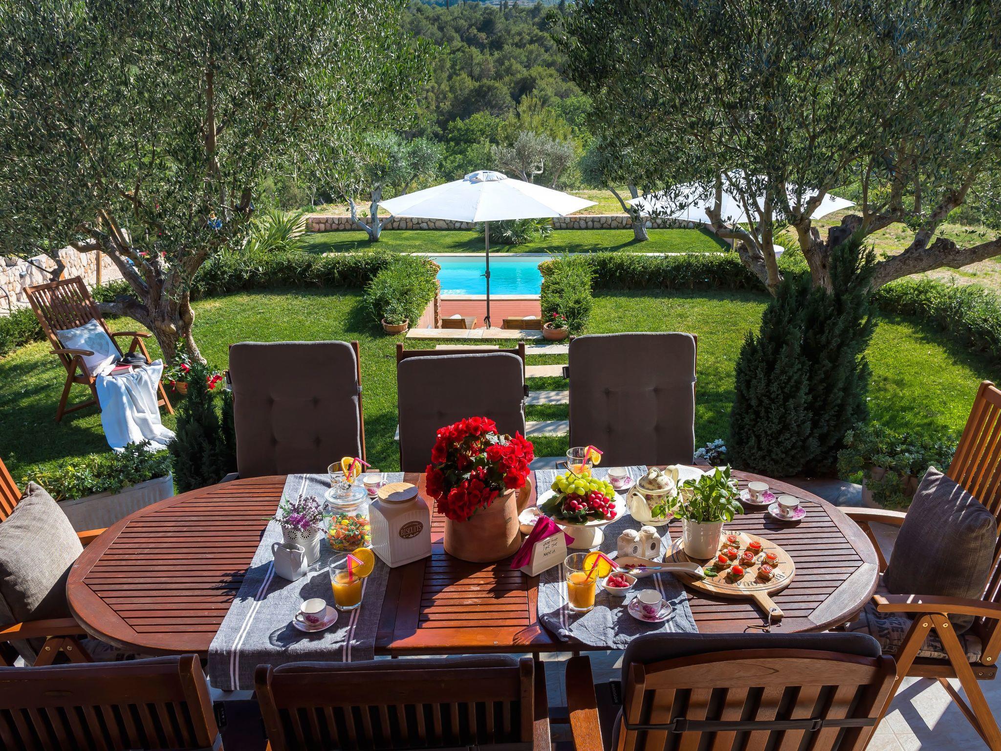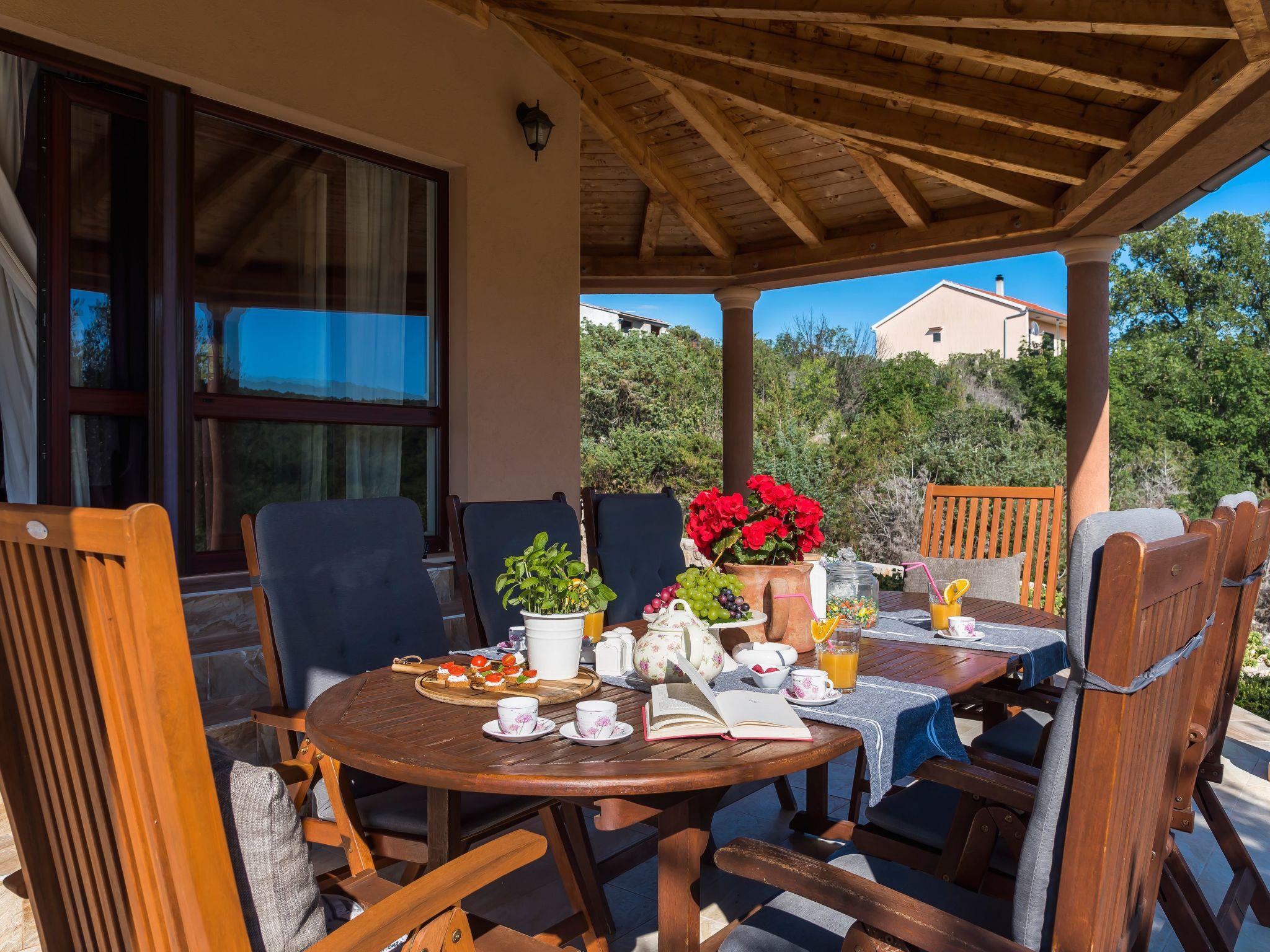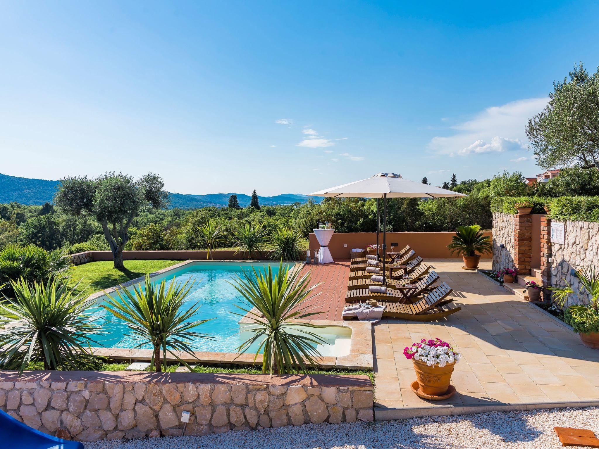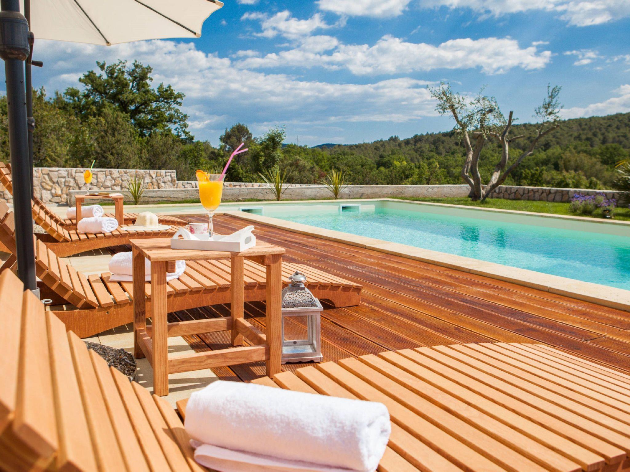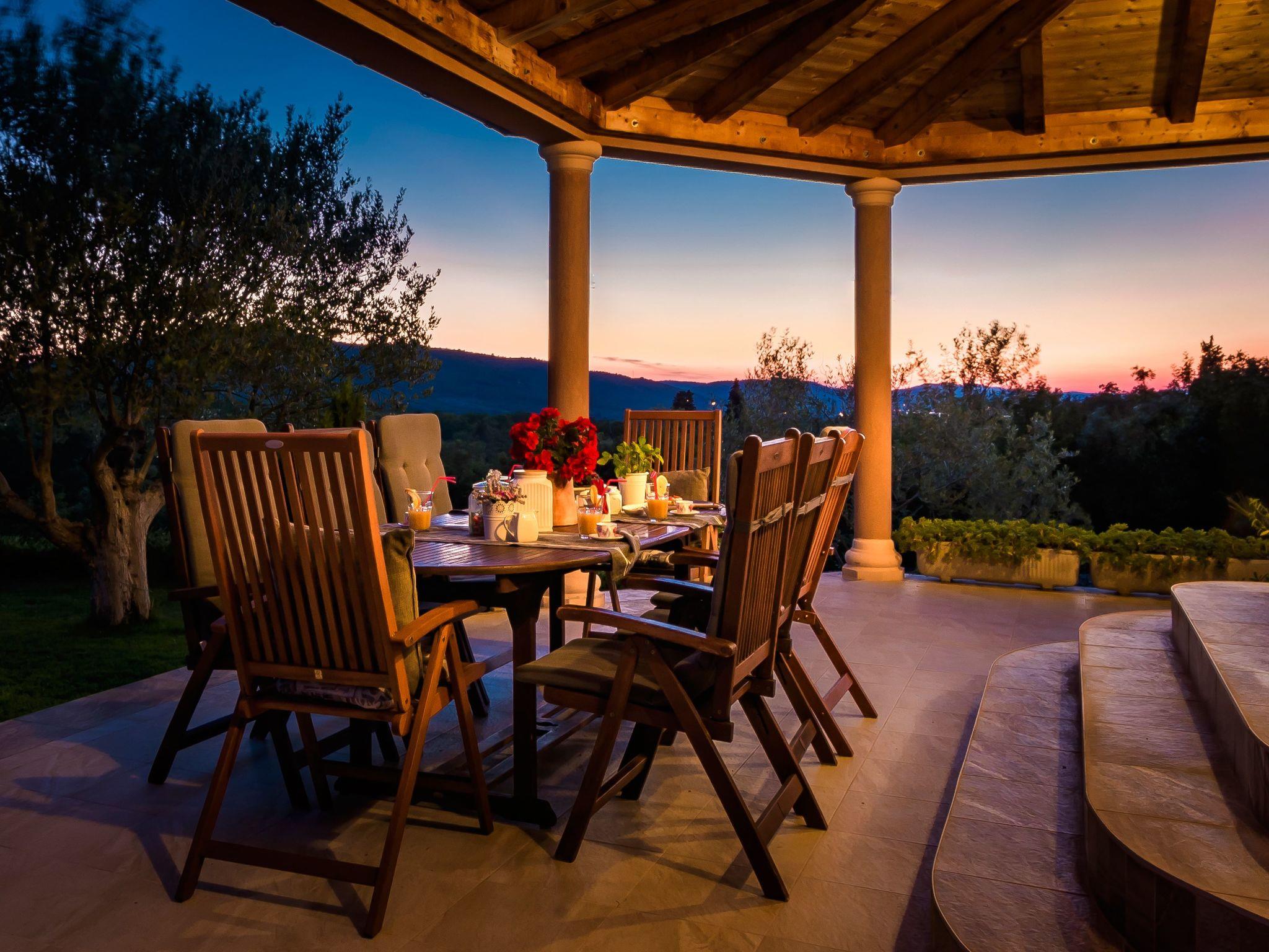 The upper floor provides access to the private roof terrace with sun loungers and a separate balcony. Recharge your batteries on the sun terrace and enjoy the magnificent view over the wooded countryside to the Adriatic Sea. The living area on the lower level of the house leads out onto the spacious veranda with seating. Take in the picturesque landscape while enjoying breakfast outside or use this space to immerse yourself in the world of books. The warm evenings invite you to use the barbecue provided. A little further down the slope is a private swimming pool for exclusive use. The comfortable villa also has three private outdoor parking spaces. A total of four bicycles can be used free of charge.