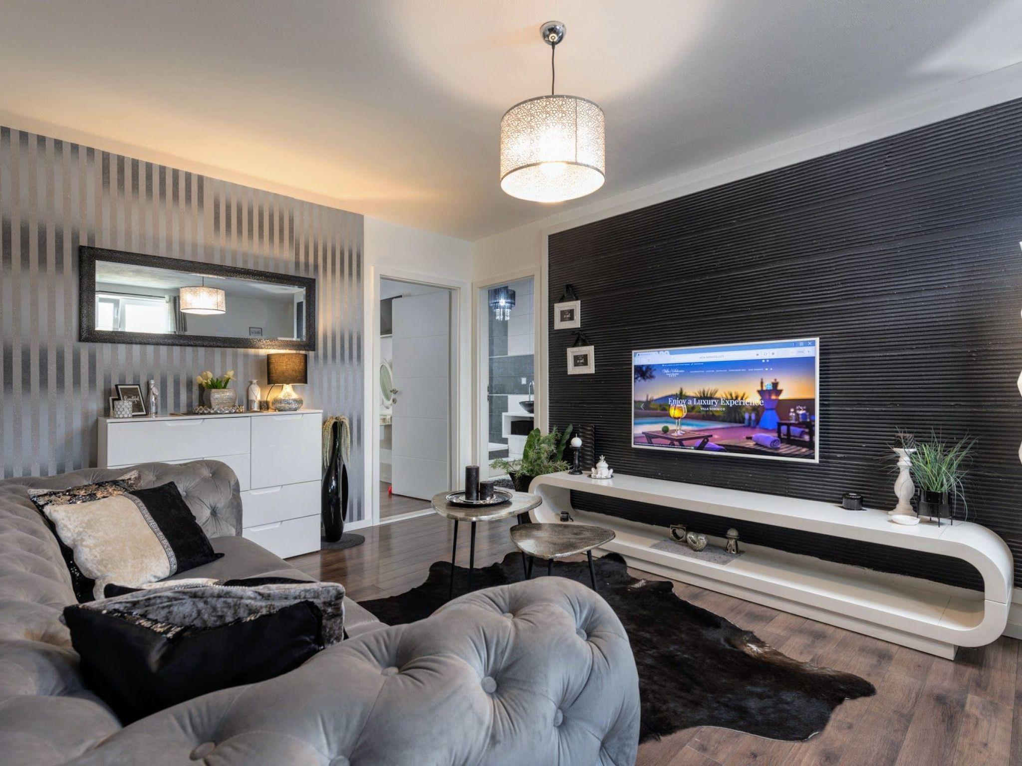 The luxurious holiday home offers a living space of approx. 216 m² and impresses with a stylish interior and a touch of neoclassical architecture. Air conditioning, heating and underfloor heating are available throughout the property. The holiday home features a fully equipped kitchen with adjoining dining area, a separate living area with terrace access, three bedrooms and three bathrooms with rain showers. The three bedrooms are each furnished with a double bed (1.80 m wide), one of which also has a single bed (0.90 m wide) for an additional person. A washing machine and tumble dryer are available for you to use free of charge.