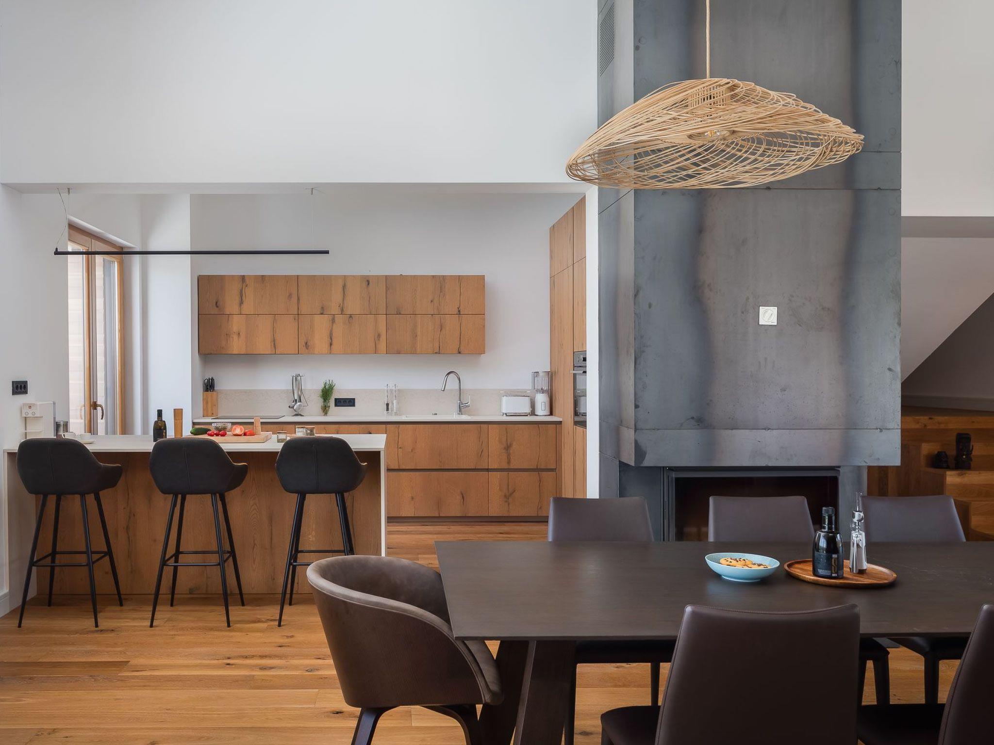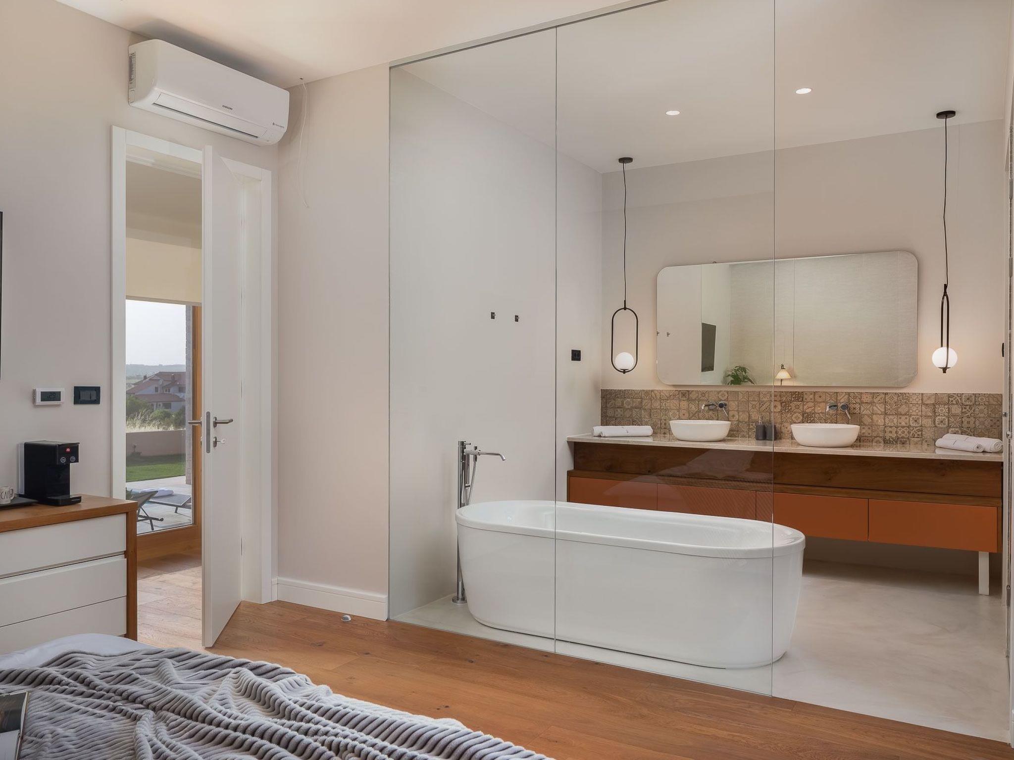 Inside, the house boasts a harmonious blend of comfort and convenience across its five bedrooms and an equal number of bathrooms, ensuring privacy and ease for every guest. With underfloor heating available throughout and air conditioning to keep the ambience perfect at any time of the year, comfort is guaranteed. The villa is equipped with a washing machine and clothes dryer for exclusive use, alongside a coffee machine and dishwasher to make your stay as smooth as possible. The presence of a fireplace adds a cozy warmth to the space, inviting you to gather around for memorable evenings indoors.