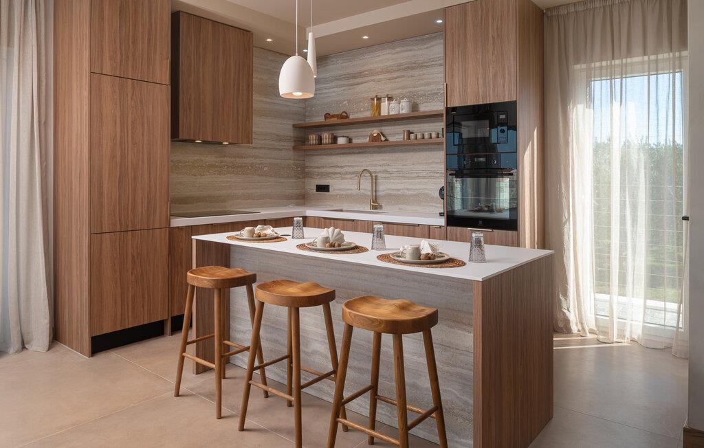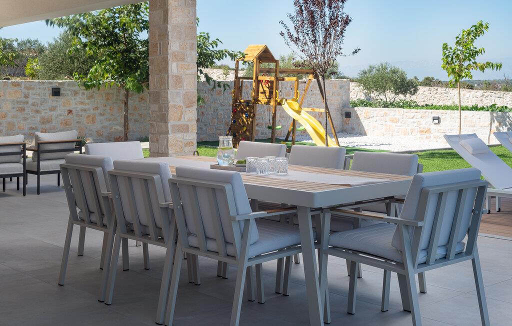Huset kombinerer traditionel stenarkitektur med moderne elementer, hvilket skaber en indbydende og stilfuld atmosfære. Det åbne opholdsområde tilbyder masser af plads til hele familien og er udstyret med elegante møbler, der forener komfort og stil.