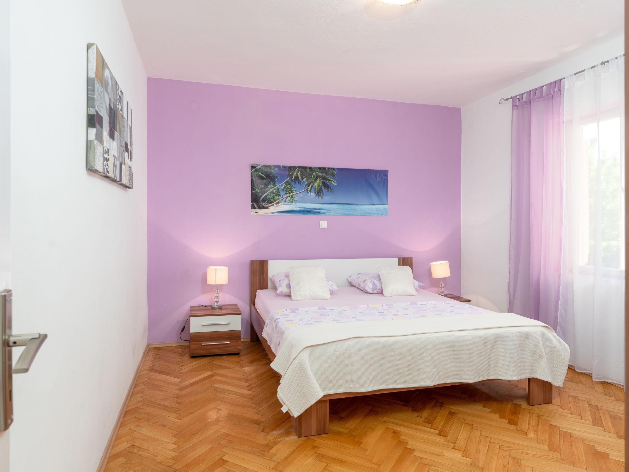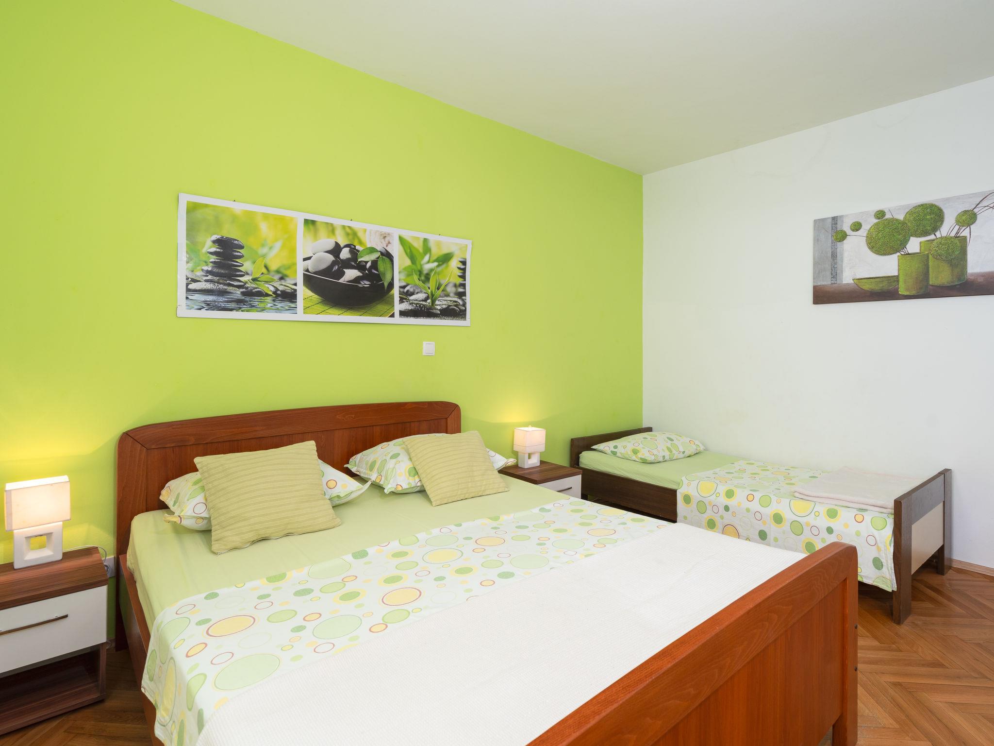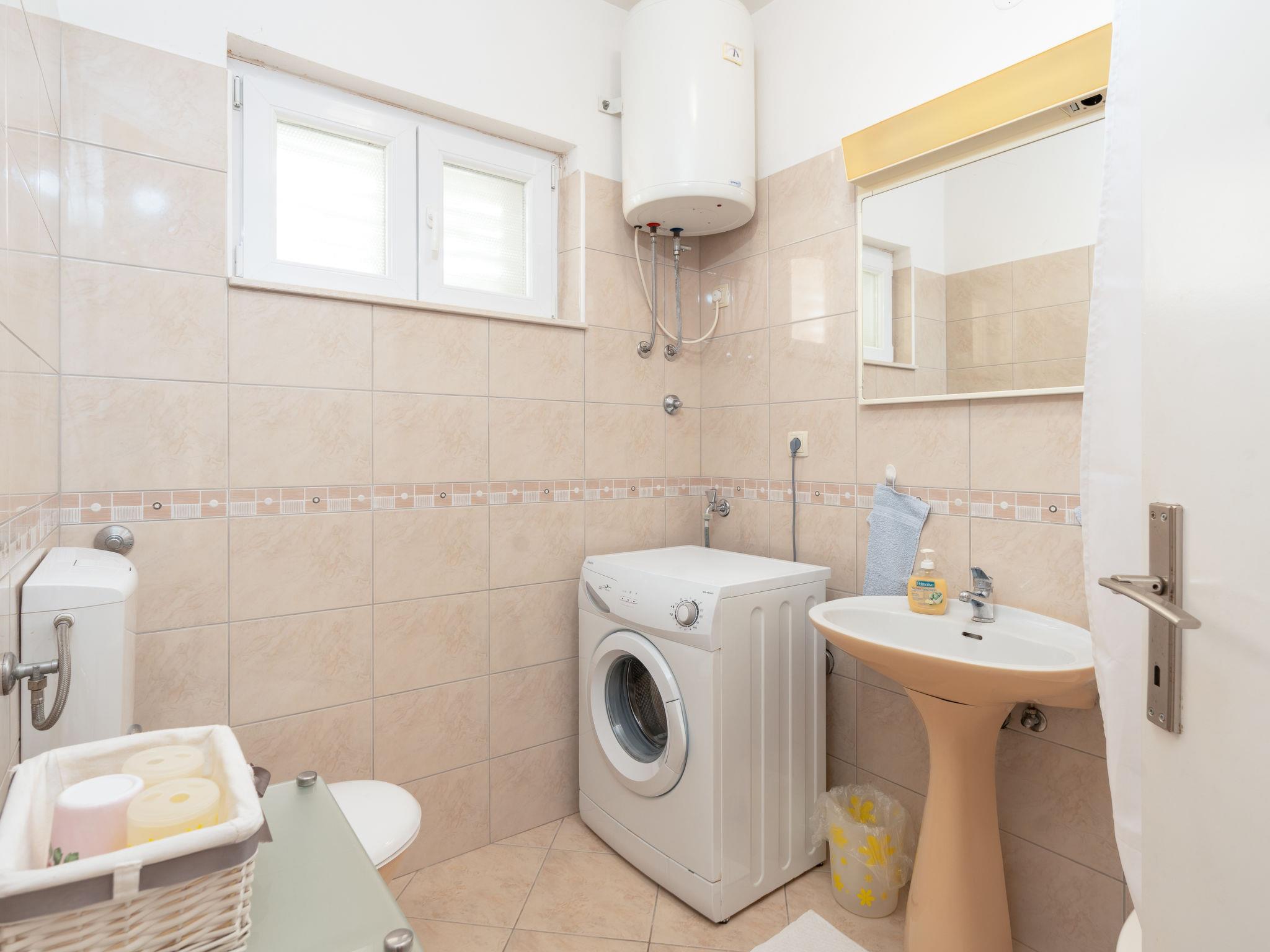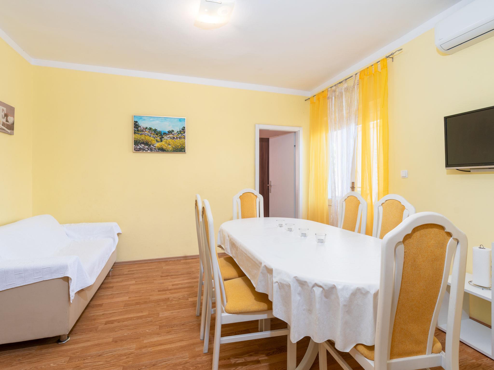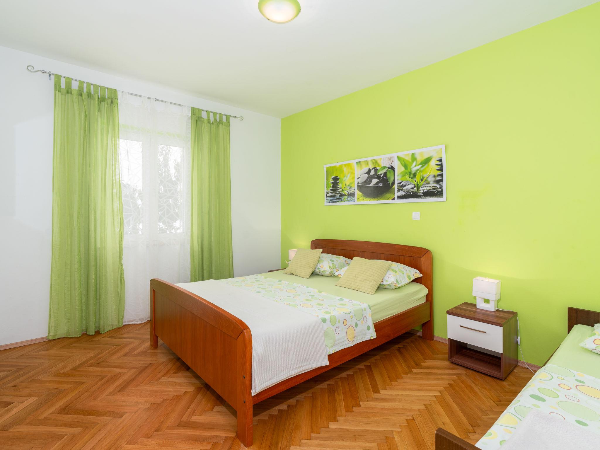 "Vjera", 4-room apartment 83 m2, on the ground floor. Living/dining room with satellite TV and air conditioning. Exit to the terrace. 1 room with 1 bed (90 cm, length 200 cm), 1 french bed (160 cm, length 200 cm). 1 room with 2 beds (90 cm, length 200 cm). 1 room with 1 double bed (2 x 90 cm, length 200 cm). Open kitchen (1 hot plate, oven, dishwasher, 3 gas rings, toaster, kettle, microwave, electric coffee machine). Shower/WC, sep. WC. No heating option. Terrace 25 m2 partly roofed. Terrace furniture, deck chairs. Facilities: washing machine. Internet (WiFi, free). Please note: non-smoking house.
