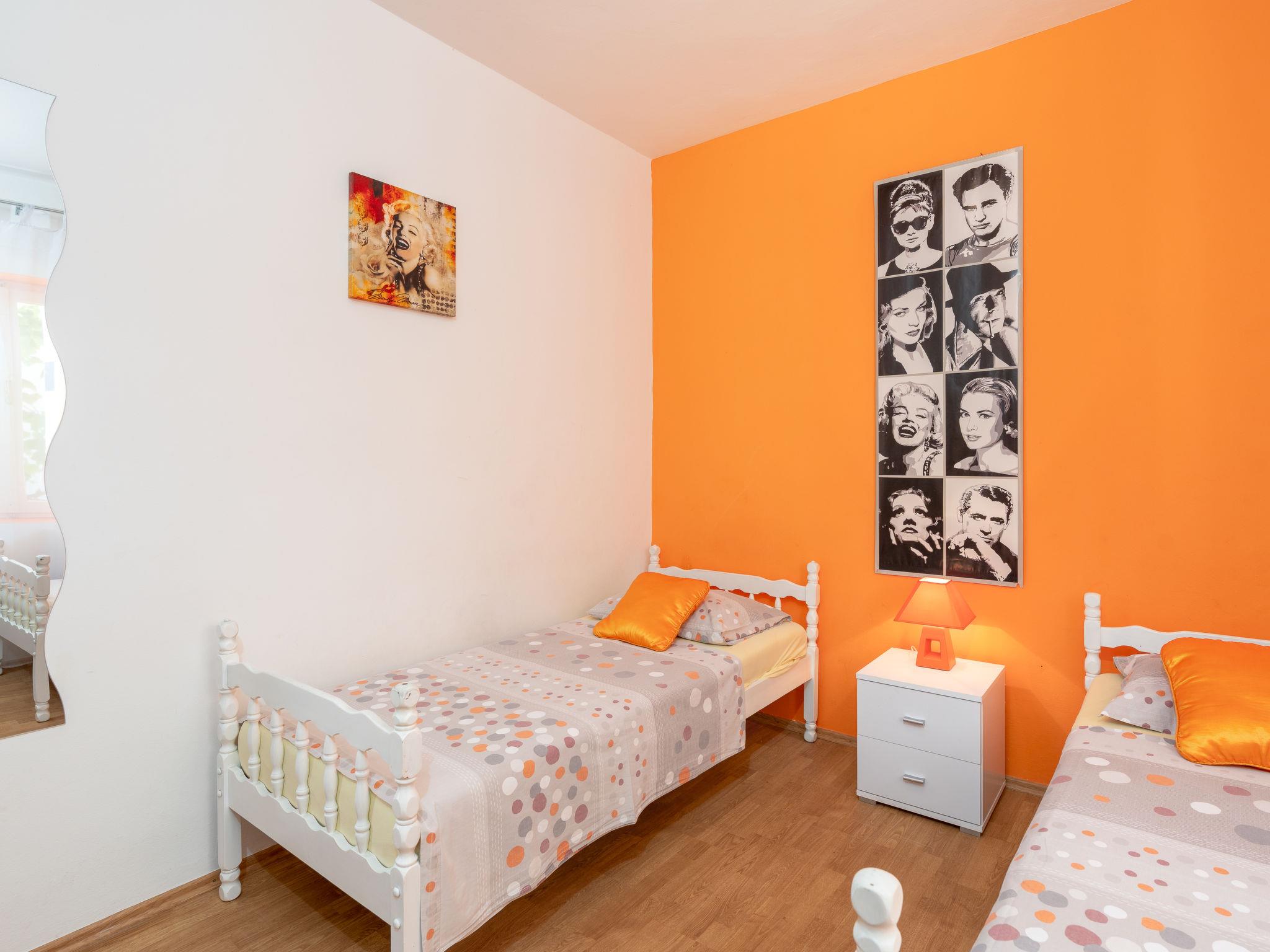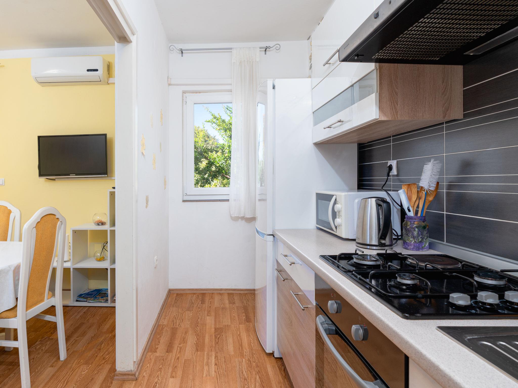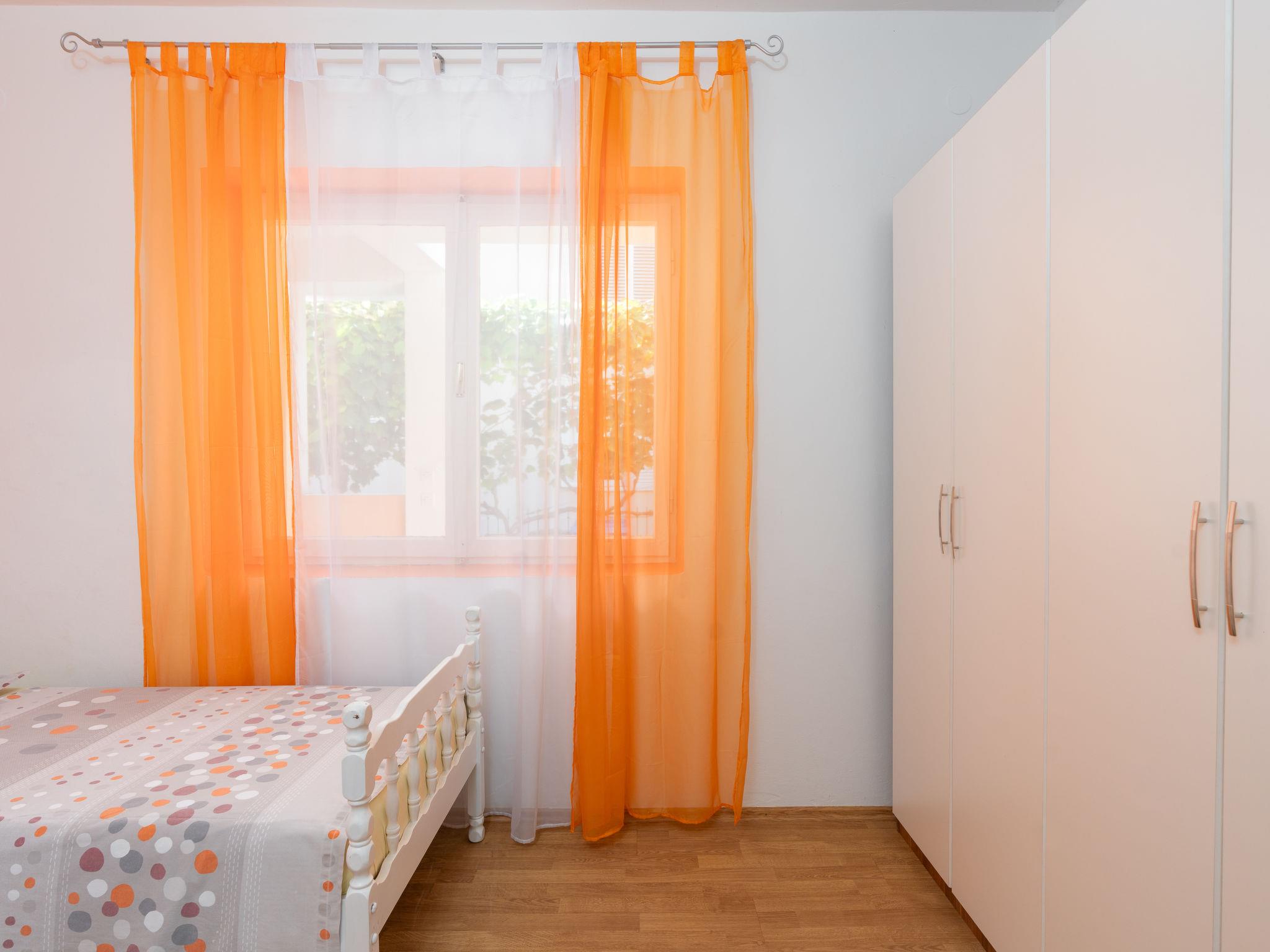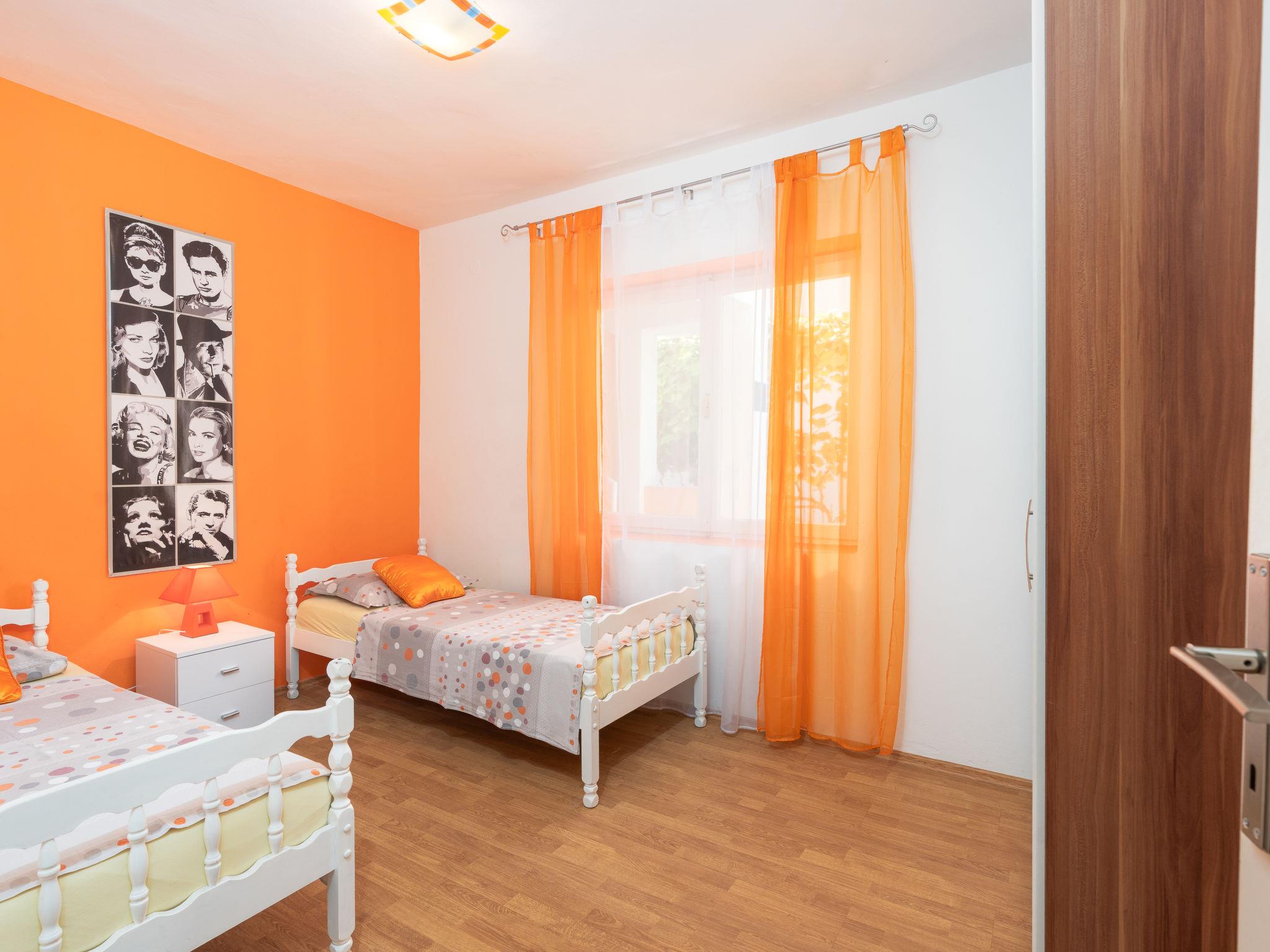 "Vjera", 4-room apartment 83 m2, on the ground floor. Living/dining room with satellite TV and air conditioning. Exit to the terrace. 1 room with 1 bed (90 cm, length 200 cm), 1 french bed (160 cm, length 200 cm). 1 room with 2 beds (90 cm, length 200 cm). 1 room with 1 double bed (2 x 90 cm, length 200 cm). Open kitchen (1 hot plate, oven, dishwasher, 3 gas rings, toaster, kettle, microwave, electric coffee machine). Shower/WC, sep. WC. No heating option. Terrace 25 m2 partly roofed. Terrace furniture, deck chairs. Facilities: washing machine. Internet (WiFi, free). Please note: non-smoking house.