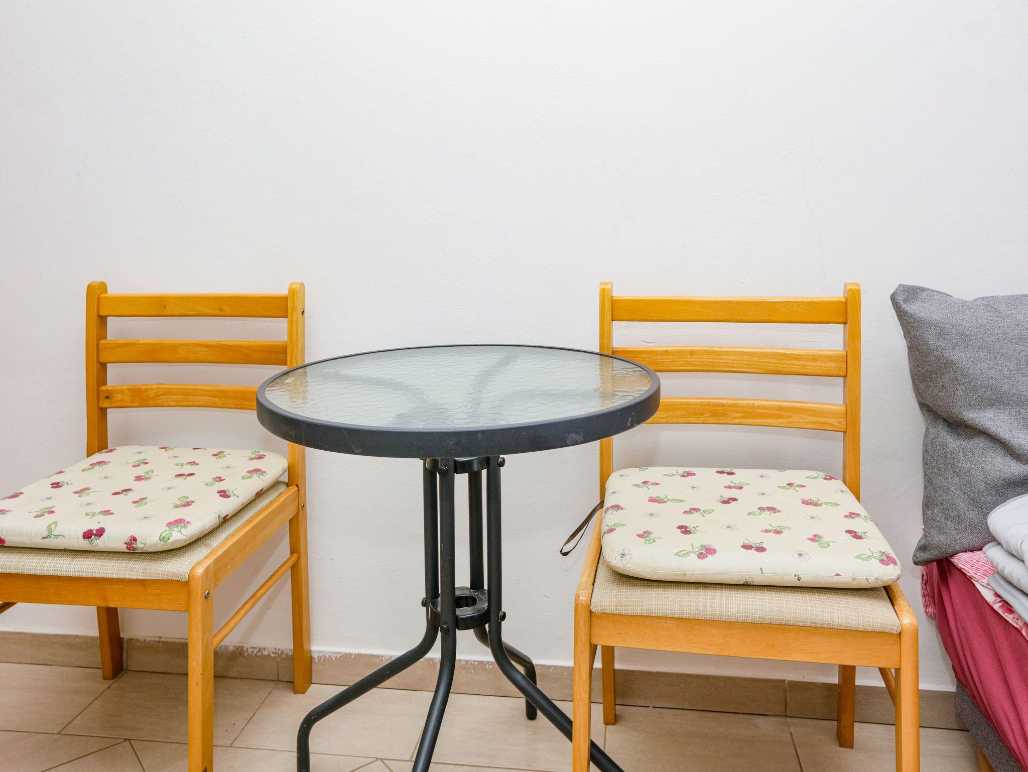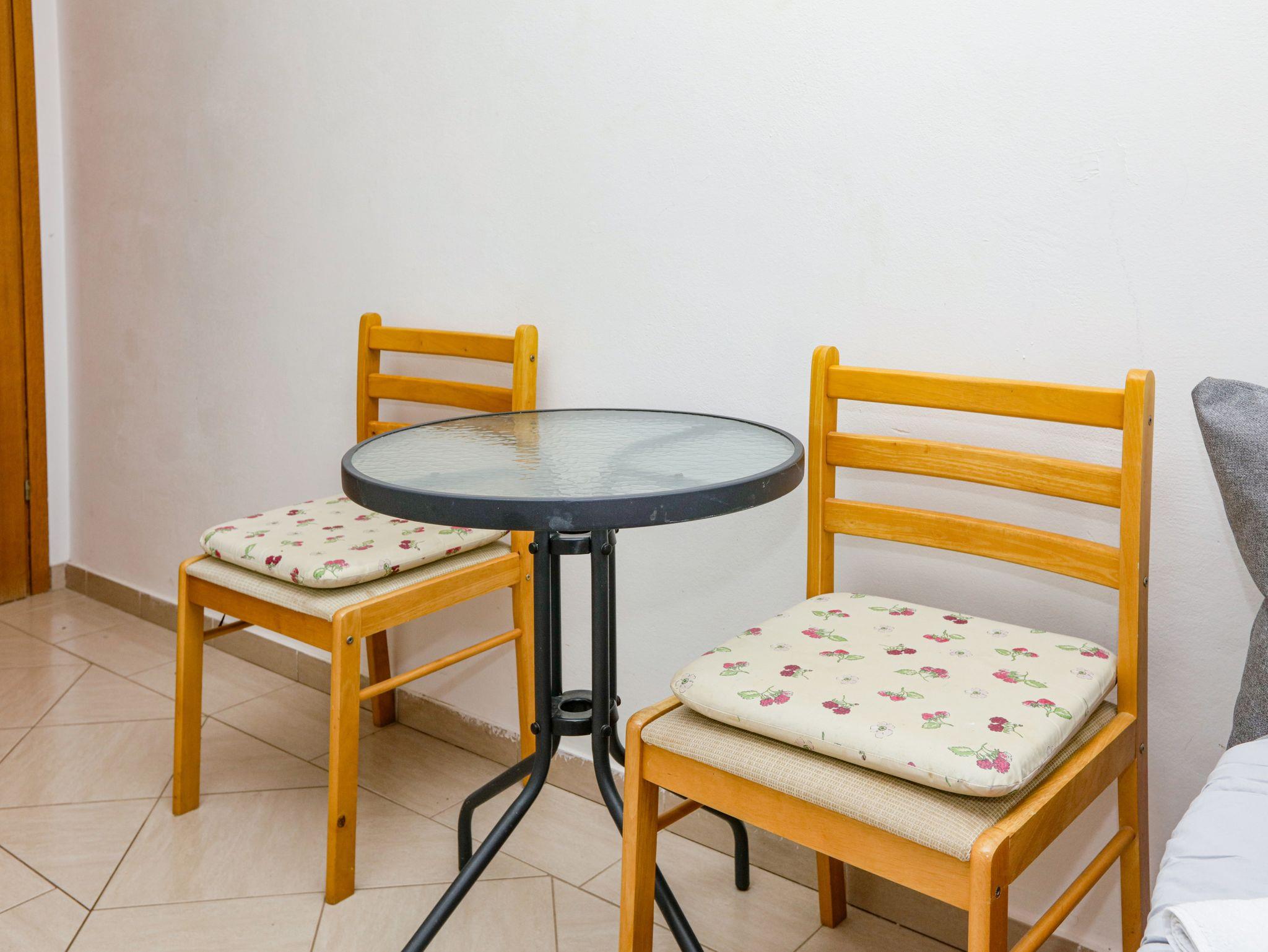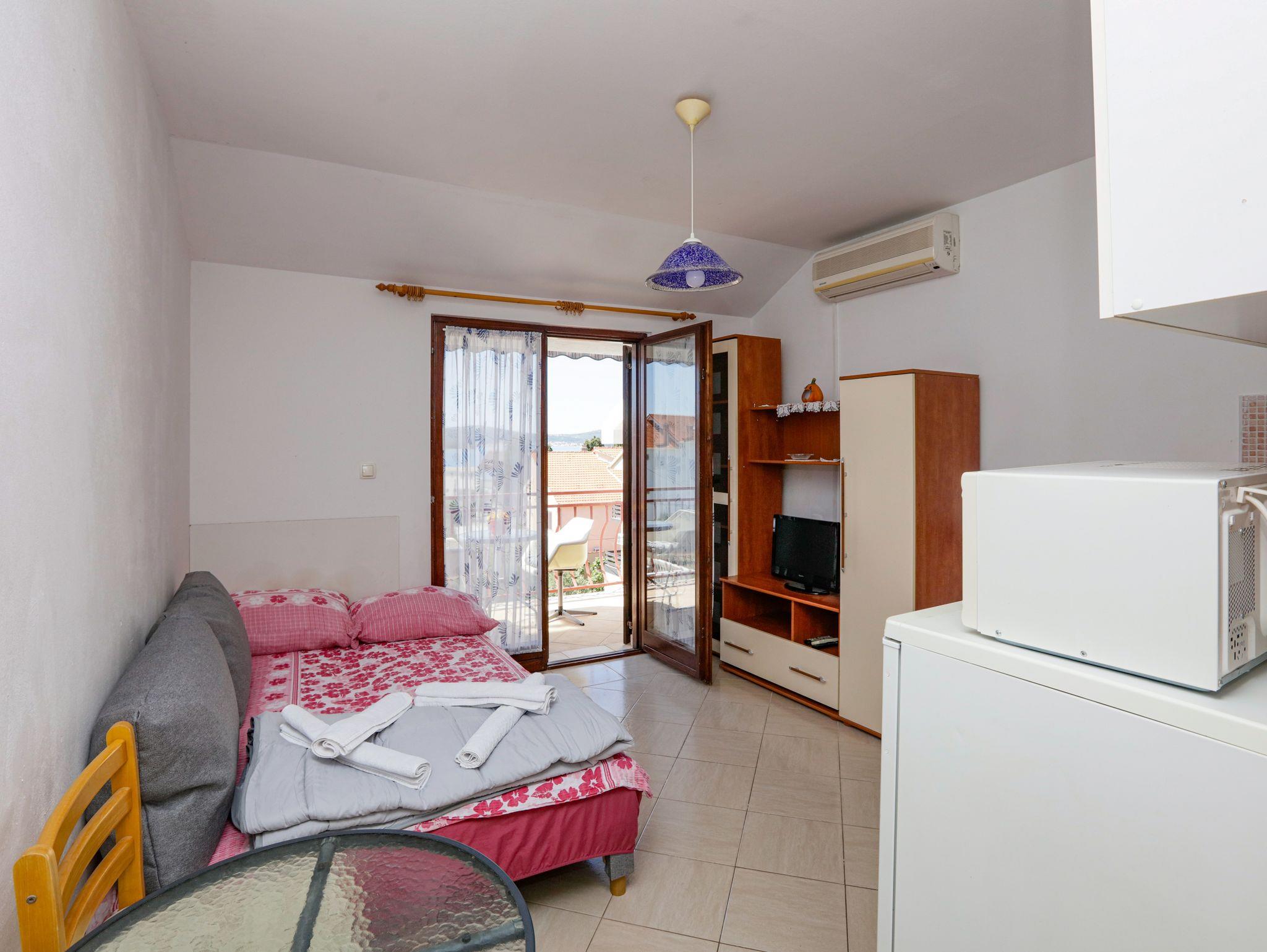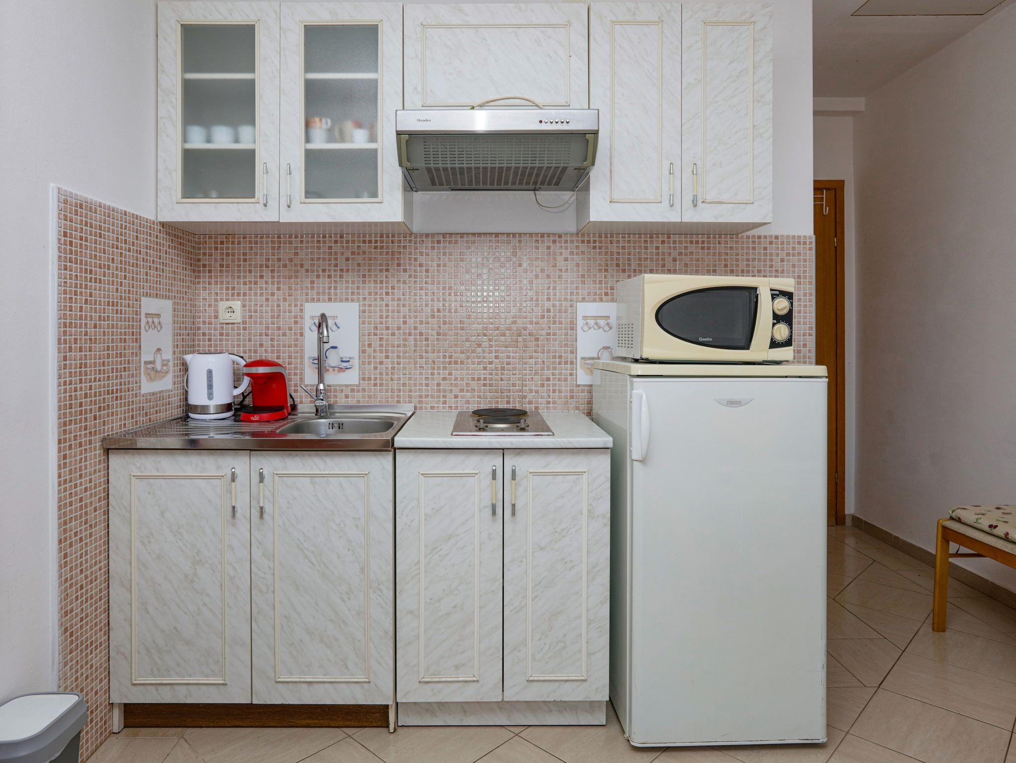 Studio bietet Platz für 2 Gäste. Die Betten sind in Wohnzimmer, innerhalb einer Gesamtfläche von 22m2, angeordnet. Die Gäste haben eine eigene Terrasse zur Verfügung, auf der sie in warmen Sommernächten genießen können. Das Studio-Apartment bietet Meerblick. Es ist erlaubt, Speisen auf dem Gemeinschafts-Grill vorzubereiten. IM PREIS INBEGRIFFEN: Kurtaxe, Endreinigung, Klimatisierung, Parkplatz, Internet, Kinderbett, Bügeleisen, Bügelbrett, Föhn. VERBINDLICHE ZUSÄTZLICHE KOSTEN: Aufzahlung für Kurzaufenthalte (prozentualer Zuschlag pro Nächtigungsanzahl: 30% - 1, 20% - 2, 10% - 3). Die Verfügbarkeit zusätzlicher Dienstleistungen in Ihrem reservierten Termin und die Preise derselben (falls nicht aufgeführt) müssen im Voraus überprüft werden. Zusätzliche Dienstleistungen die in der Zahlungsaufforderung nicht aufgeführt sind werden direkt beim Vermieter bezahlt, angenommen der Gast nutzt auch diese.