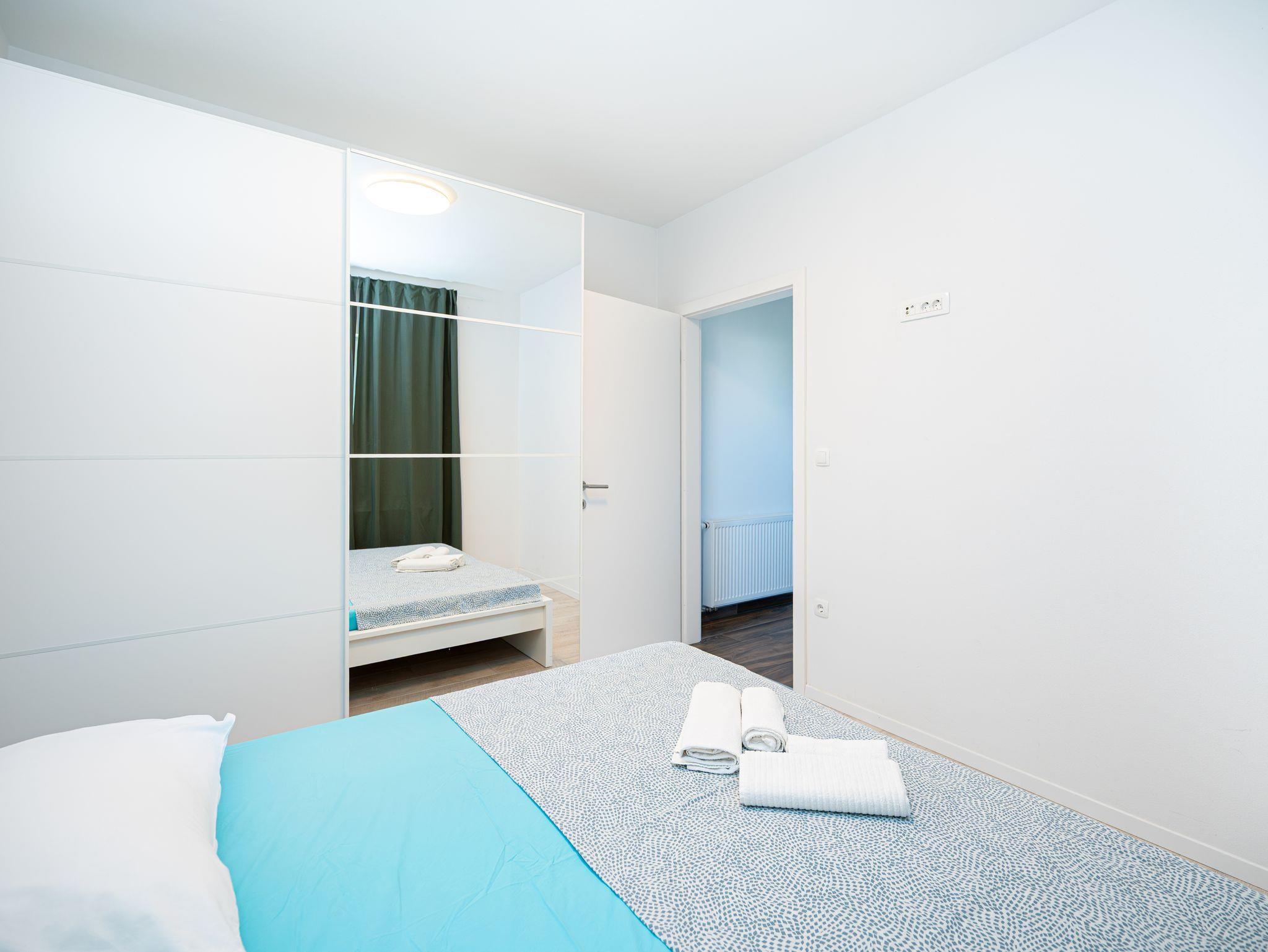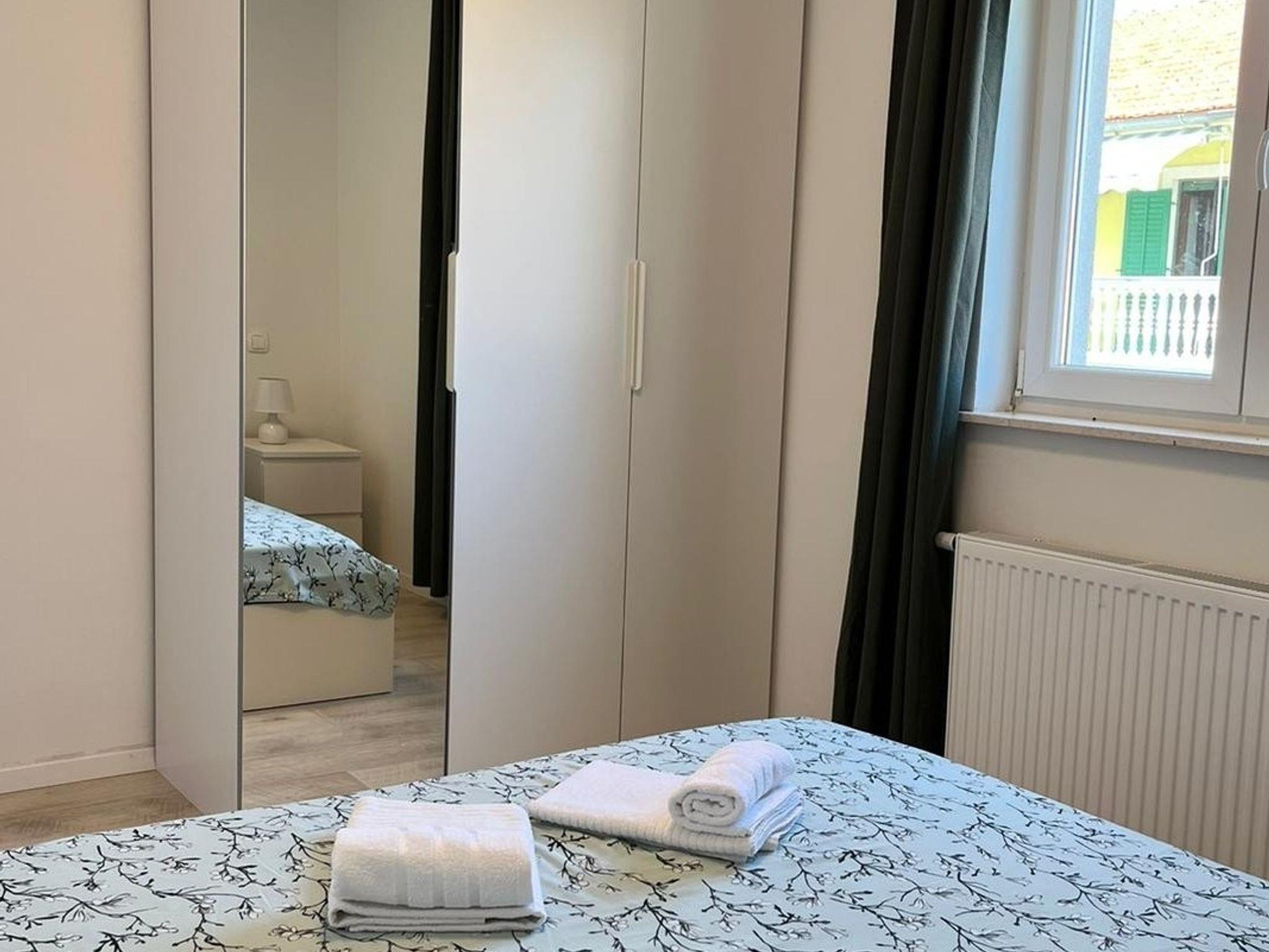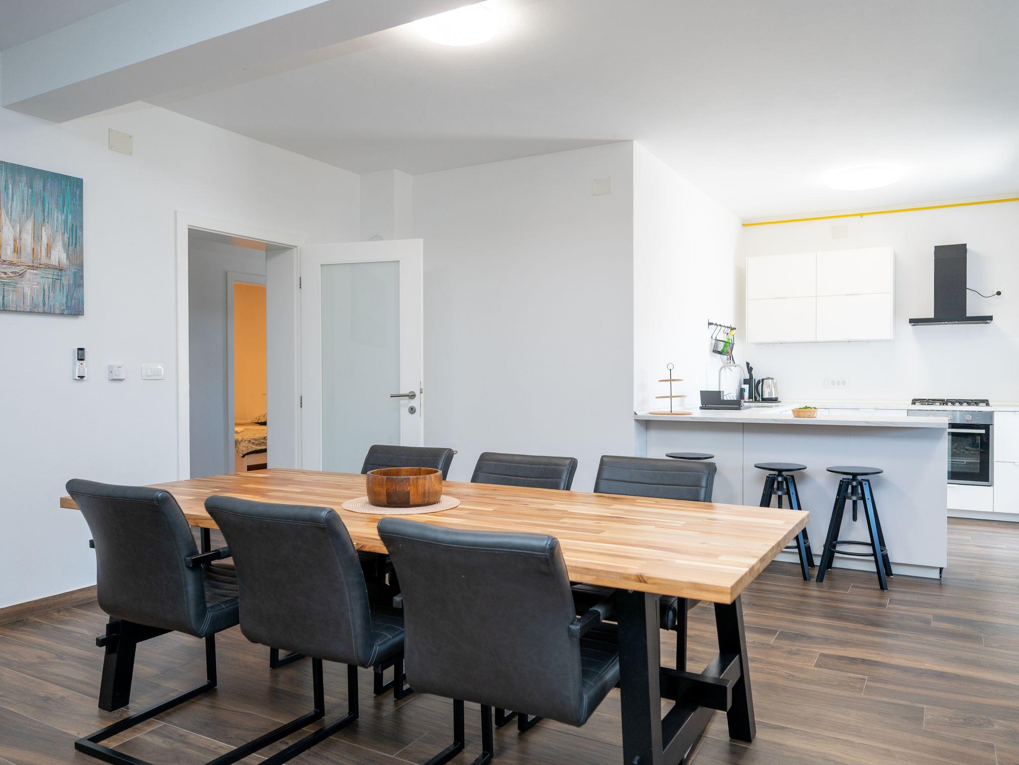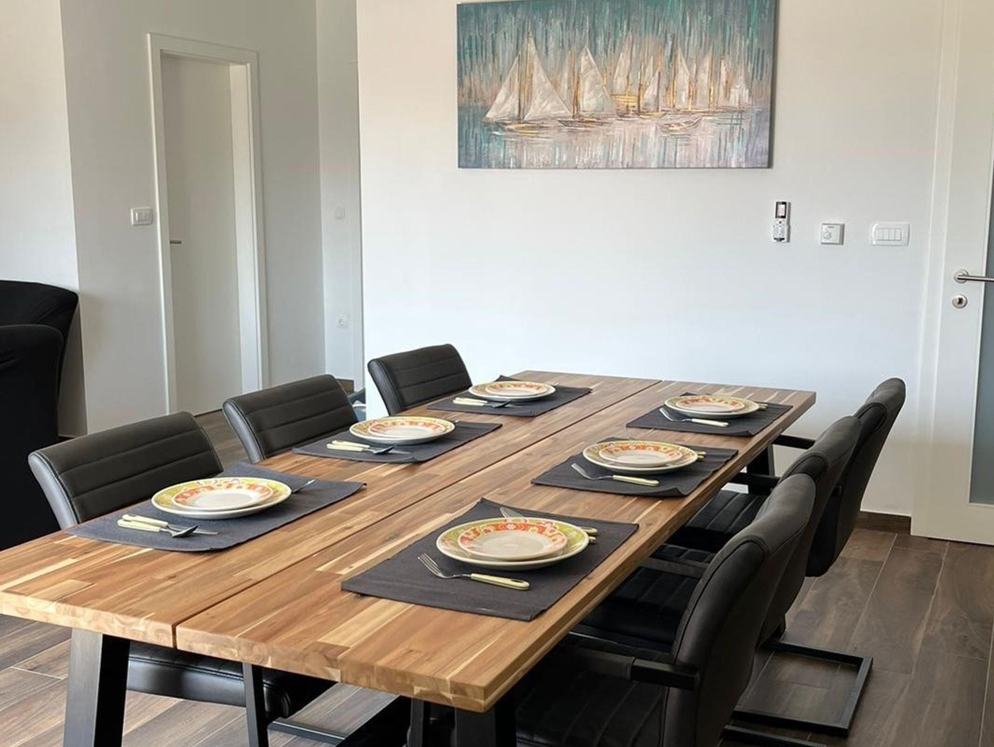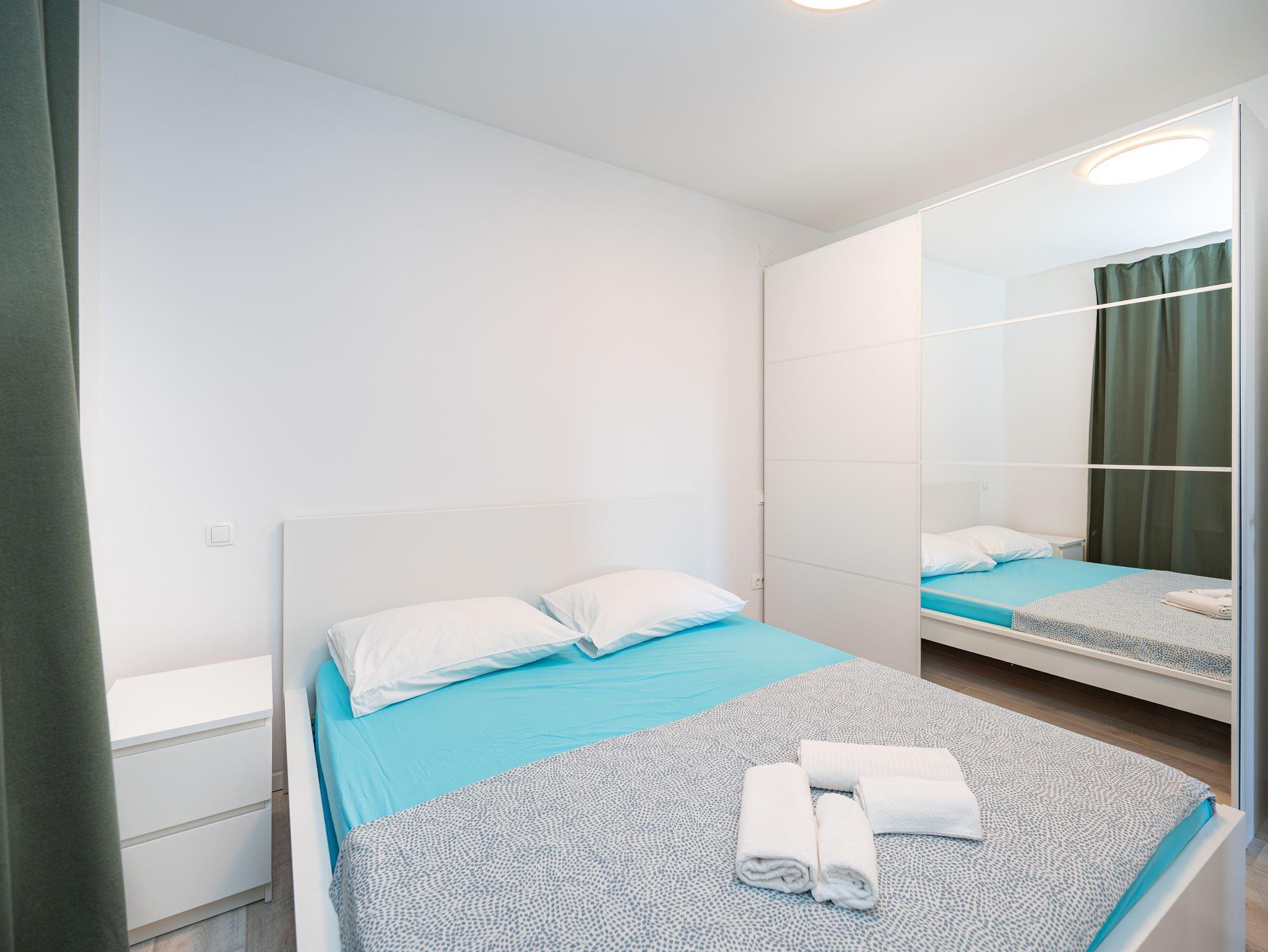 Ferienwohnung bietet Platz für 8 Gäste. Die Betten sind in Schlafzimmern, die es 3 gibt, und in Wohnzimmer, innerhalb einer Gesamtfläche von 86m2, angeordnet. Die Gäste haben eine eigene Terrasse zur Verfügung, auf der sie in warmen Sommernächten genießen können. Es ist erlaubt, Speisen auf dem Gemeinschafts-Grill vorzubereiten. IM PREIS INBEGRIFFEN: Kurtaxe, Endreinigung, Klimatisierung, Parkplatz, Internet, Kinderbett, Föhn. VERBINDLICHE ZUSÄTZLICHE KOSTEN: Aufzahlung für Kurzaufenthalte (prozentualer Zuschlag pro Nächtigungsanzahl: 30% - 1, 20% - 2, 10% - 3). UNVERBINDLICHE ZUSÄTZLICHE KOSTEN: Zentralheizung (5,00 € pro Nacht). Die Verfügbarkeit zusätzlicher Dienstleistungen in Ihrem reservierten Termin und die Preise derselben (falls nicht aufgeführt) müssen im Voraus überprüft werden. Zusätzliche Dienstleistungen die in der Zahlungsaufforderung nicht aufgeführt sind werden direkt beim Vermieter bezahlt, angenommen der Gast nutzt auch diese. Ermäßigung auf den Grundpreis: Gratistag 14=13 (bei einem Aufenthalt von 14 Tagen oder mehr erhalten Sie einen Gratistag für den Aufenthalt bis 31.12.26).