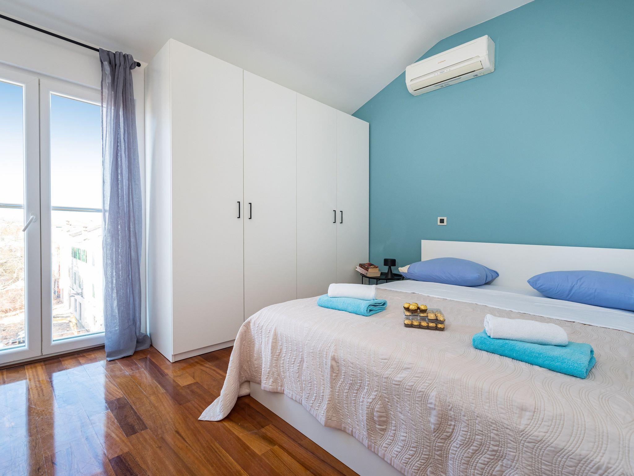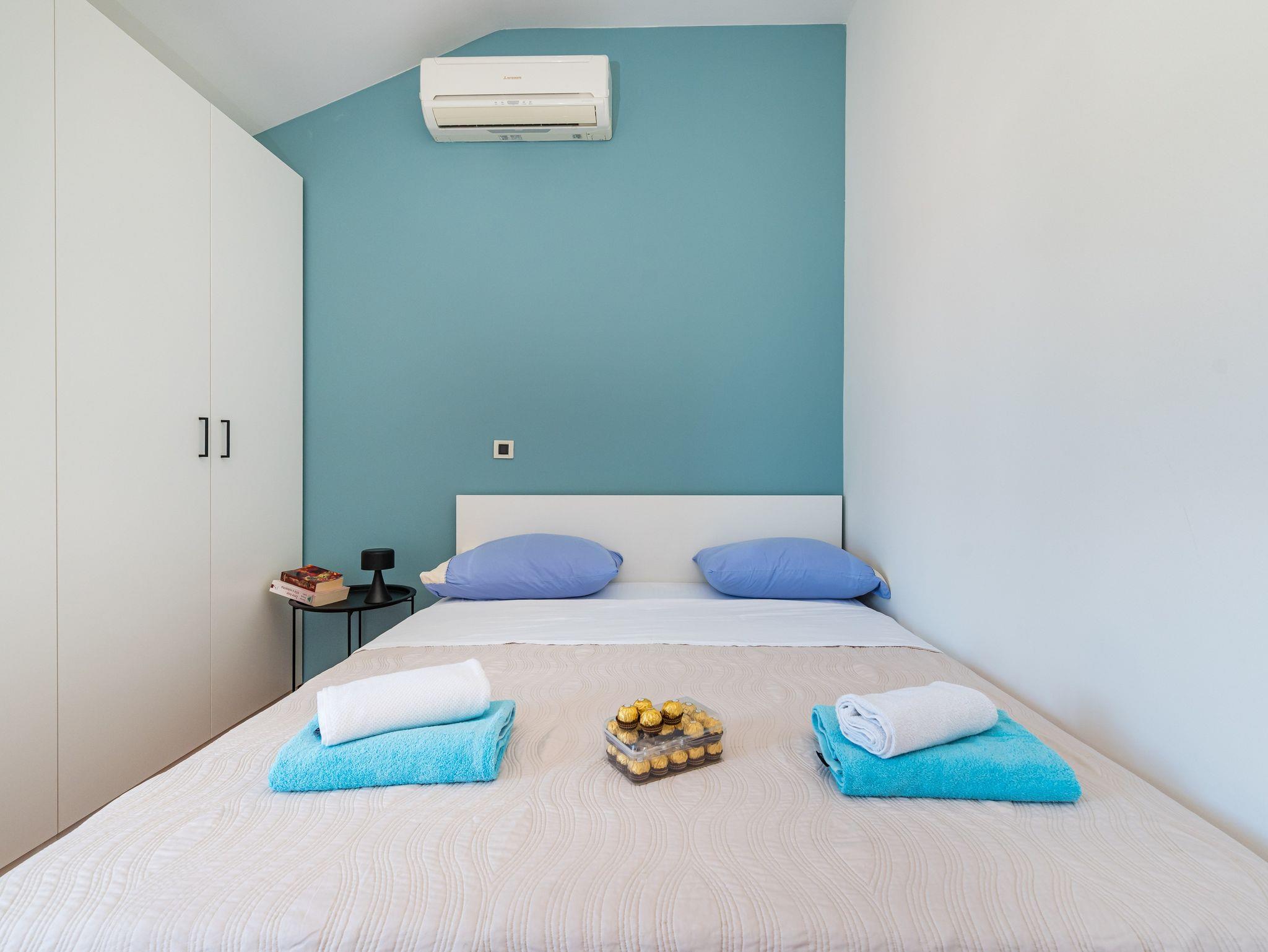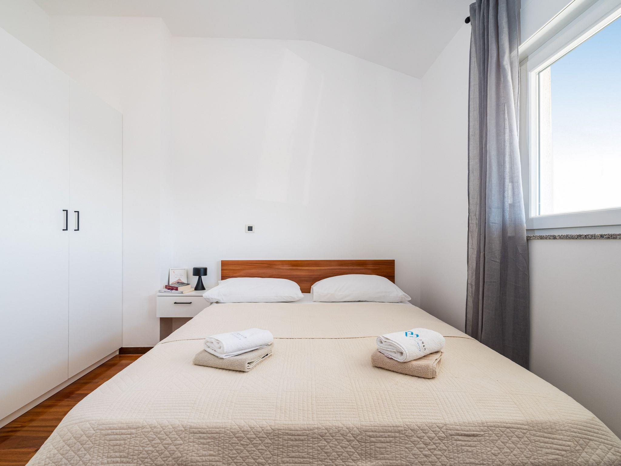 Ferienwohnung bietet Platz für 6 Gäste. Die Betten sind in Schlafzimmern, die es 2 gibt, und in Wohnzimmer, innerhalb einer Gesamtfläche von 46m2, angeordnet. Die Gäste haben einen eigenen Balkon zur Verfügung, auf der sie in warmen Sommernächten genießen können. Das Apartment bietet Meerblick. IM PREIS INBEGRIFFEN: Kurtaxe, Endreinigung, Klimatisierung, Parkplatz, Internet, Bügeleisen, Bügelbrett, Föhn. Die Verfügbarkeit zusätzlicher Dienstleistungen in Ihrem reservierten Termin und die Preise derselben (falls nicht aufgeführt) müssen im Voraus überprüft werden. Zusätzliche Dienstleistungen die in der Zahlungsaufforderung nicht aufgeführt sind werden direkt beim Vermieter bezahlt, angenommen der Gast nutzt auch diese.