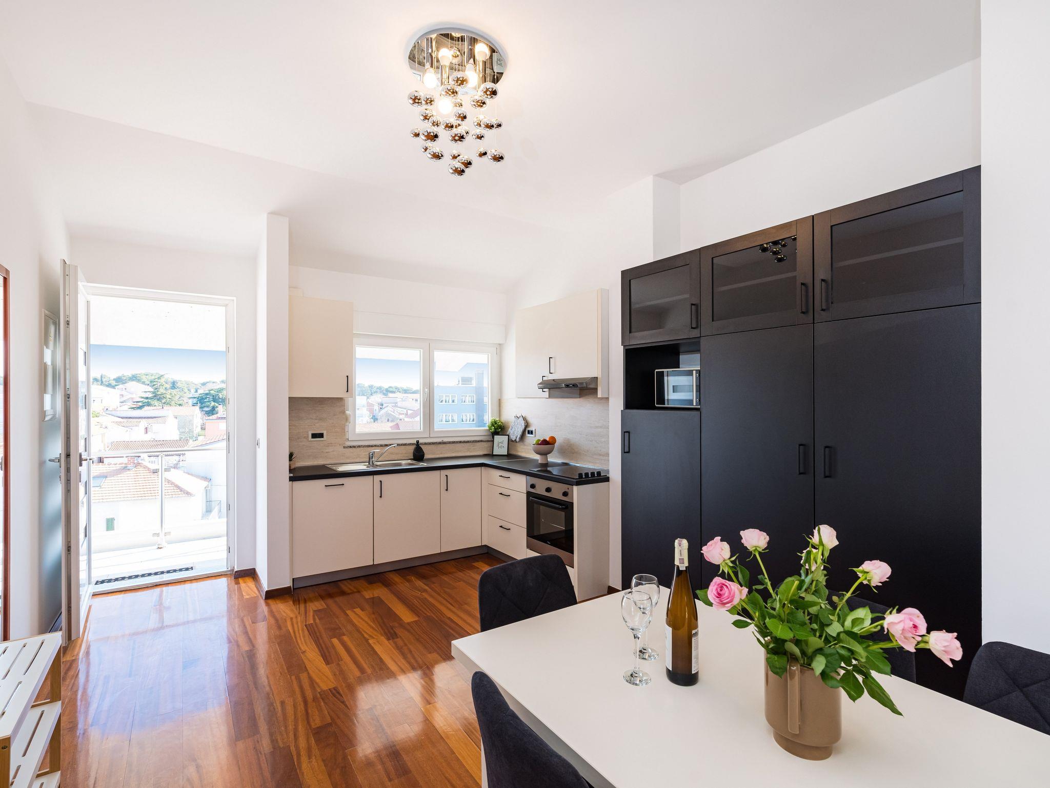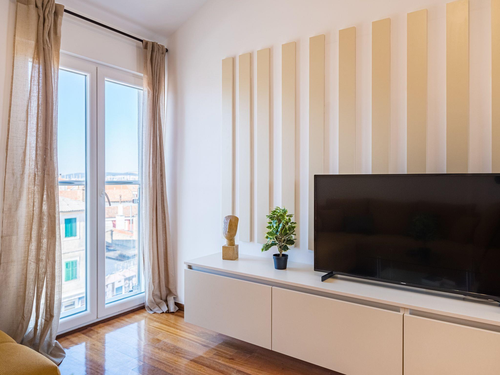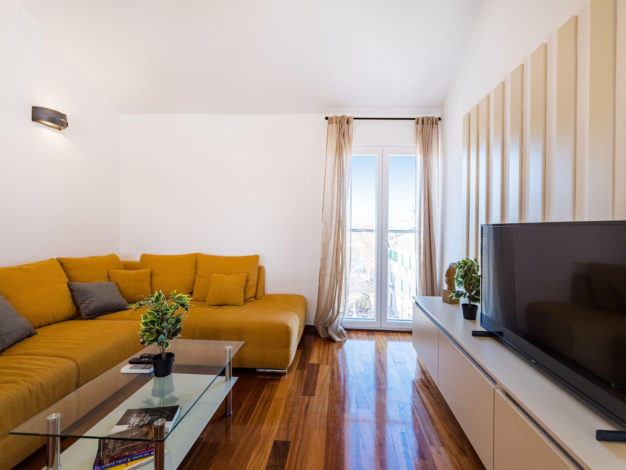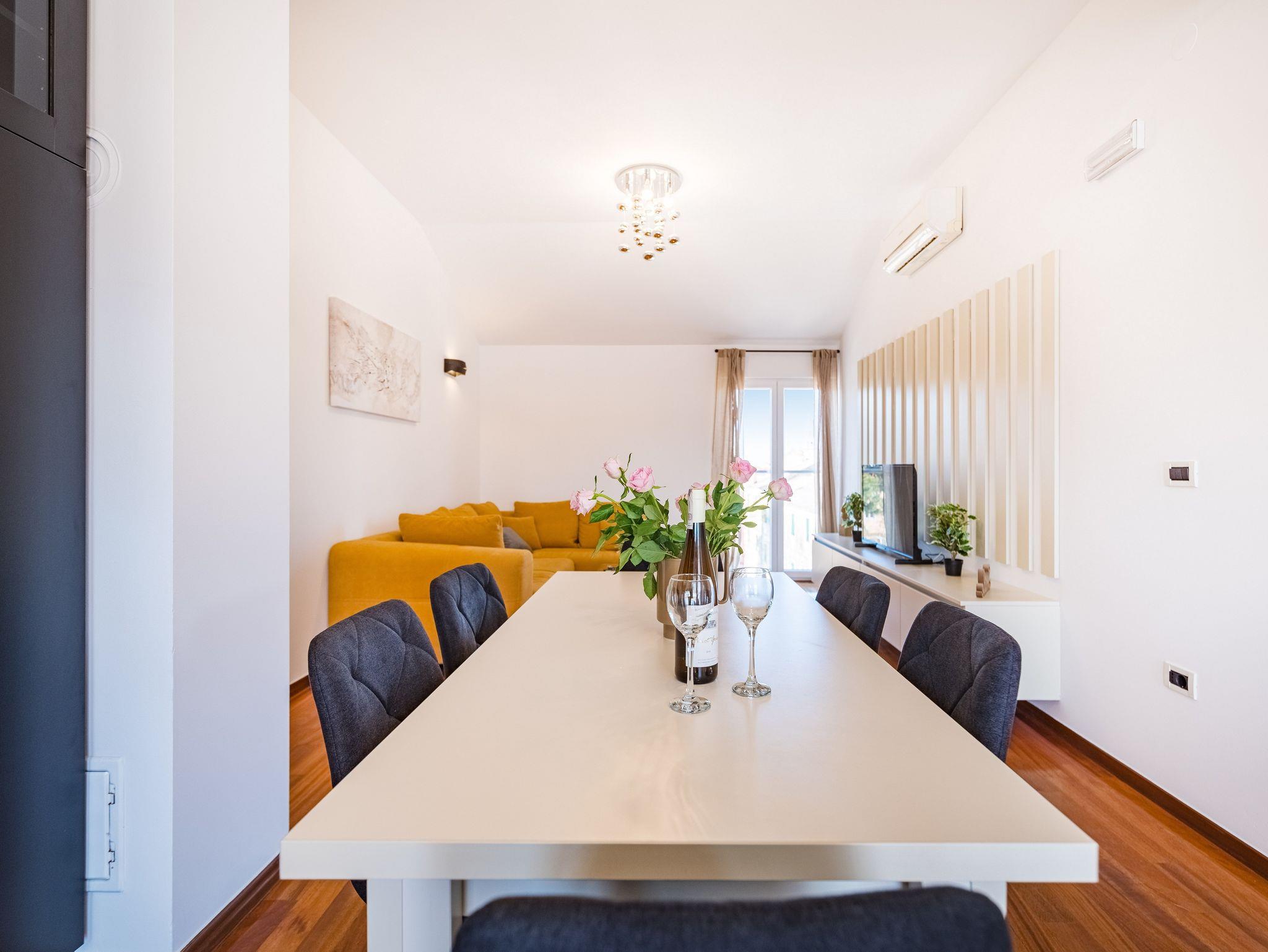 Ferienwohnung bietet Platz für 6 Gäste. Die Betten sind in Schlafzimmern, die es 2 gibt, und in Wohnzimmer, innerhalb einer Gesamtfläche von 46m2, angeordnet. Die Gäste haben einen eigenen Balkon zur Verfügung, auf der sie in warmen Sommernächten genießen können. Das Apartment bietet Meerblick. IM PREIS INBEGRIFFEN: Kurtaxe, Endreinigung, Klimatisierung, Parkplatz, Internet, Bügeleisen, Bügelbrett, Föhn. Die Verfügbarkeit zusätzlicher Dienstleistungen in Ihrem reservierten Termin und die Preise derselben (falls nicht aufgeführt) müssen im Voraus überprüft werden. Zusätzliche Dienstleistungen die in der Zahlungsaufforderung nicht aufgeführt sind werden direkt beim Vermieter bezahlt, angenommen der Gast nutzt auch diese.