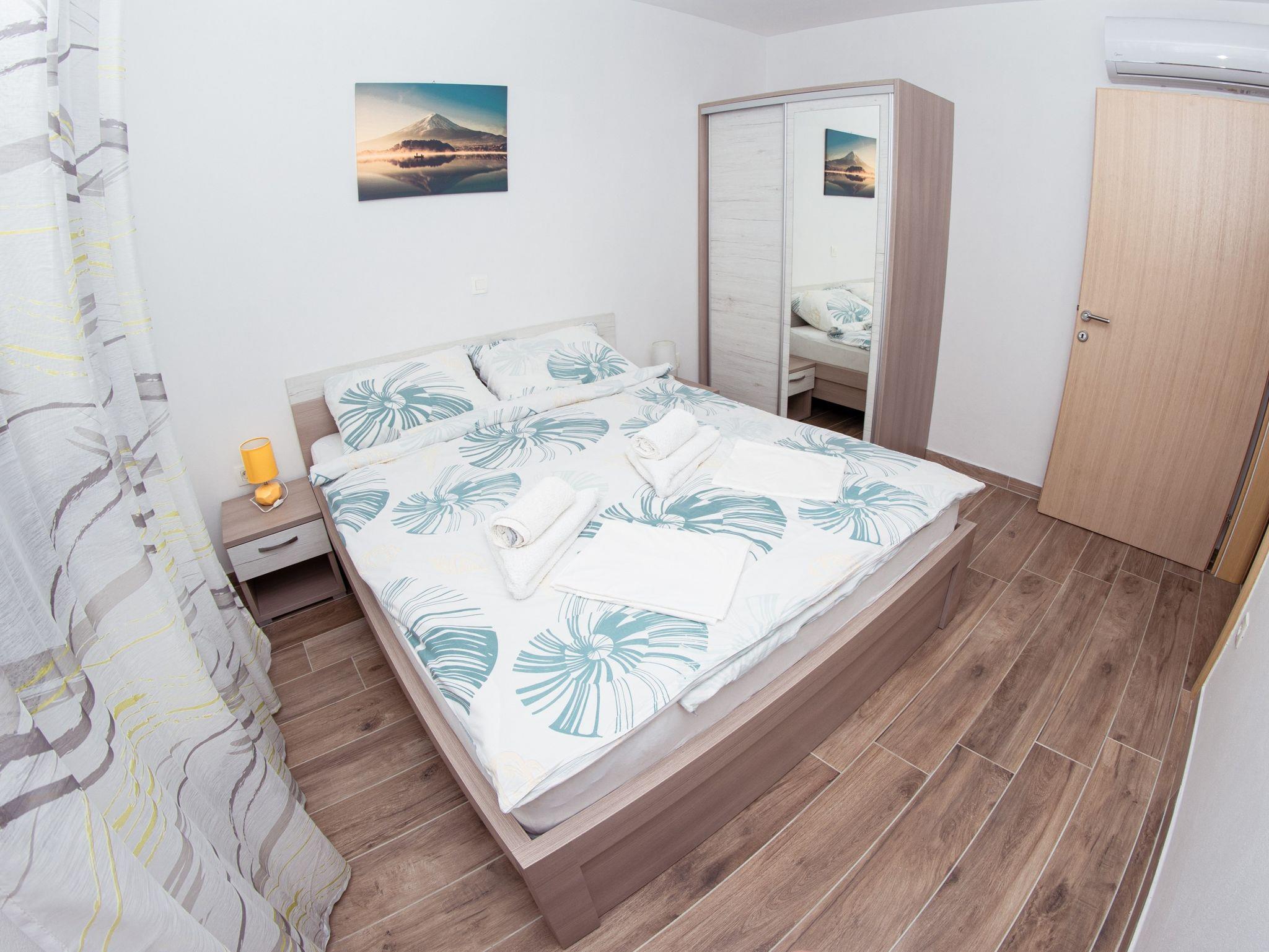 Ferienwohnung bietet Platz für 4 Gäste. Die Betten sind in Schlafzimmern, die es 1 gibt, und in Wohnzimmer, innerhalb einer Gesamtfläche von 38m2, angeordnet. Die Gäste haben einen eigenen Balkon zur Verfügung, auf der sie in warmen Sommernächten genießen können. Während ihres Aufenthalts können Gäste das gemeinsam zur Nutzung stehende Schwimmbad benutzen. IM PREIS INBEGRIFFEN: Kurtaxe, Endreinigung, Klimatisierung, Pool, Parkplatz, Internet. Die Verfügbarkeit zusätzlicher Dienstleistungen in Ihrem reservierten Termin und die Preise derselben (falls nicht aufgeführt) müssen im Voraus überprüft werden. Zusätzliche Dienstleistungen die in der Zahlungsaufforderung nicht aufgeführt sind werden direkt beim Vermieter bezahlt, angenommen der Gast nutzt auch diese. Ermäßigung auf den Grundpreis: Gratistag 14=13 (bei einem Aufenthalt von 14 Tagen oder mehr erhalten Sie einen Gratistag für den Aufenthalt bis 31.12.26).