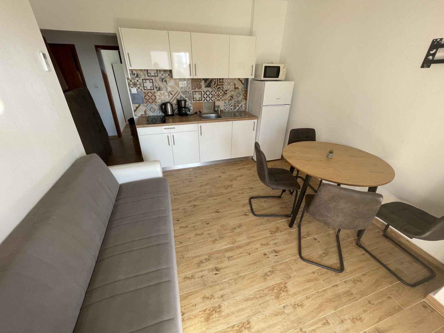 Die Wohnung umfasst ein Wohnzimmer mit kleinem Essbereich, eine Schlafcouch für zwei Personen sowie eine moderne Küchenzeile. Es gibt ein Schlafzimmer mit einem Doppelbett sowie ein Duschbad. Eine Klimaanlage ist vorhanden. Entspannen Sie auf dem überdachten Balkon mit seitlichem Meerblick!