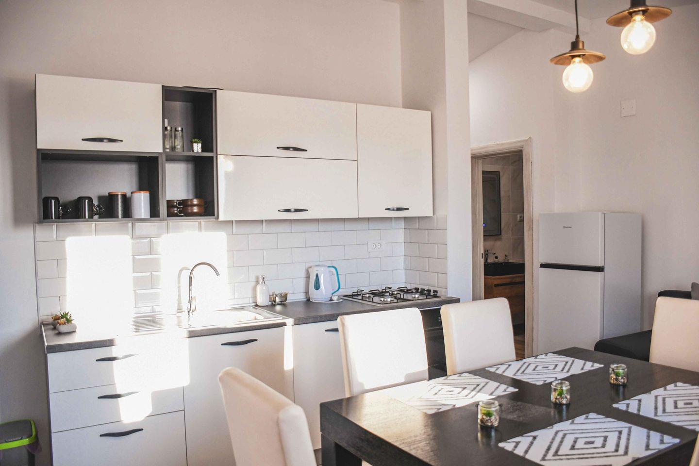 Die gut ausgestattete Küche verfügt über ein Kochfeld, einen Kühlschrank, einen Geschirrspüler und sämtliche benötigten Küchenutensilien. Für gemütliche Abende steht Ihnen außerdem ein Grill zur Verfügung.