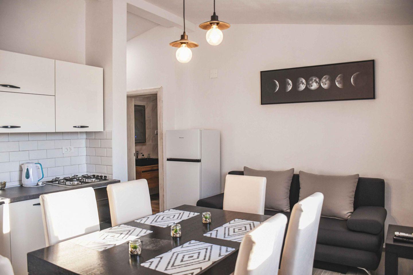 Komfortables, klimatisiertes Apartment mit zwei Schlafzimmern, Wohnzimmer mit Schlafsofa, voll ausgestatteter Küche und modernem Bad mit ebenerdiger Dusche. Eigener Eingang, Grill, Flachbild-TV mit Streamingdiensten, schallisolierte Wände und Gartenblick. Highlight: der Pool mit traumhafter Aussicht – ideal für entspannte Urlaubstage.