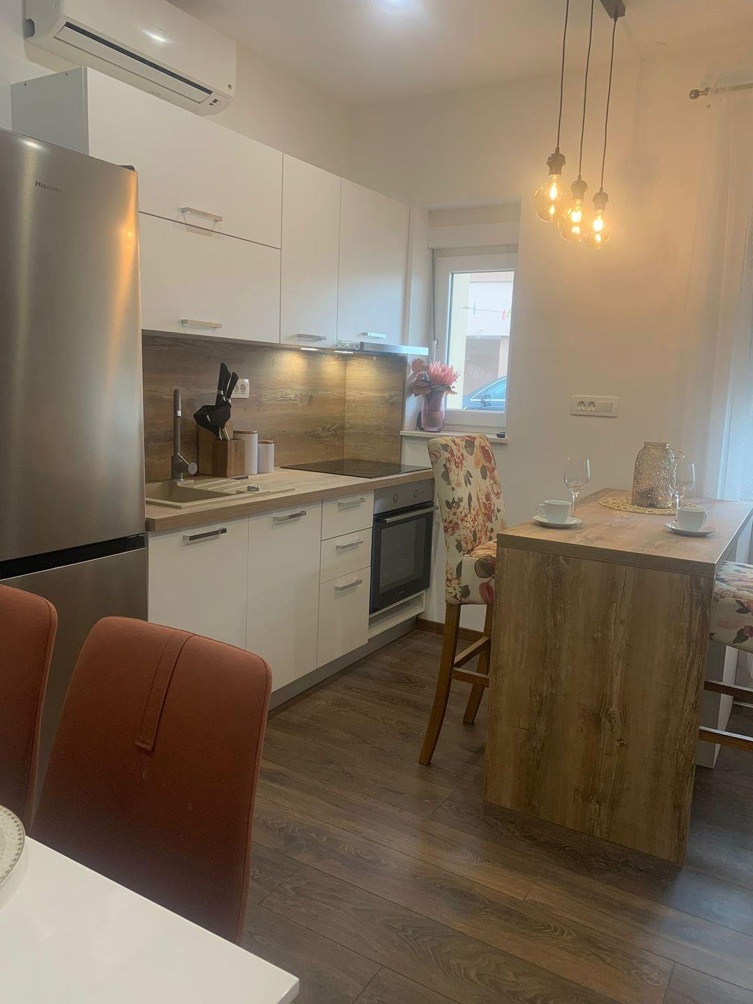 Der offene Wohn- und Essbereich ist stilvoll gestaltet: Ein Tresen mit zwei Barhockern lädt zum Frühstück oder einem Glas Wein ein, und der zusätzliche Esstisch bietet Platz für bis zu vier Personen. Die voll ausgestattete Küche verfügt über alles, was Sie zum Kochen brauchen – ideal für gemeinsame Mahlzeiten.