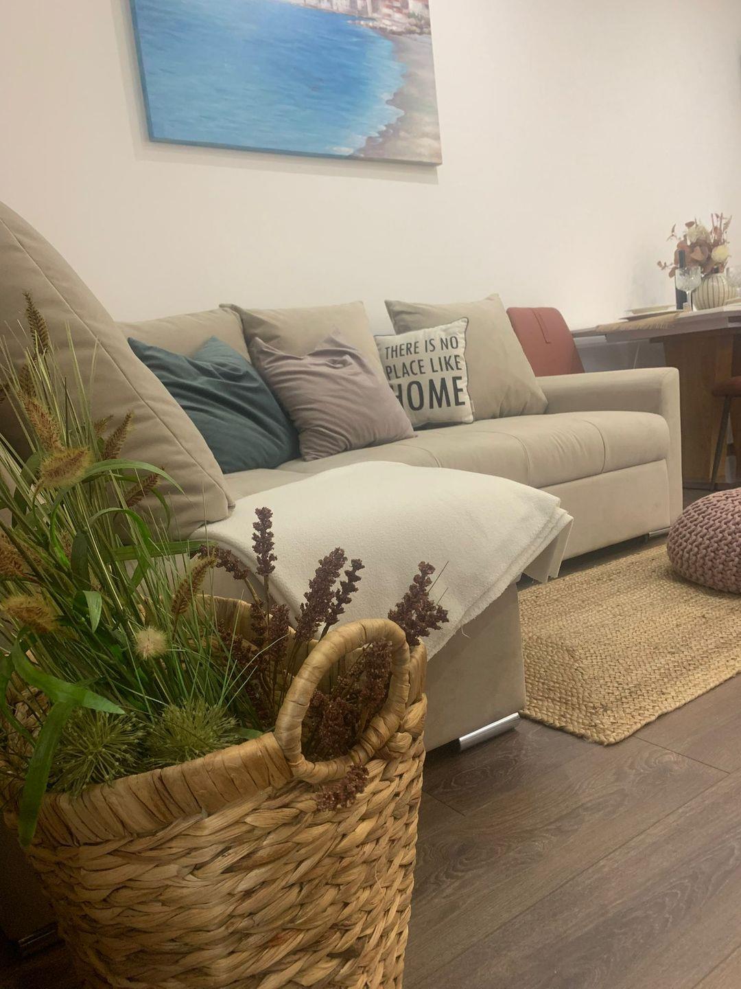 In der gemütlichen Sofaecke mit TV können Sie entspannte Stunden verbringen – ob mit einem Film, einem Buch oder einfach zum Abschalten.