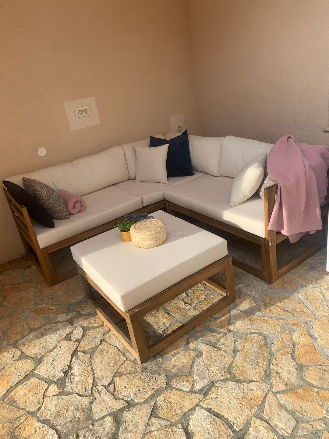 1 Schlafzimmer mit Doppelbett, Wohnbereich mit Schlafcouch, offener Wohn-Essbereich mit Tresen und zusätzlichem Esstisch. Voll ausgestattete Küche, Sofaecke mit TV. Bad mit Fenster, Dusche, Waschtisch, Spiegel und Waschmaschine. Ideal für Paare oder Familien – ruhig gelegen mit eigener Terrasse.