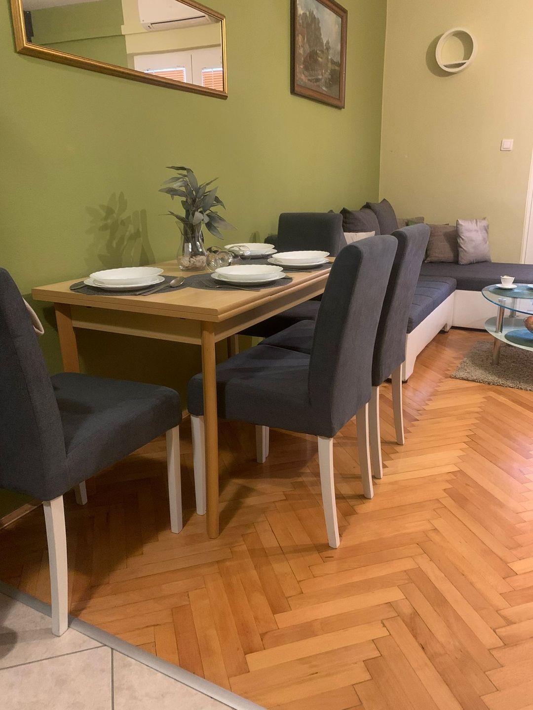 Der offene Wohn- und Essbereich wurde mit viel Gespür für Funktionalität und Behaglichkeit gestaltet. Es steht Ihnen ein Esstisch für bis zu vier Personen zur Verfügung – ideal für gemeinsame Mahlzeiten. Die voll ausgestattete Küche bietet neben einem Kühlschrank und Spüle auch zwei Elektroplatten und zwei Gaskochfelder, damit Sie jederzeit flexibel kochen können.
