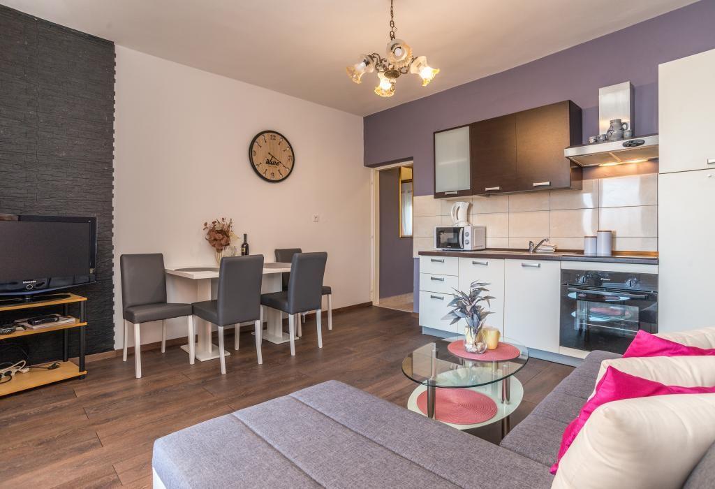 Der offene Wohn- und Essbereich lädt zum Verweilen ein: In der Sofaecke mit TV entspannen Sie nach einem erlebnisreichen Tag, während der Esstisch mit vier Stühlen Raum für gemeinsame Mahlzeiten bietet. Das Schlafsofa lässt sich bei Bedarf ausziehen und schafft zwei weitere bequeme Schlafplätze.