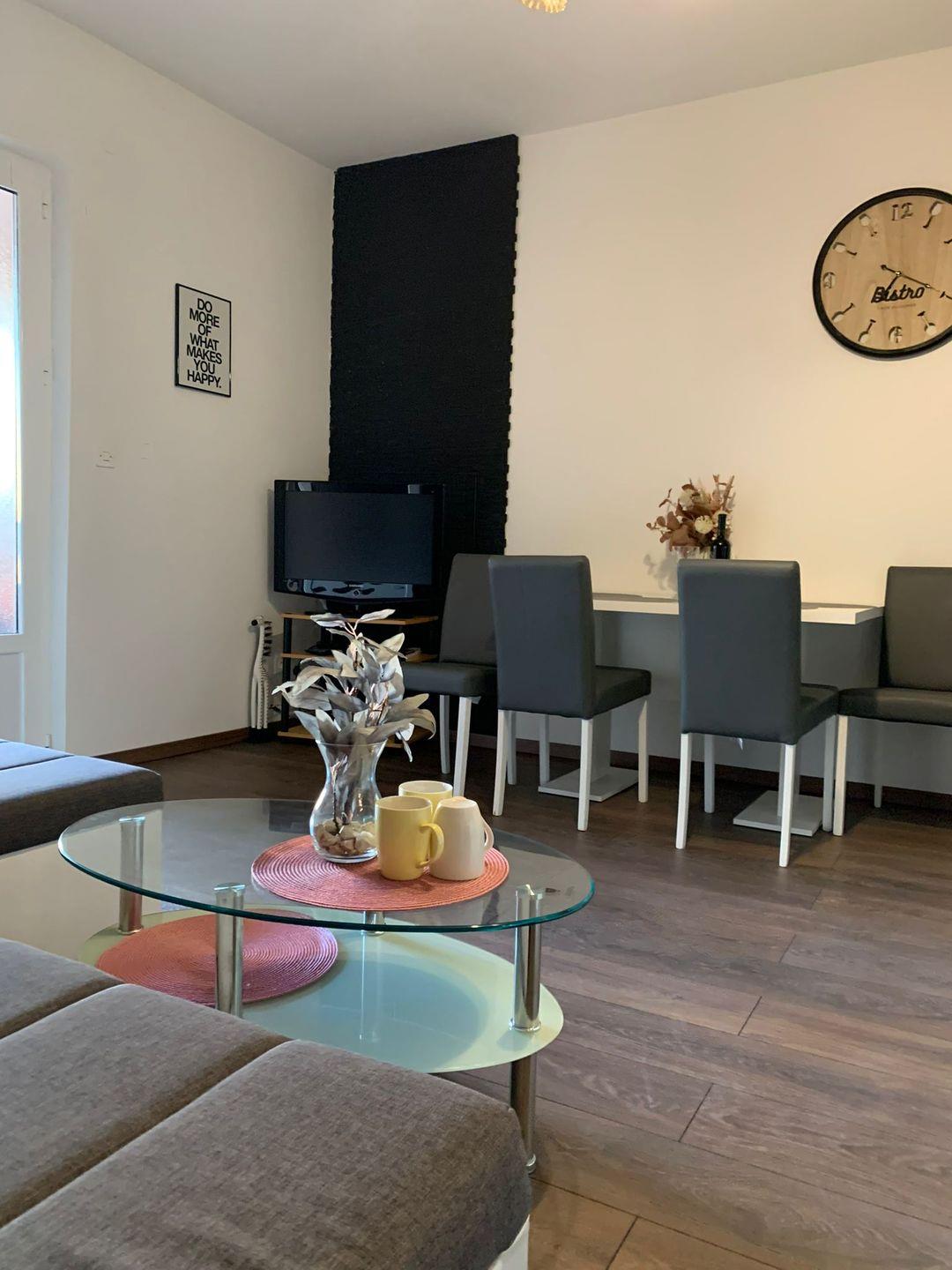 Schlafzimmer mit Doppelbett, Schrank und kleinem Sofa. Offener Wohn-Essbereich mit voll ausgestatteter Küche, Esstisch, TV und ausziehbarem Sofa für zwei weitere Gäste. Modernes Bad mit Dusche, WC und Waschbecken. Überdachte, möblierte Terrasse für entspannte Stunden im Freien. Ideal für Paare, Familien oder Freunde.