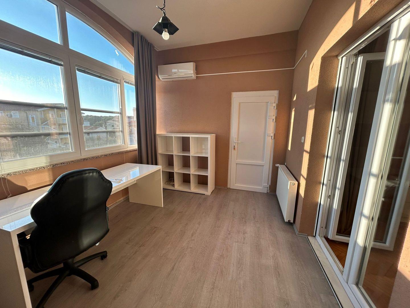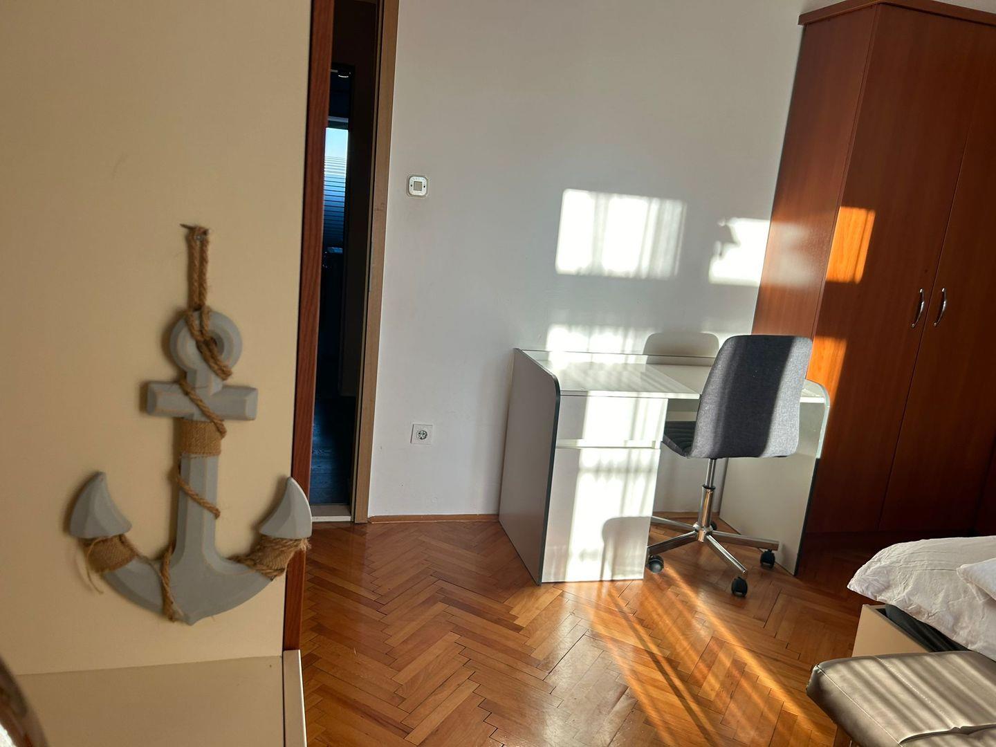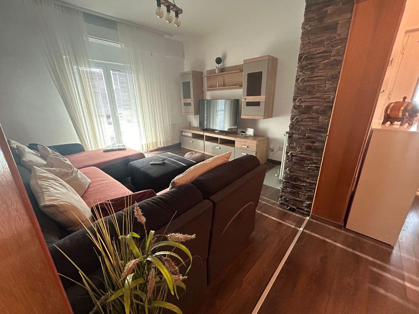 Zwei Schlafzimmer (1× Doppelbett, 1× zwei Einzelbetten), zusätzliches Arbeitszimmer mit Schreibtisch. Offene, voll ausgestattete Küche mit Esstisch und TV. Wohnzimmer mit Sofaecke, TV und ausziehbarem Schlafsofa für zwei weitere Gäste. Modernes Bad mit Dusche, WC, Waschbecken und Waschmaschine. Möblierte Terrasse für entspannte Stunden im Freien – perfekt für Familien, Freunde