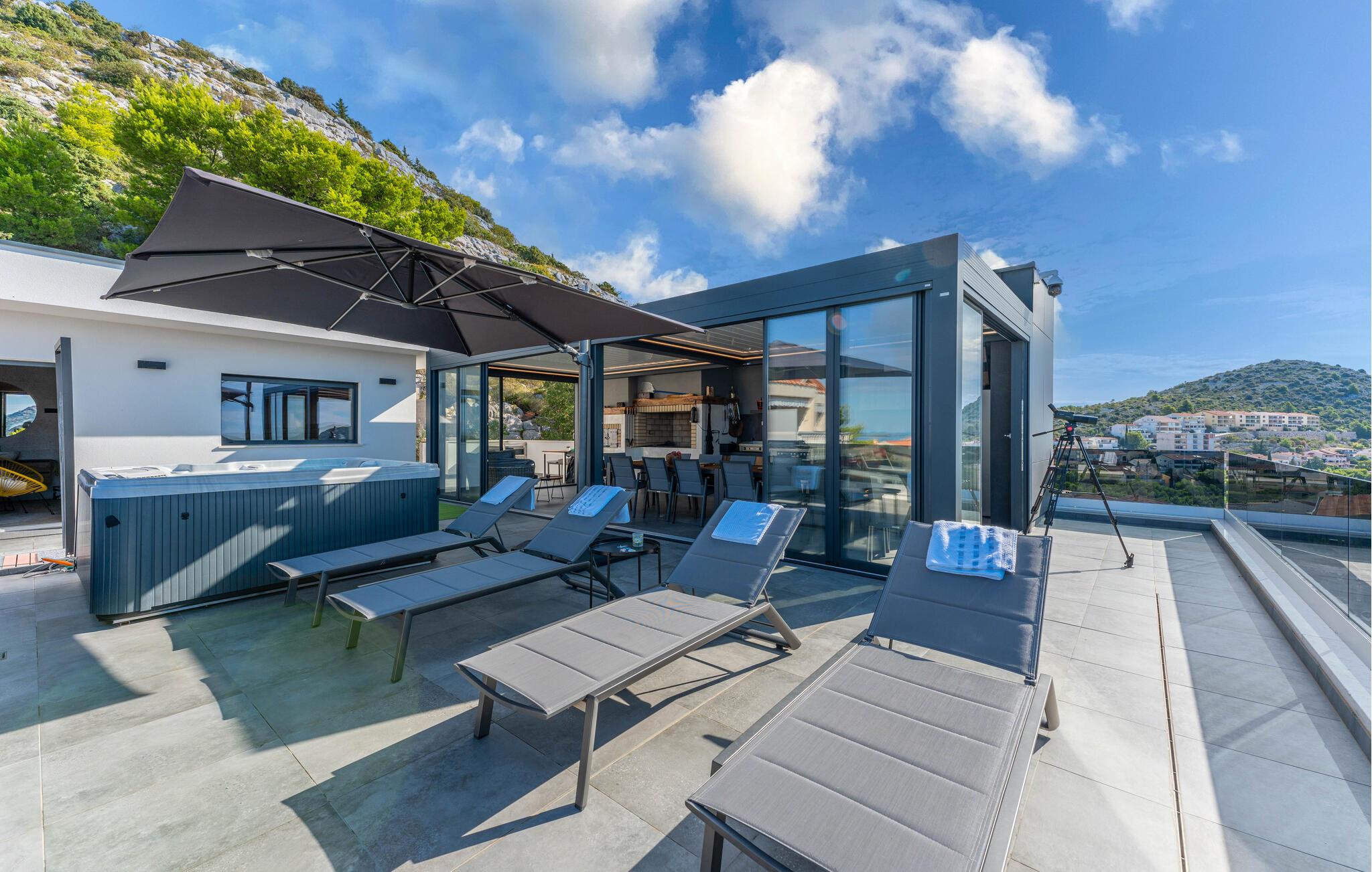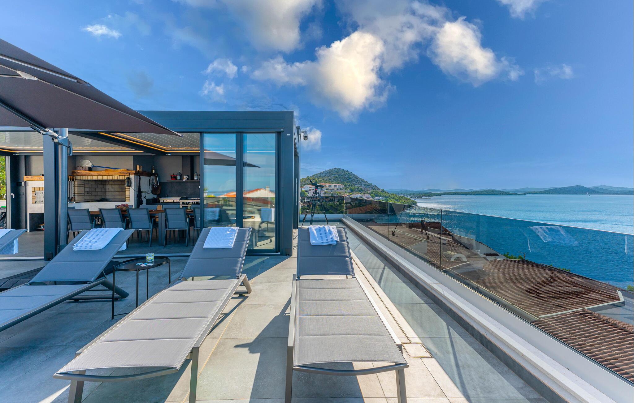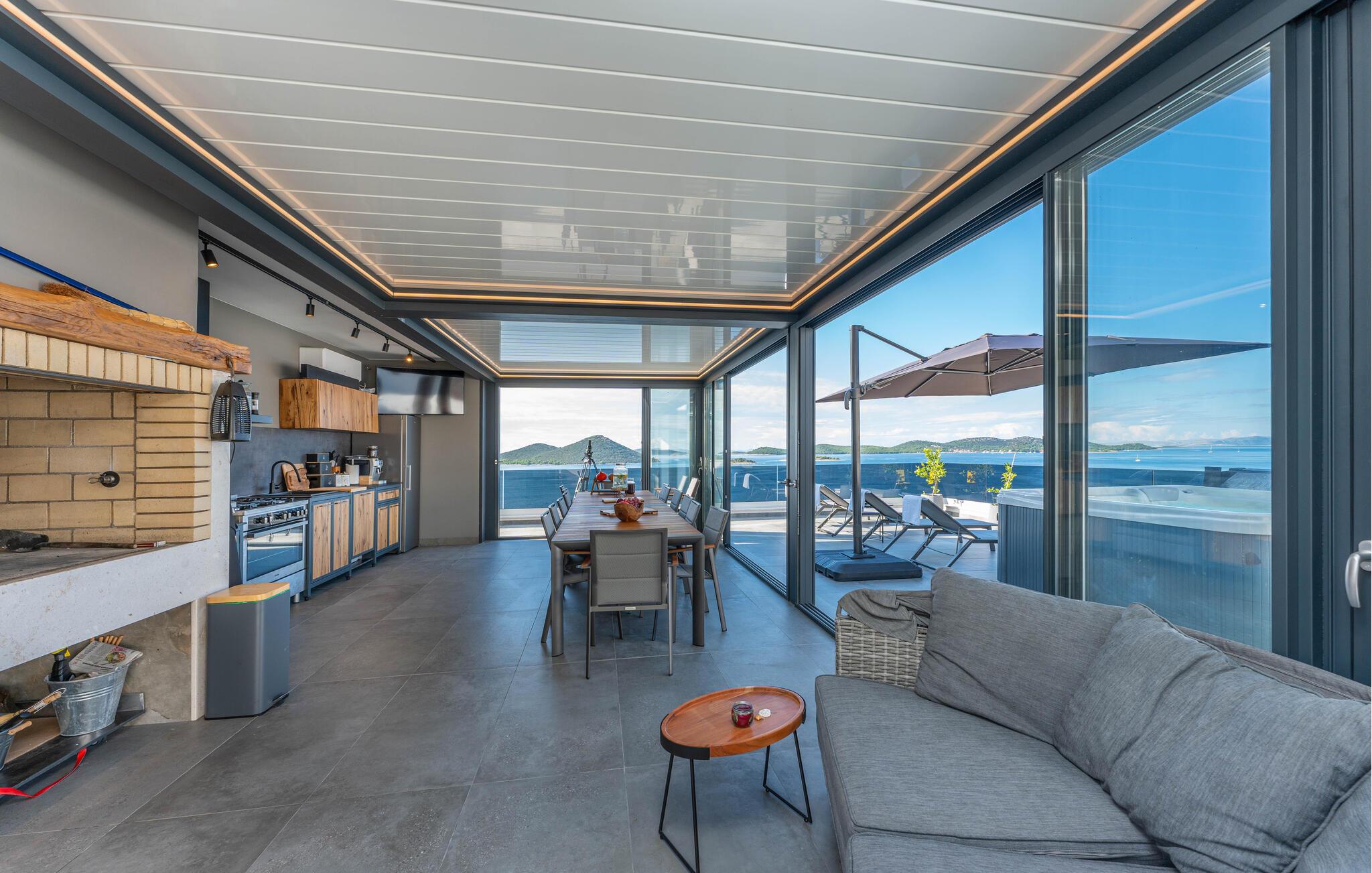 Tilbring dejlige timer udendørs; terrassen lægger op til at nyde solen og kolde drikkevarer, mens I kigger langt ud over det blå hav. Et fælles spabad, sauna og udendørskøkken venter jer på den fantastiske fælles tagterrasse.