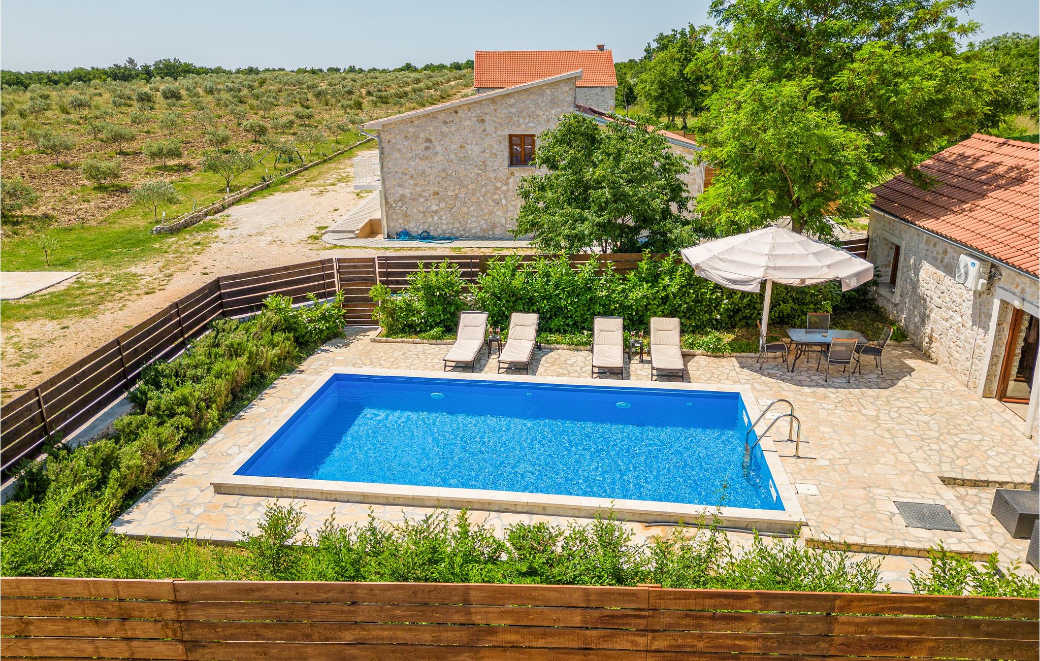 Denne fantastiske feriebolig er bygget i sten, ligger i grønne omgivelser nær en økoby, på en indhegnet grund og er delt op i to huse. Hele boligen har gennemgået en modernisering og er meget velplejet og indbydende både ude og inde. I det mindste hus er der et åbent køkken mod stuen, badeværelse og soveværelse, mens der i det større hus er et køkken der er åbent mod stuen, tre soveværelser og to badeværelser. I husenes gård, ca. 5 m væk, er jeres helt private pool. I økobyen, nær de store marker, er der et stort lysthus, til fælles brug. Nærmeste by er Biograd, kendt for sine to marinaer. Det kan også godt betale sig at opleve Zadar med gammel bydel og naturparken Vranasøen med sine tusinder af fugle.