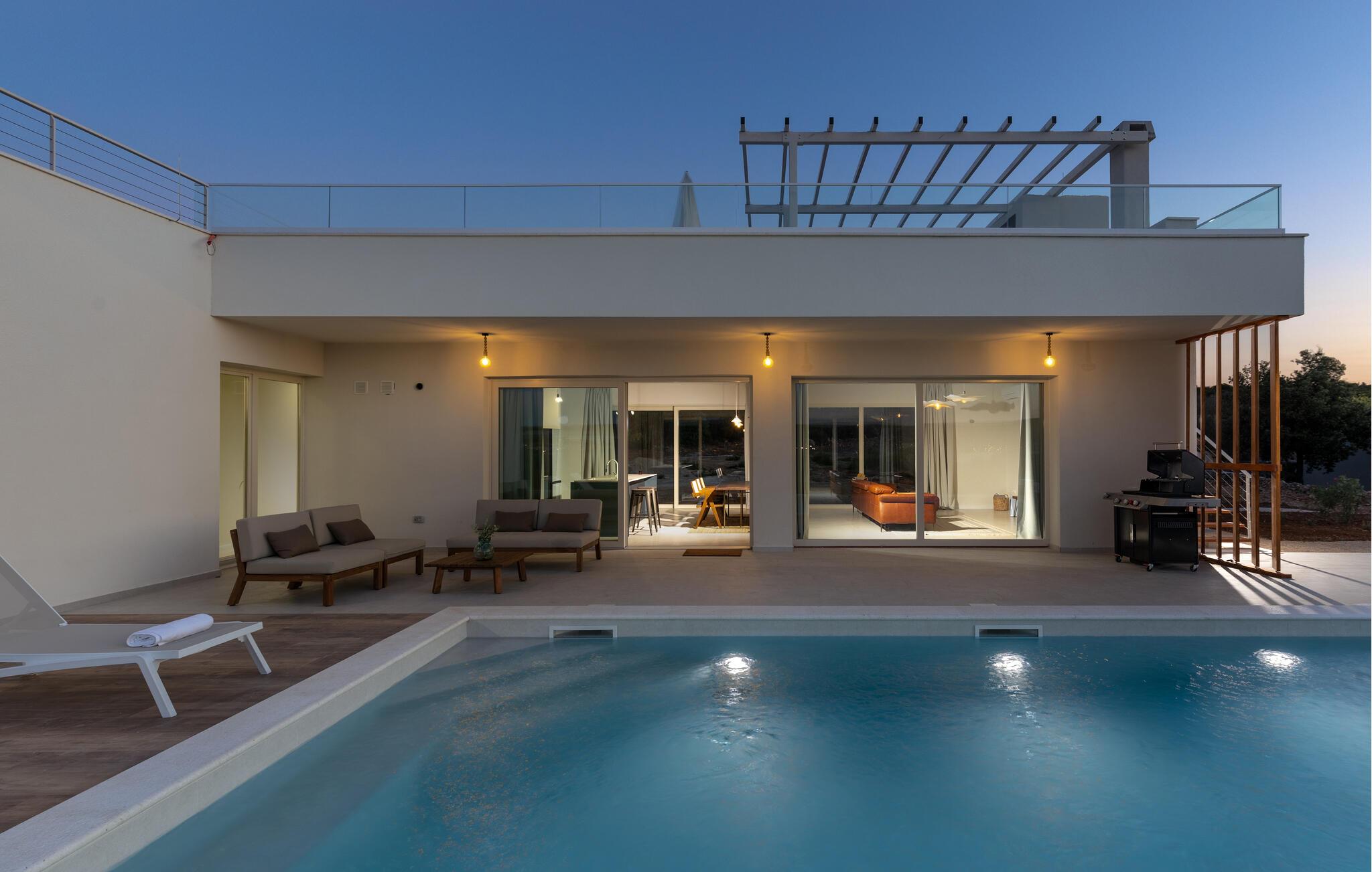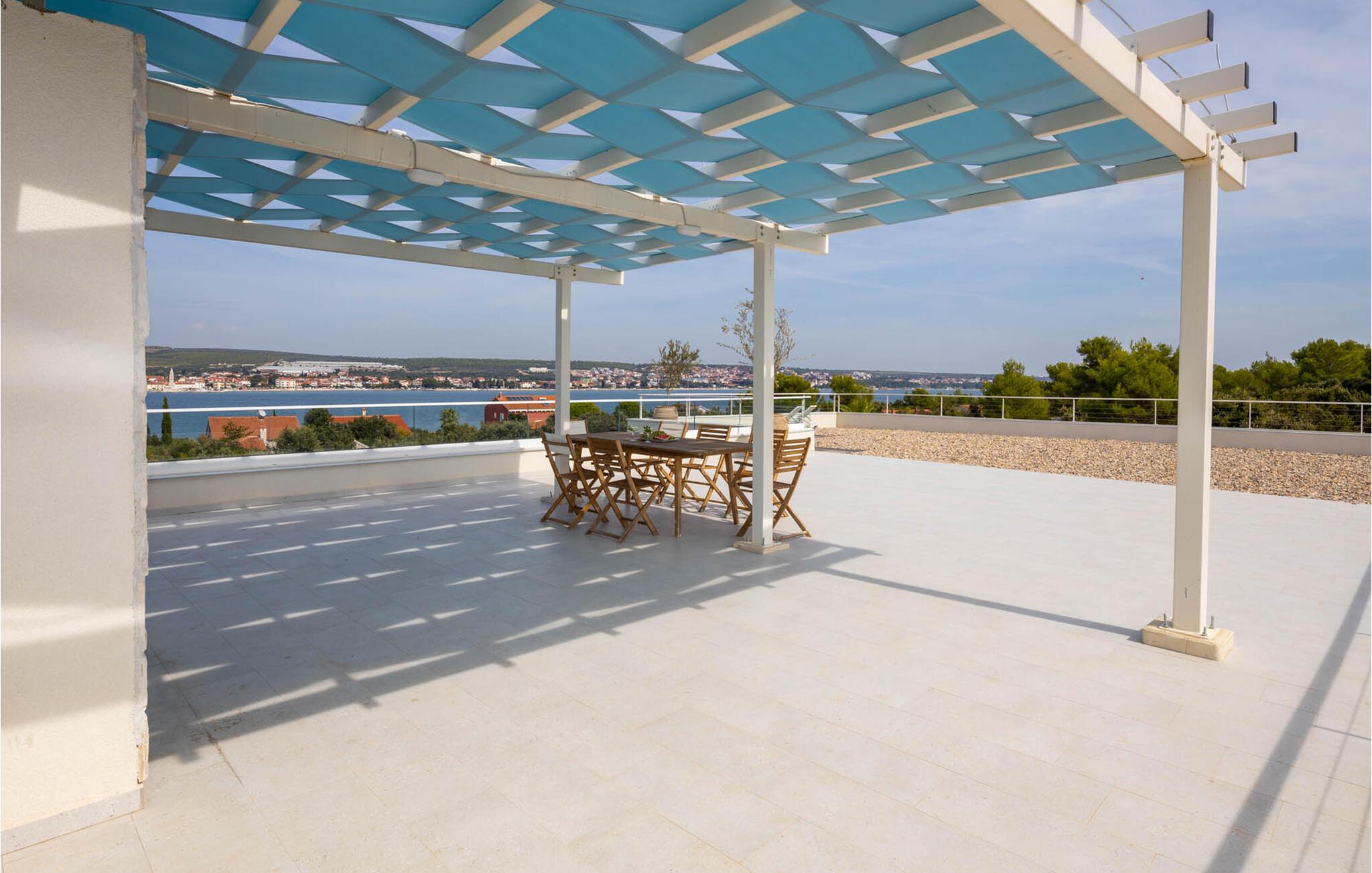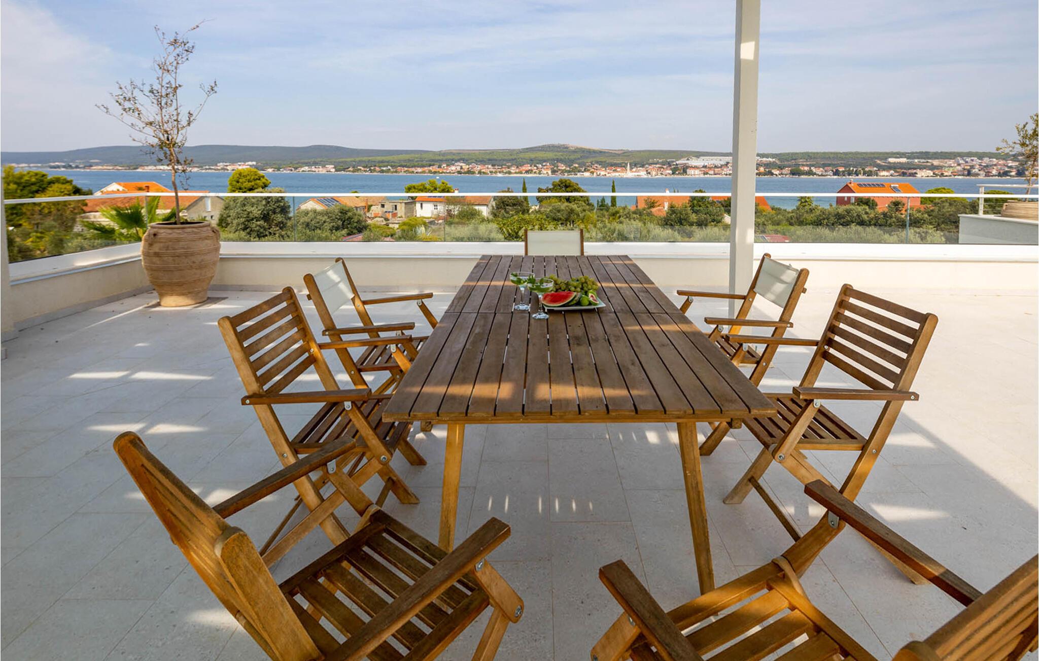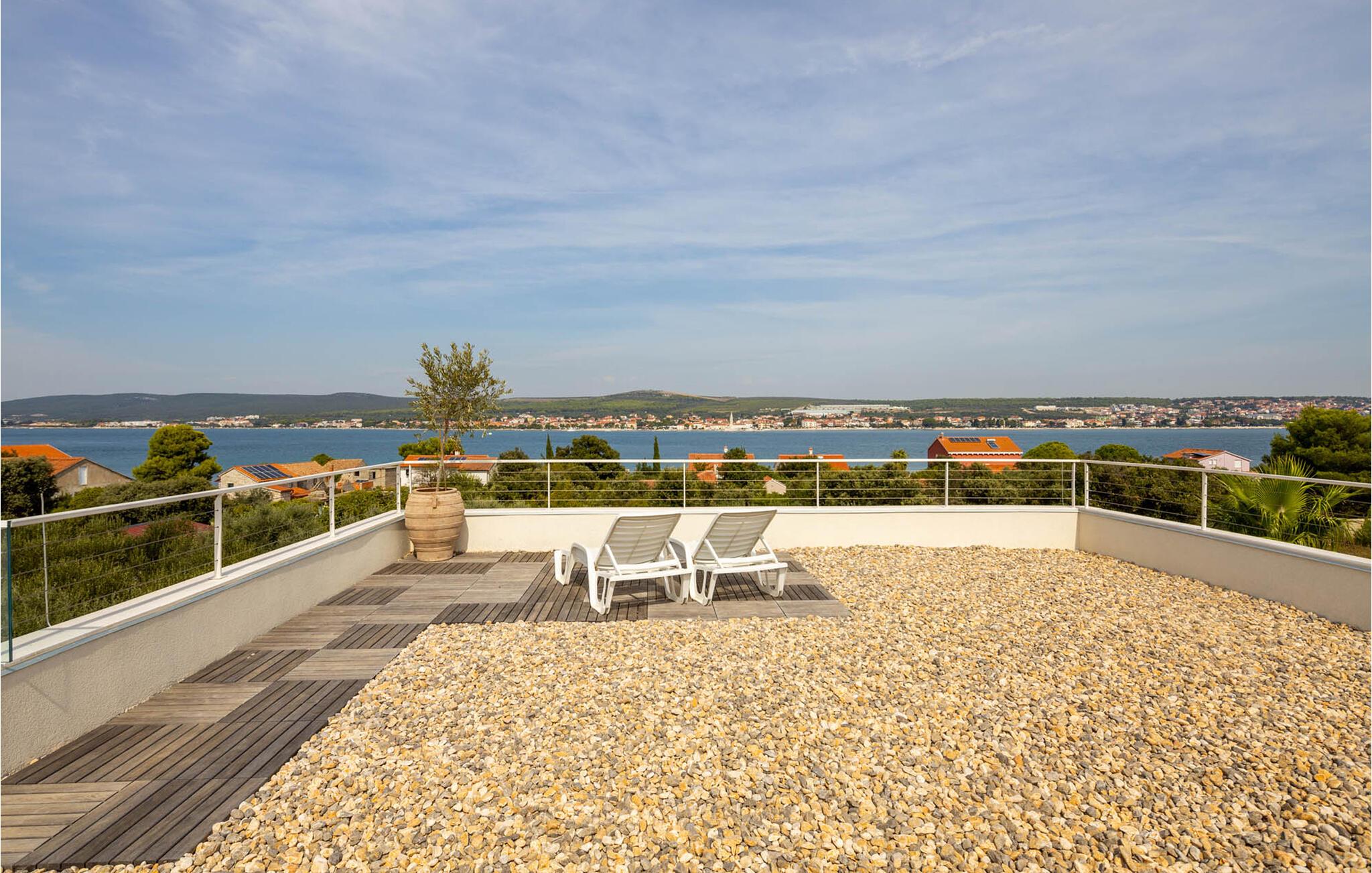 "Villa Santa Lucia ligger på øen Babac, som ligger mellem byen Biograd na Moru og øen Pašman. Øen Babac er den eneste beboede ø i øgruppen af ??16 øer ud for øen Pašman. Øen er den eneste beboede ø i øgruppen. er fuld af skjulte bugter og sandstrande og er ideel til en stille og fredelig ferie i 2022 i en moderne arkitektonisk stil, fra alle værelser udsigt over det klare Adriaterhav og tilbyder sine gæster 207 m2 boligareal, mens villaens samlede areal er på 780 m2 kan rumme maksimalt 8 personer I stueetagen kan du føle dig godt tilpas i stuen, som har en sofa, en lænestol og et tv, og børnene vil nyde PlayStation-spillekonsollen. Der er også et fuldt udstyret køkken og en spisestue bord til 8 personer. Du vil føle dig godt tilpas i 4 soveværelser, hvoraf 2 har en dobbeltseng og de resterende to har hver to enkeltsenge. Hvert soveværelse har sit eget badeværelse med bruser. Ovenpå finder du en 220 m² walk-out tagterrasse med en udendørs Weber gasgrill, et 8-sæders spisebord, liggestole og træningsudstyr. På den udendørs terrasse er der en opvarmet pool på 45 m2, 1,4 m dyb, som har massage som en ekstra funktionalitet. Du kan også solbade på de 8 liggestole. Andre faciliteter på Villa Santa Lucia omfatter en vaskemaskine, et strygejern og et separat toilet. Kommer børn med på ferie, kan du bruge et fodertrug og en babyseng. Ankommer du med egen båd, har du mulighed for at benytte bådpladsen. Vi tilbyder dig leje af en 8-meter båd MF 795 og en skipper til transport til kysten for sightseeing af øerne Pašman, Komornik og Galesnjak (en hjerteformet ø). Inkluderet i prisen: