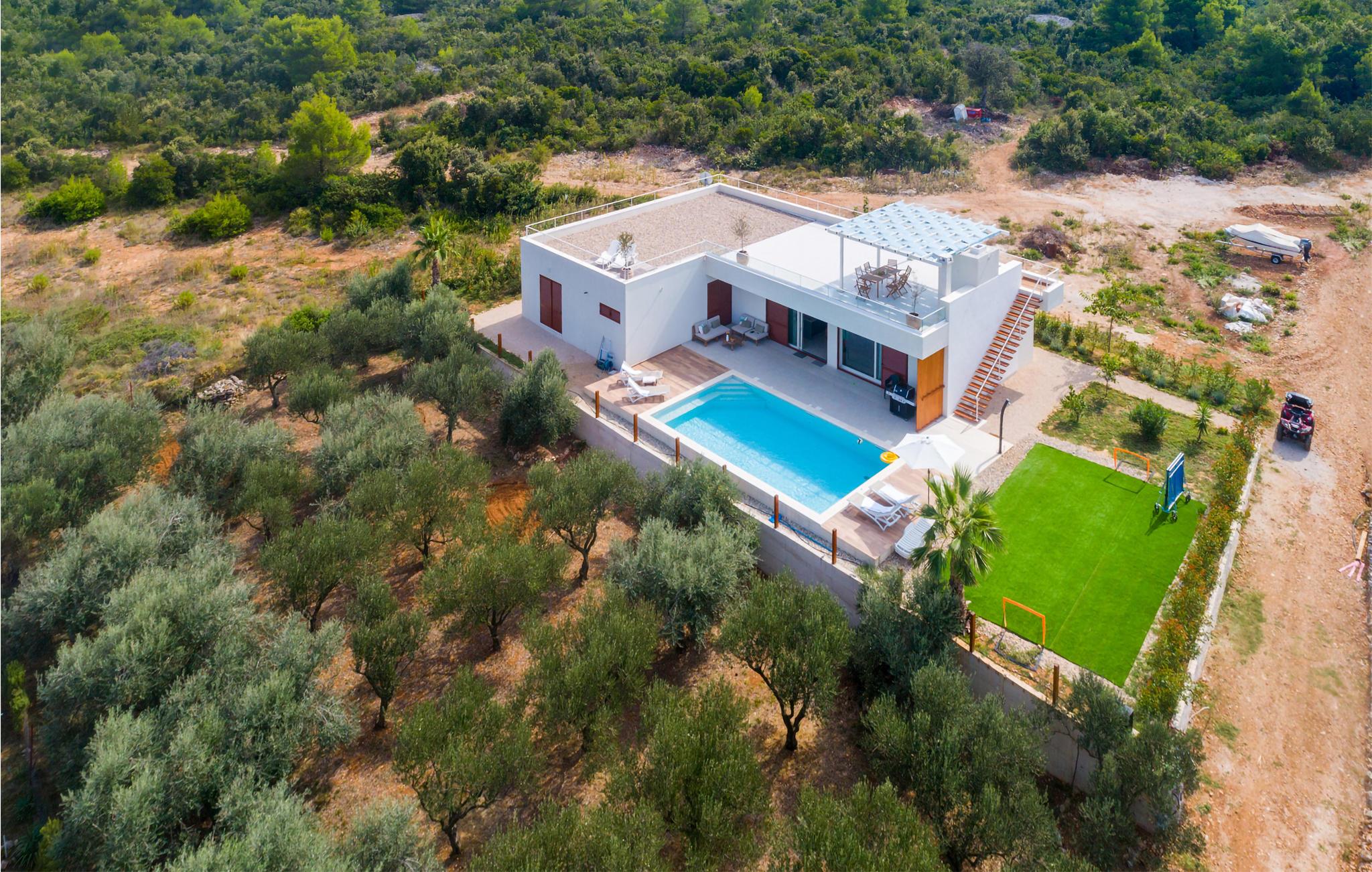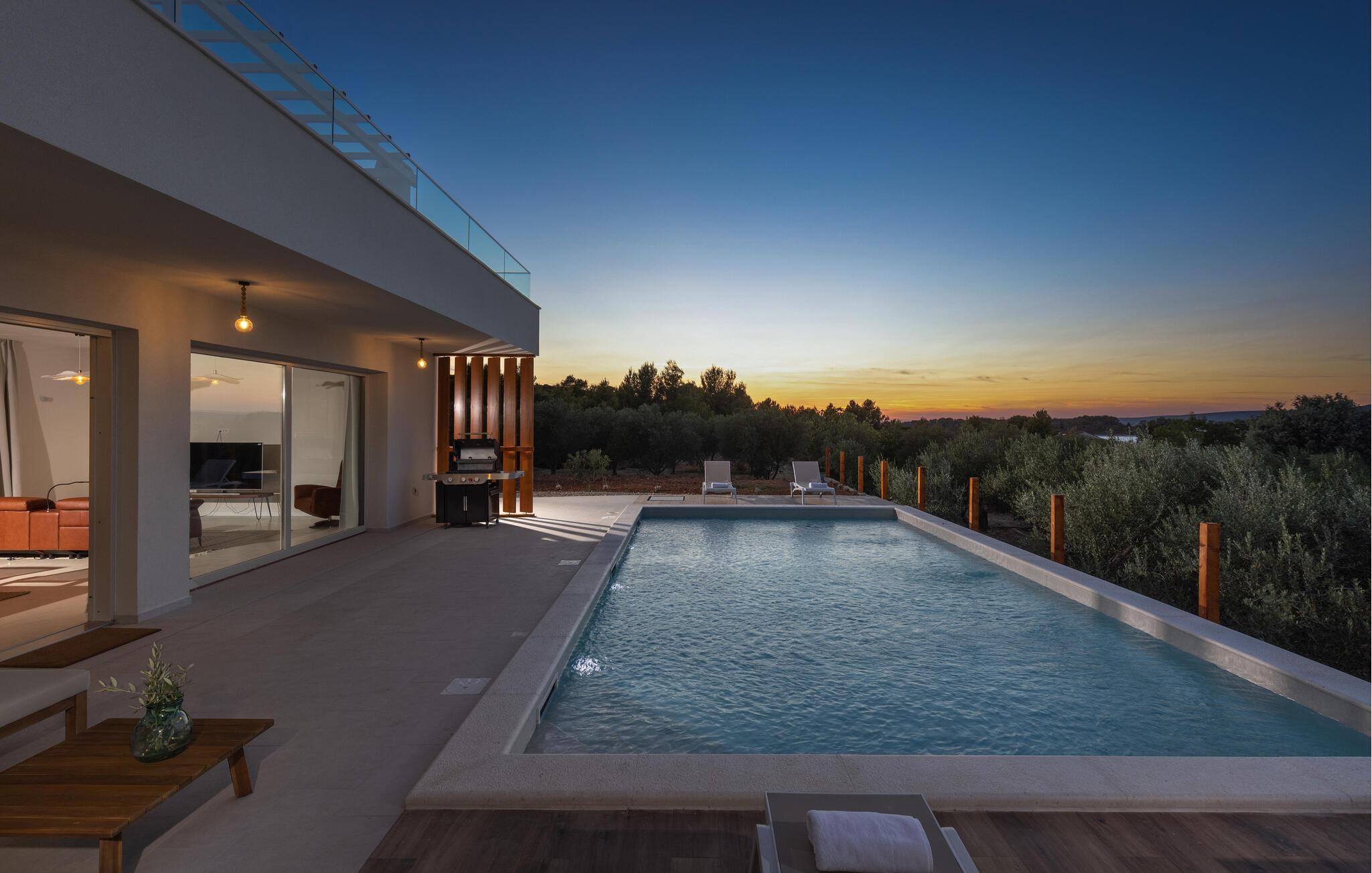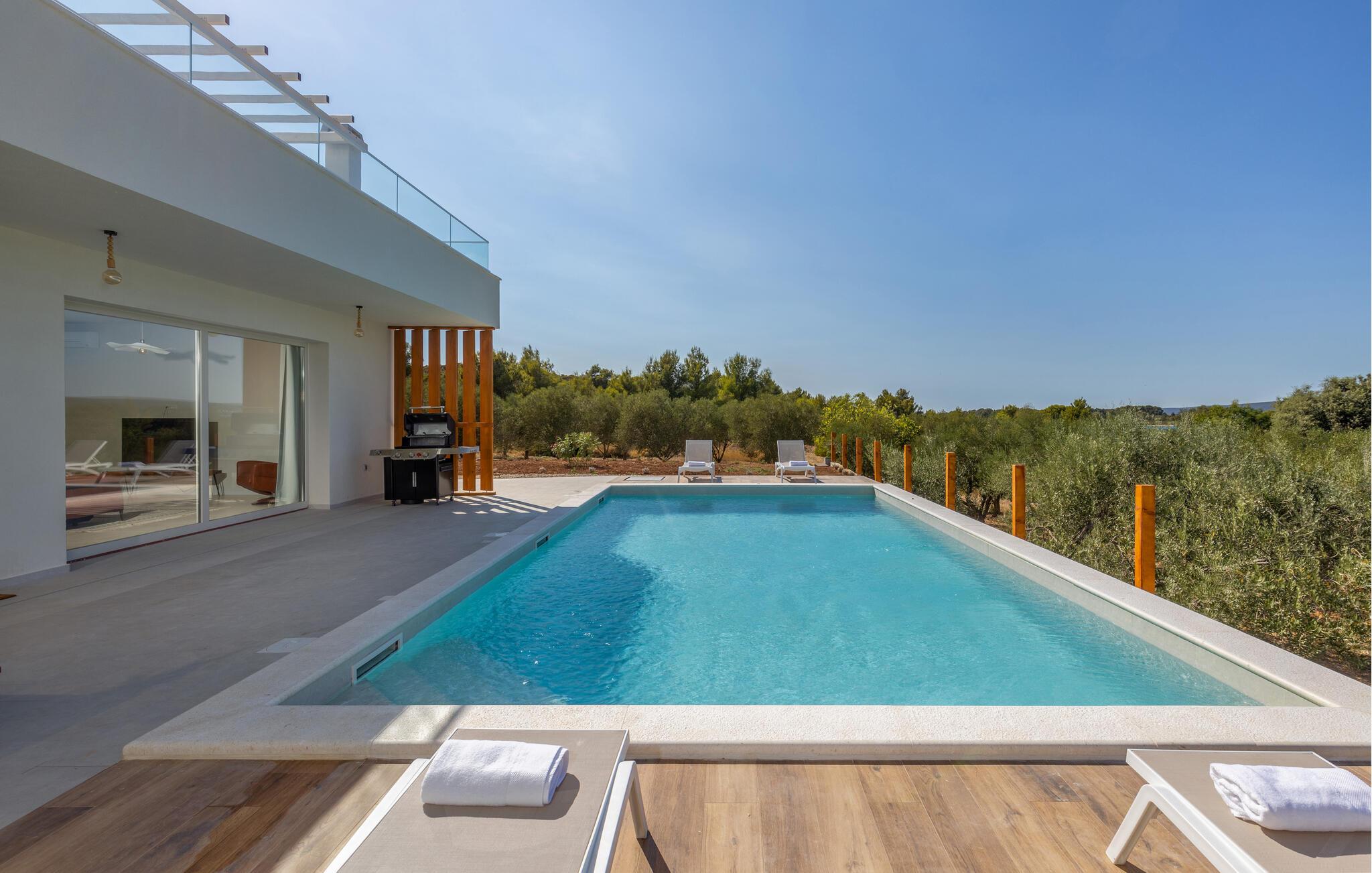 "Villa Santa Lucia ligger på øen Babac, som ligger mellem byen Biograd na Moru og øen Pašman. Øen Babac er den eneste beboede ø i øgruppen af ??16 øer ud for øen Pašman. Øen er den eneste beboede ø i øgruppen. er fuld af skjulte bugter og sandstrande og er ideel til en stille og fredelig ferie i 2022 i en moderne arkitektonisk stil, fra alle værelser udsigt over det klare Adriaterhav og tilbyder sine gæster 207 m2 boligareal, mens villaens samlede areal er på 780 m2 kan rumme maksimalt 8 personer I stueetagen kan du føle dig godt tilpas i stuen, som har en sofa, en lænestol og et tv, og børnene vil nyde PlayStation-spillekonsollen. Der er også et fuldt udstyret køkken og en spisestue bord til 8 personer. Du vil føle dig godt tilpas i 4 soveværelser, hvoraf 2 har en dobbeltseng og de resterende to har hver to enkeltsenge. Hvert soveværelse har sit eget badeværelse med bruser. Ovenpå finder du en 220 m² walk-out tagterrasse med en udendørs Weber gasgrill, et 8-sæders spisebord, liggestole og træningsudstyr. På den udendørs terrasse er der en opvarmet pool på 45 m2, 1,4 m dyb, som har massage som en ekstra funktionalitet. Du kan også solbade på de 8 liggestole. Andre faciliteter på Villa Santa Lucia omfatter en vaskemaskine, et strygejern og et separat toilet. Kommer børn med på ferie, kan du bruge et fodertrug og en babyseng. Ankommer du med egen båd, har du mulighed for at benytte bådpladsen. Vi tilbyder dig leje af en 8-meter båd MF 795 og en skipper til transport til kysten for sightseeing af øerne Pašman, Komornik og Galesnjak (en hjerteformet ø). Inkluderet i prisen:
