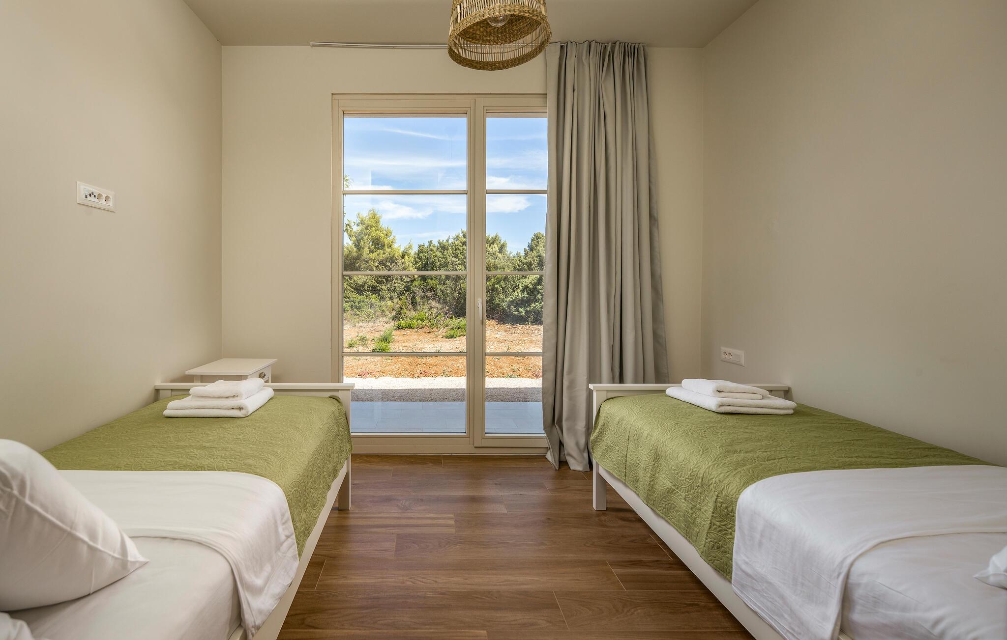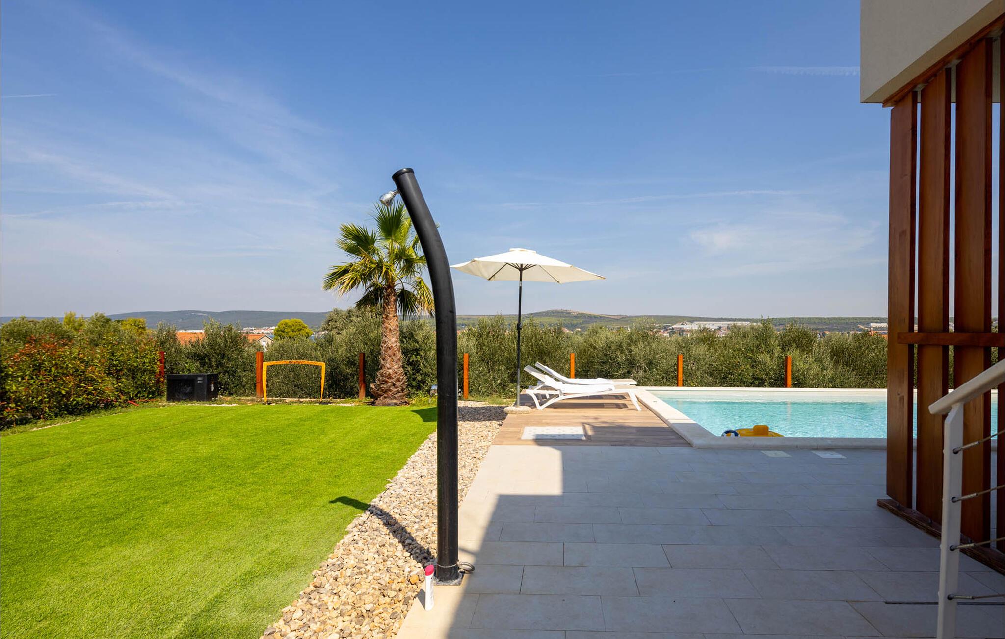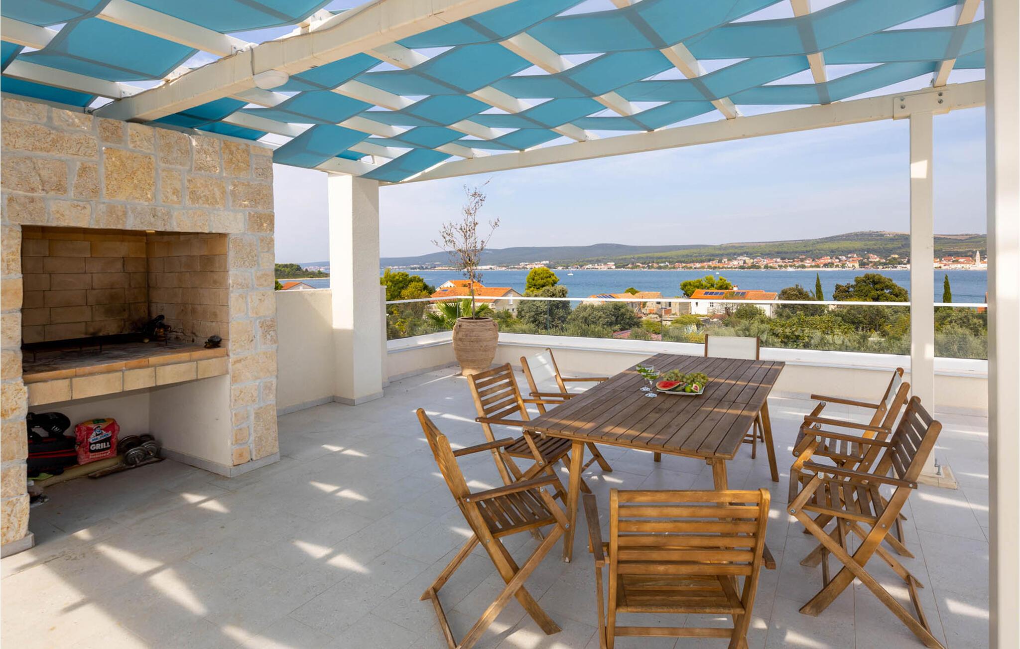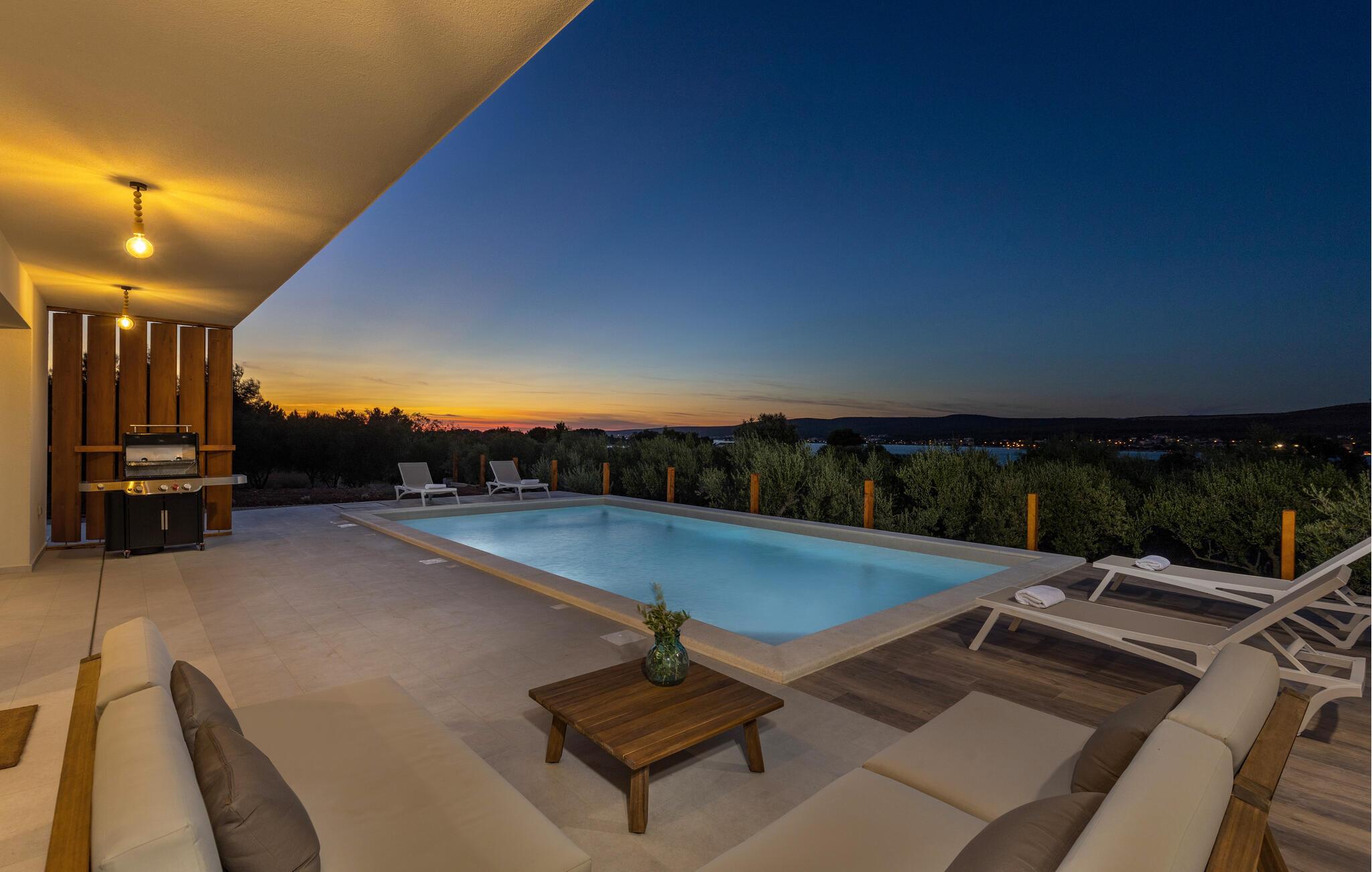 "Villa Santa Lucia ligger på øen Babac, som ligger mellem byen Biograd na Moru og øen Pašman. Øen Babac er den eneste beboede ø i øgruppen af ??16 øer ud for øen Pašman. Øen er den eneste beboede ø i øgruppen. er fuld af skjulte bugter og sandstrande og er ideel til en stille og fredelig ferie i 2022 i en moderne arkitektonisk stil, fra alle værelser udsigt over det klare Adriaterhav og tilbyder sine gæster 207 m2 boligareal, mens villaens samlede areal er på 780 m2 kan rumme maksimalt 8 personer I stueetagen kan du føle dig godt tilpas i stuen, som har en sofa, en lænestol og et tv, og børnene vil nyde PlayStation-spillekonsollen. Der er også et fuldt udstyret køkken og en spisestue bord til 8 personer. Du vil føle dig godt tilpas i 4 soveværelser, hvoraf 2 har en dobbeltseng og de resterende to har hver to enkeltsenge. Hvert soveværelse har sit eget badeværelse med bruser. Ovenpå finder du en 220 m² walk-out tagterrasse med en udendørs Weber gasgrill, et 8-sæders spisebord, liggestole og træningsudstyr. På den udendørs terrasse er der en opvarmet pool på 45 m2, 1,4 m dyb, som har massage som en ekstra funktionalitet. Du kan også solbade på de 8 liggestole. Andre faciliteter på Villa Santa Lucia omfatter en vaskemaskine, et strygejern og et separat toilet. Kommer børn med på ferie, kan du bruge et fodertrug og en babyseng. Ankommer du med egen båd, har du mulighed for at benytte bådpladsen. Vi tilbyder dig leje af en 8-meter båd MF 795 og en skipper til transport til kysten for sightseeing af øerne Pašman, Komornik og Galesnjak (en hjerteformet ø). Inkluderet i prisen: