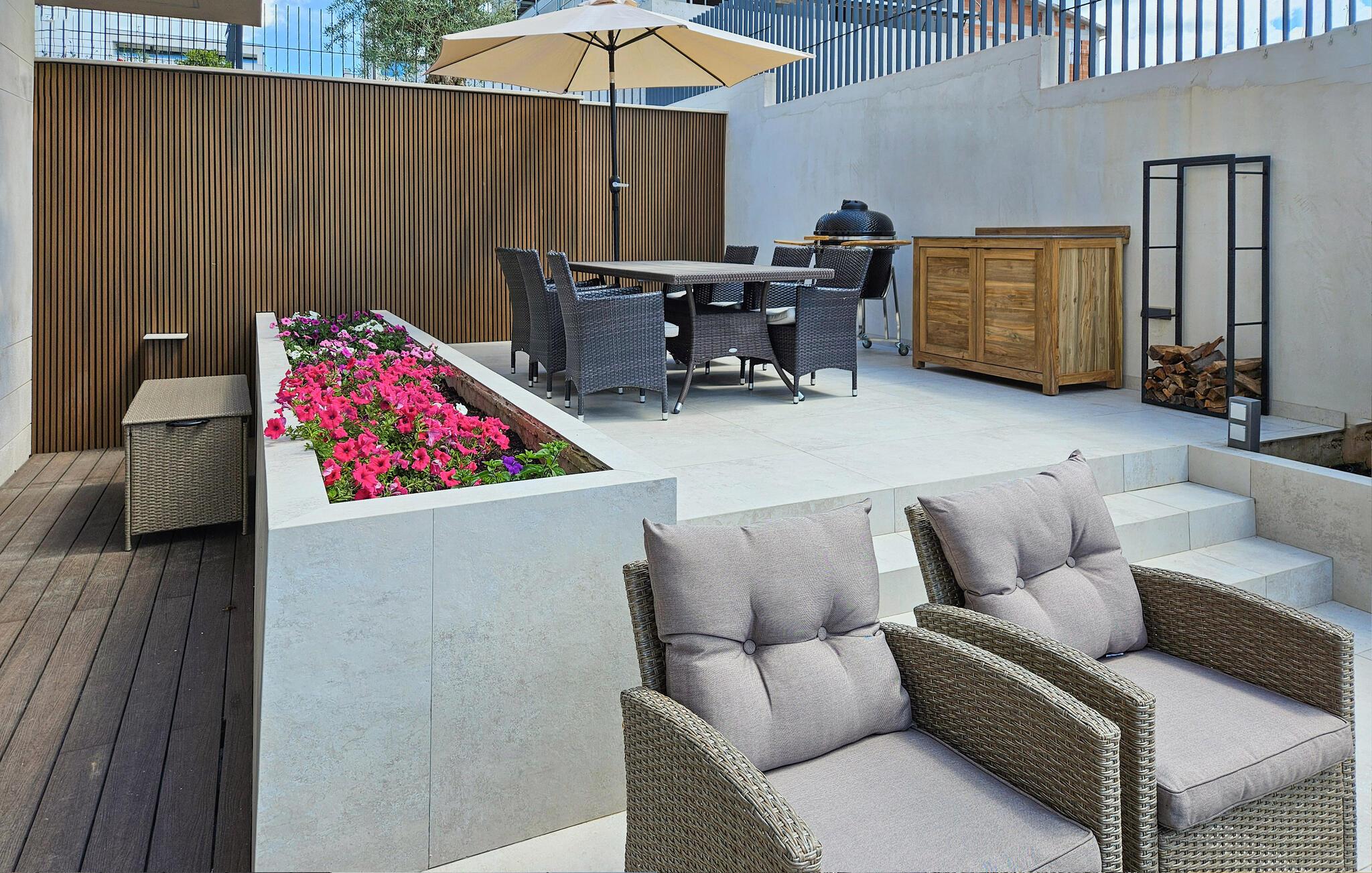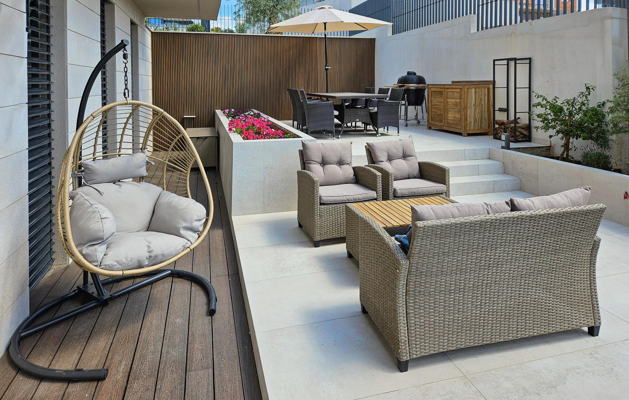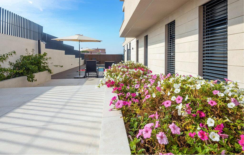 Til hver lejlighed hører en lækker altan, hvor I kan stå op med morgenkaffen og runde en lun sommeraften af med en kølig drink. Hvis solen er lige ved at få jer, er det bare at gå ned til den fælles terrasse og dyppe jer i poolen, inden I finder jer til rette i en liggestol med en god bog.