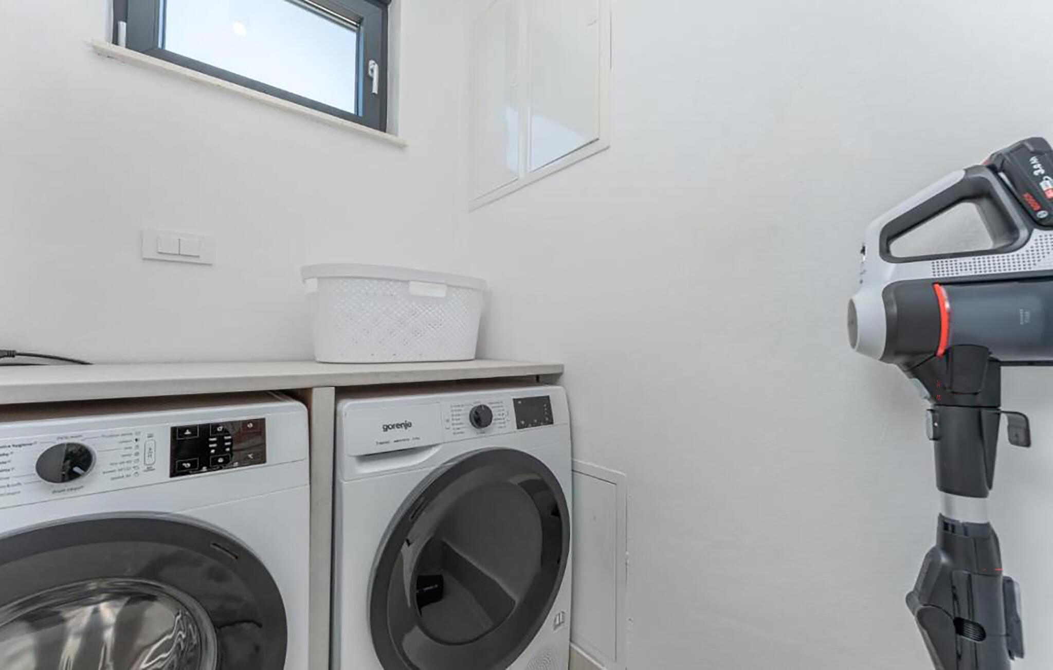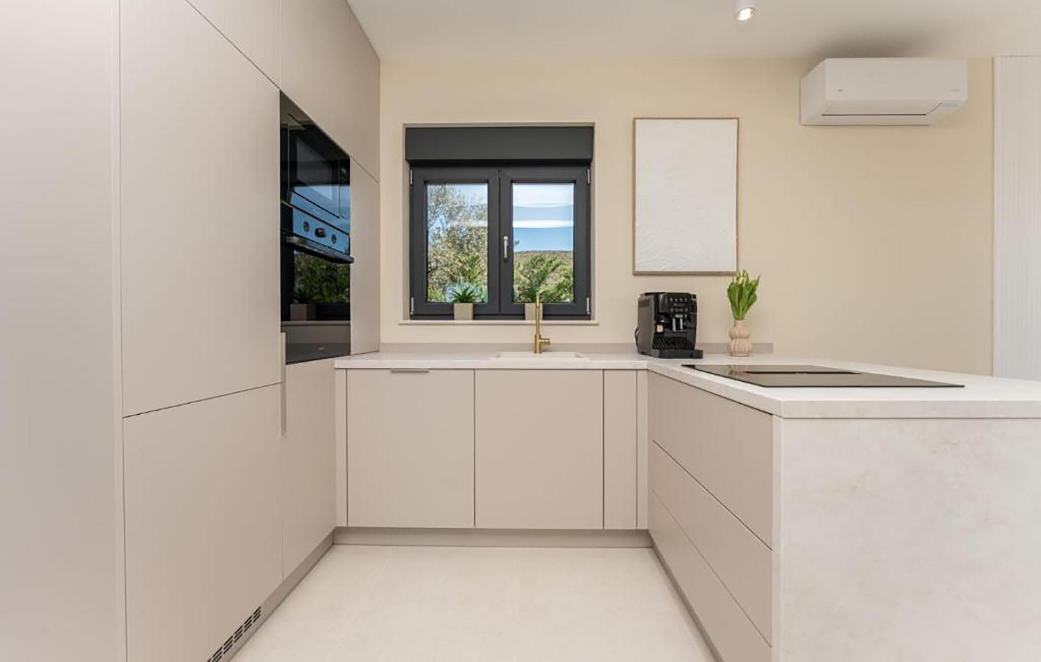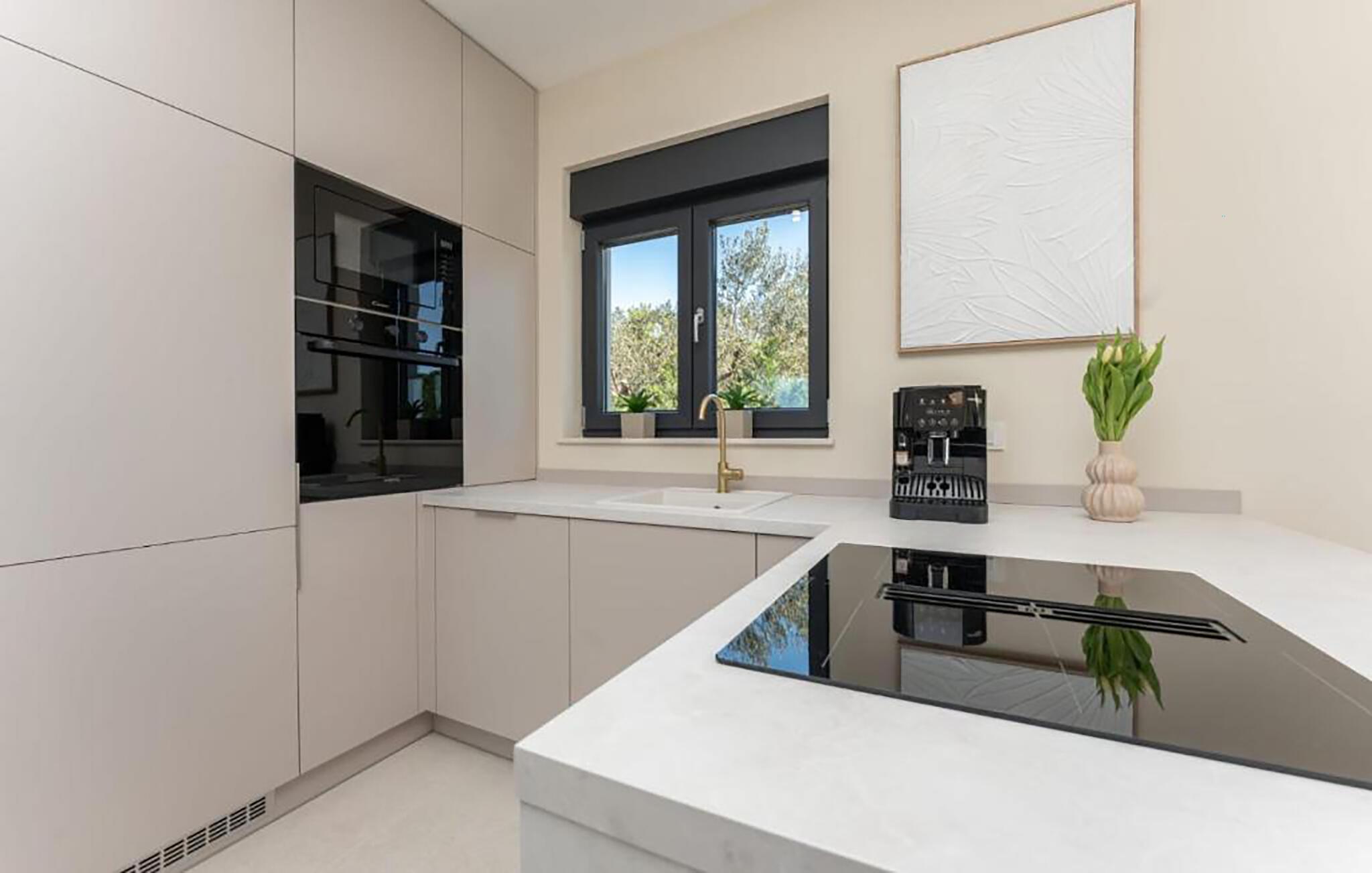 Slap af i den rummelige stue med elegant design, generøs sofa og store vinduer, der tilbyder udsigt helt til havet. Nyd rolige øjeblikke foran den iøjnefaldende designervæg med integreret tv. Samles omkring spisebordet og del måltider i en harmonisk atmosfære. Brug det åbne køkken med køkkenø og apparater af høj kvalitet til en dejlig start på dagen og aftener, hvor I tilbringer madlavning sammen.