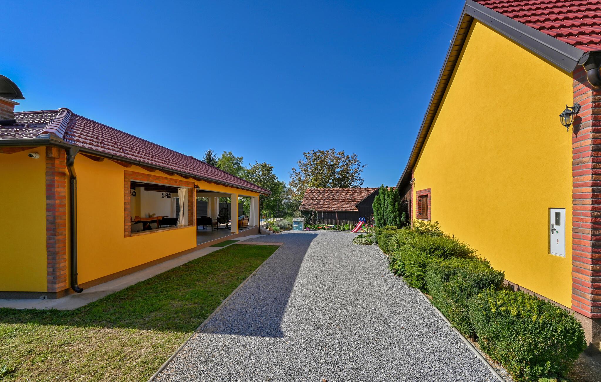 Glæd jer til en flot, stor grund, hvor I kan slappe af og slippe hunden løs. Nyd solen fra liggestolene og køl ned i poolen. Der er flere skyggefulde områder i gården, og en tur til den nærliggende skov er også oplagt.