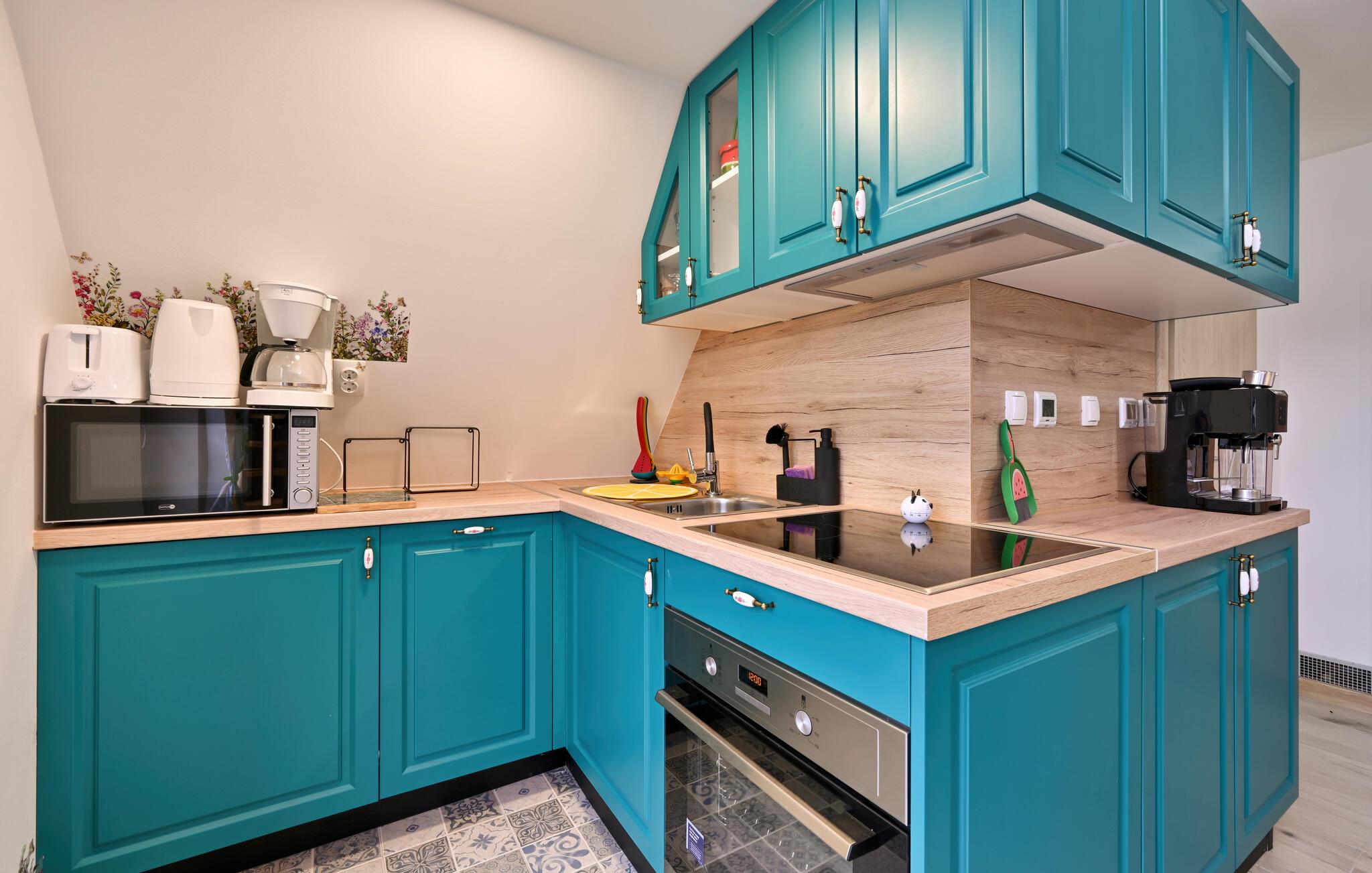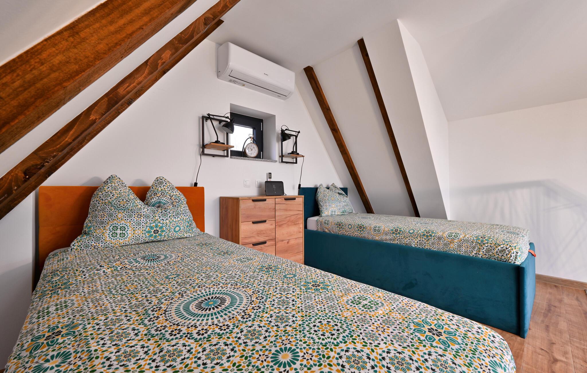 Velkommen til jeres hyggelige sommerhus i Bjelovar, som vil forkæle hele familien under en afslappende ferie. Glæd jer til en omfattende morgenmad i den kærligt designede atmosfære i det åbne køkken, som lægger op til at lave jeres yndlingsmåltider sammen. Forkæl jer selv med afslappende stunder i saunaen eller spabadet og kom sammen om aftenen til en selskabelig film- eller spilaften i den hyggelige stue.