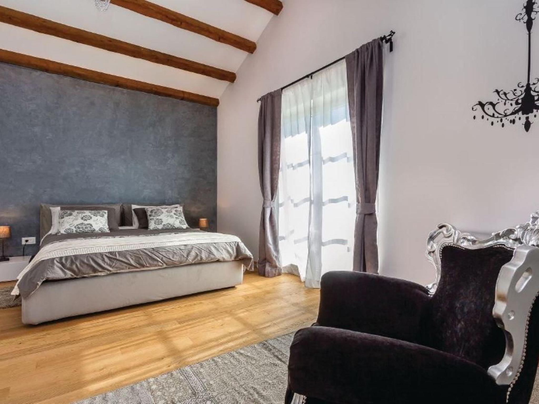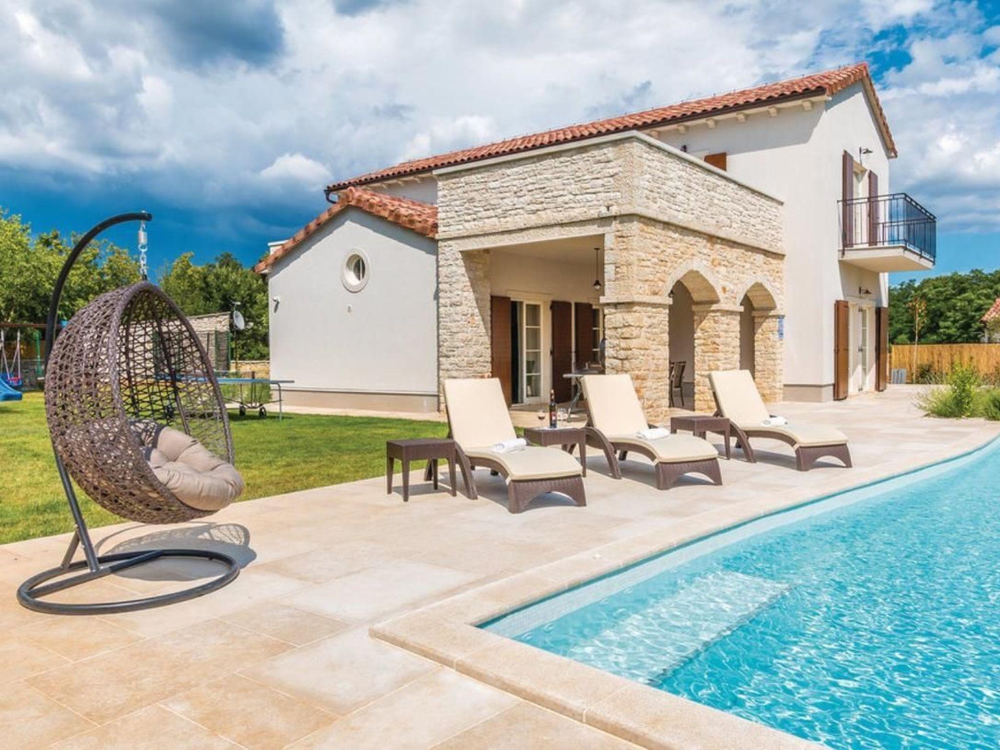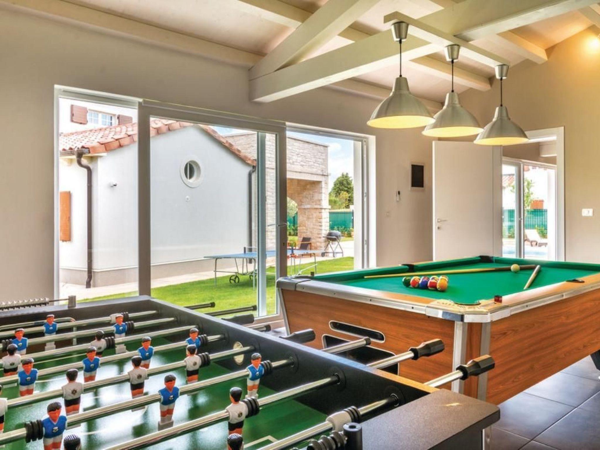 Enjoy the Mediterranean atmosphere in this beautiful, fully furnished and equipped holiday home, located in the small town of Sv. Kirin.The holiday home is a combination of modern design and traditional architecture, offering an excellent and unique living experience during your stay. The interior is designed with great attention to detail and furnished with high-quality furniture. In the warmer summer months, the outdoor pool offers the desired refreshment, while the wellness room with sauna and whirlpool will pamper you even more. The wellness and relaxation room has a glass wall that you can open at will, offering you the opportunity to relax in the open air. The recreation room with various entertainment facilities, such as billiards, table tennis, darts and table football, will complete your holiday. The well-kept garden with games also ensures pleasant moments, especially for the little ones. The ground floor is dominated by the large living area with kitchen and two bedrooms with bathroom, while the upper floor houses three more comfortable bedrooms with bathroom. A stay in this special holiday home will provide you with an unforgettable and completely carefree holiday. Sv. Kirin not only offers a holiday experience in unspoilt nature, but also connects you to the most important towns in Istria, which offer a wide range of amenities and cultural attractions. Visit the towns of Pula, Rovinj and Porec, which offer excellent restaurants and numerous cultural and entertainment events during the summer months. Opportunities for recreational activities include countless cycling trails, diving, swimming, horseback riding and windsurfing schools. Short description: Other: Non-smoking house. Short description: 1. Number of kitchens: 1. Surroundings: Rental possibilities: Car hire, bicycle hire. Sport facilities in the area: fishing, basketball, mountaineering, football field, golf course, hunting, mountain biking, cycling, indoor riding, surfing, diving, tennis, water skiing. Garden and outdoor facilities: On-site recreational facilities: Outdoor pool (for exclusive use), sauna, playground, swimming pool, table tennis, whirlpool. Garden facilities: Garden shed, garden furniture available, barbecue, playground (fitness room not available).