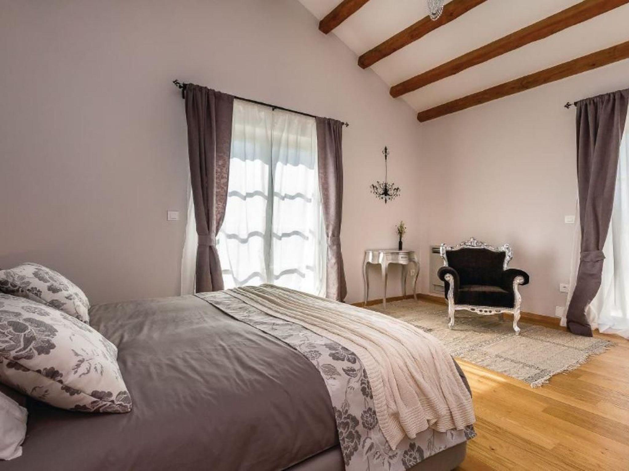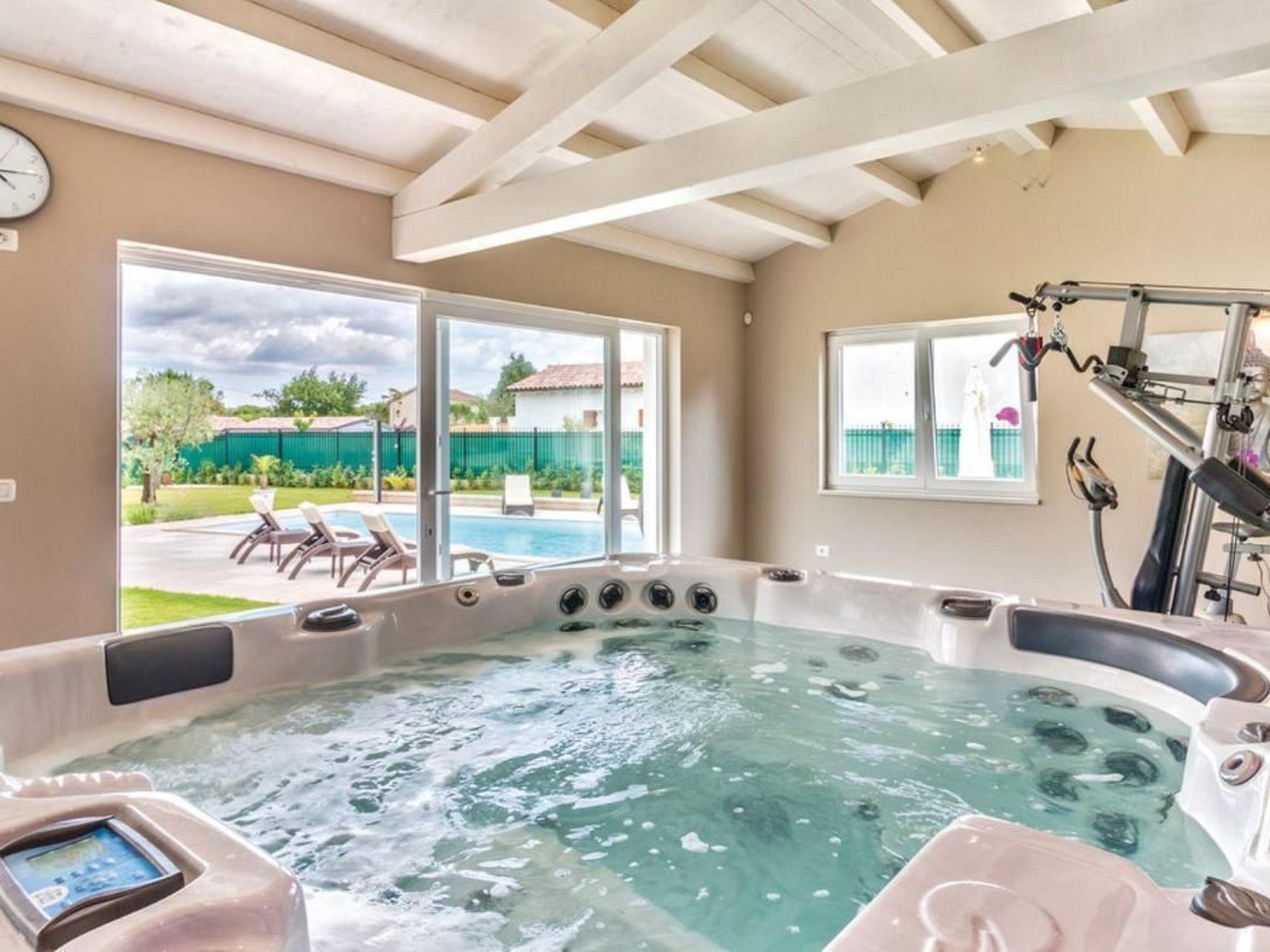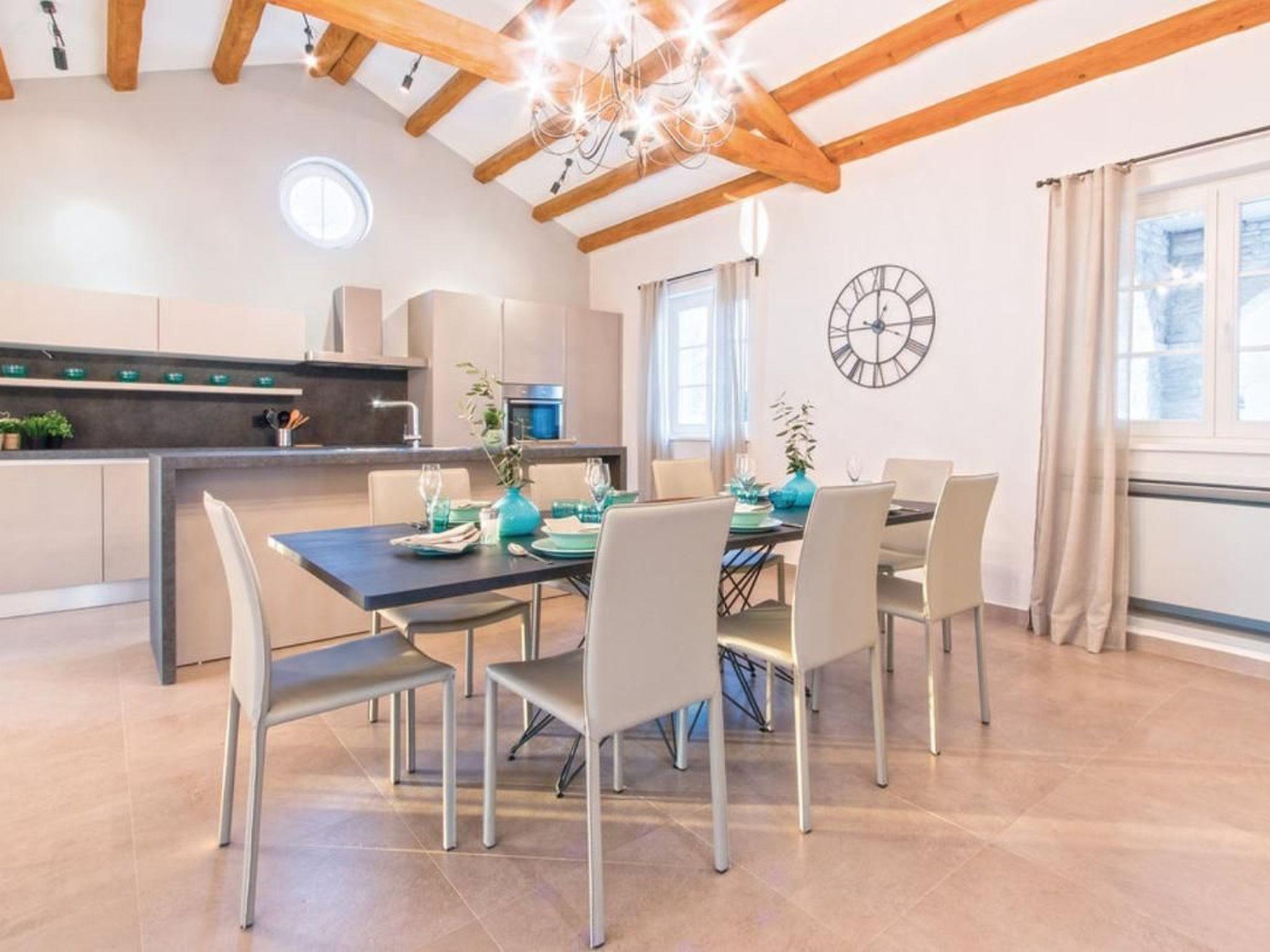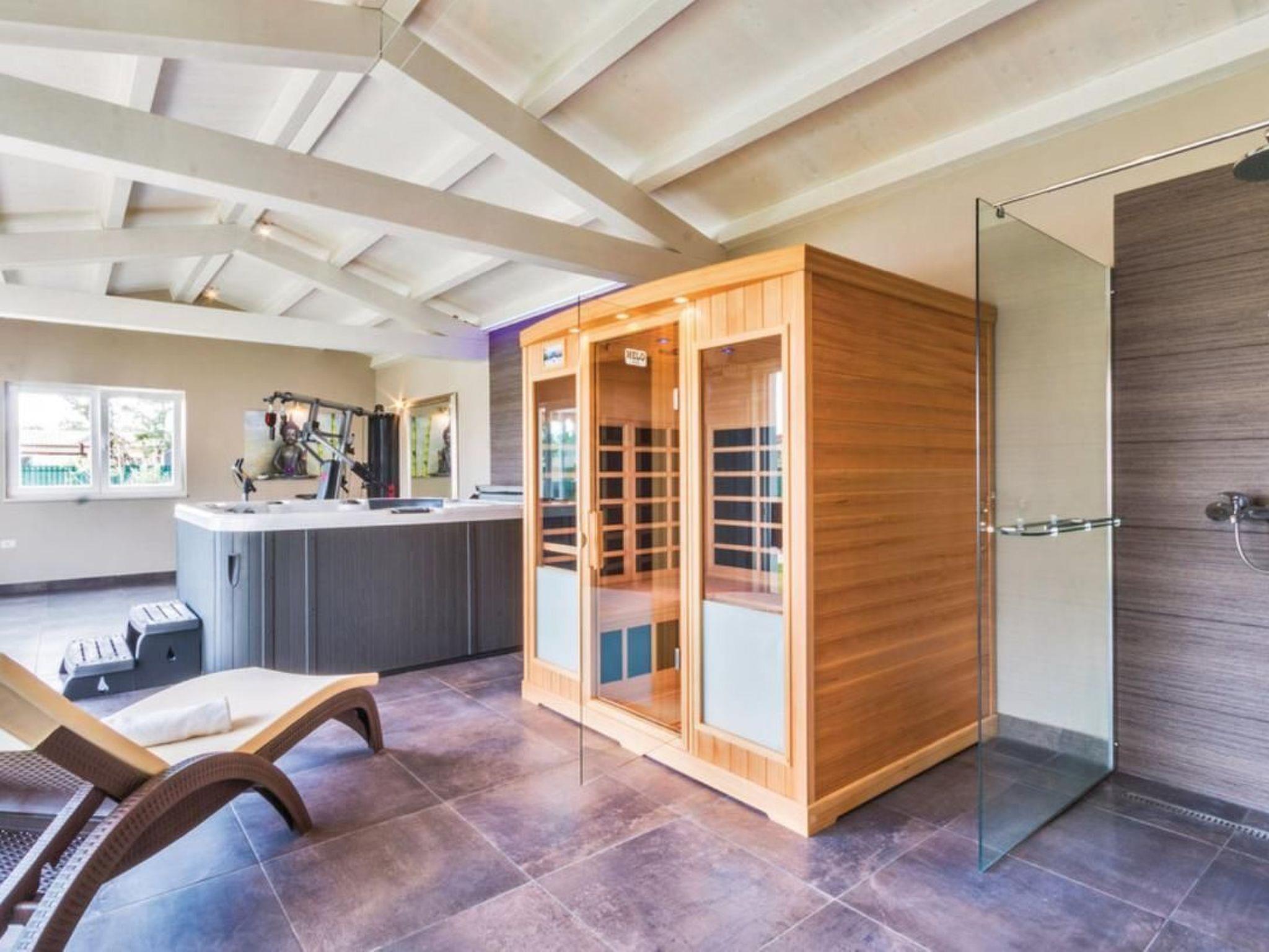 Enjoy the Mediterranean atmosphere in this beautiful, fully furnished and equipped holiday home, located in the small town of Sv. Kirin.The holiday home is a combination of modern design and traditional architecture, offering an excellent and unique living experience during your stay. The interior is designed with great attention to detail and furnished with high-quality furniture. In the warmer summer months, the outdoor pool offers the desired refreshment, while the wellness room with sauna and whirlpool will pamper you even more. The wellness and relaxation room has a glass wall that you can open at will, offering you the opportunity to relax in the open air. The recreation room with various entertainment facilities, such as billiards, table tennis, darts and table football, will complete your holiday. The well-kept garden with games also ensures pleasant moments, especially for the little ones. The ground floor is dominated by the large living area with kitchen and two bedrooms with bathroom, while the upper floor houses three more comfortable bedrooms with bathroom. A stay in this special holiday home will provide you with an unforgettable and completely carefree holiday. Sv. Kirin not only offers a holiday experience in unspoilt nature, but also connects you to the most important towns in Istria, which offer a wide range of amenities and cultural attractions. Visit the towns of Pula, Rovinj and Porec, which offer excellent restaurants and numerous cultural and entertainment events during the summer months. Opportunities for recreational activities include countless cycling trails, diving, swimming, horseback riding and windsurfing schools. Short description: Other: Non-smoking house. Short description: 1. Number of kitchens: 1. Surroundings: Rental possibilities: Car hire, bicycle hire. Sport facilities in the area: fishing, basketball, mountaineering, football field, golf course, hunting, mountain biking, cycling, indoor riding, surfing, diving, tennis, water skiing. Garden and outdoor facilities: On-site recreational facilities: Outdoor pool (for exclusive use), sauna, playground, swimming pool, table tennis, whirlpool. Garden facilities: Garden shed, garden furniture available, barbecue, playground (fitness room not available).