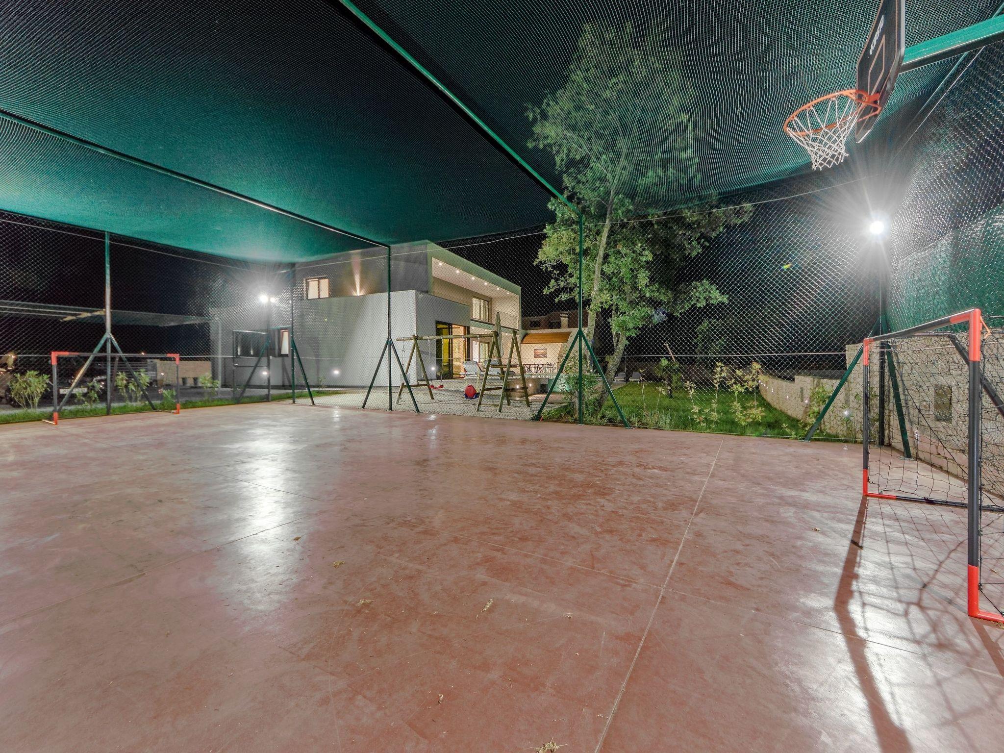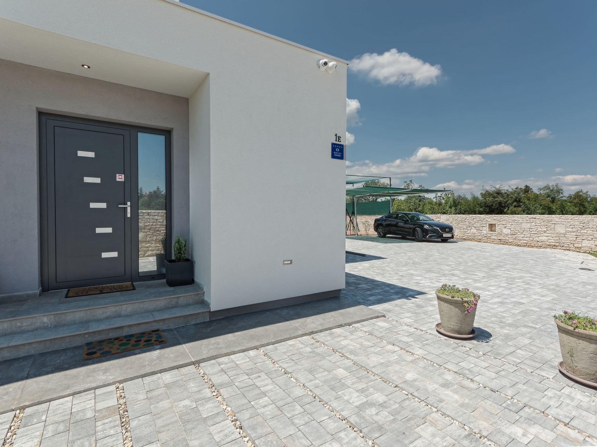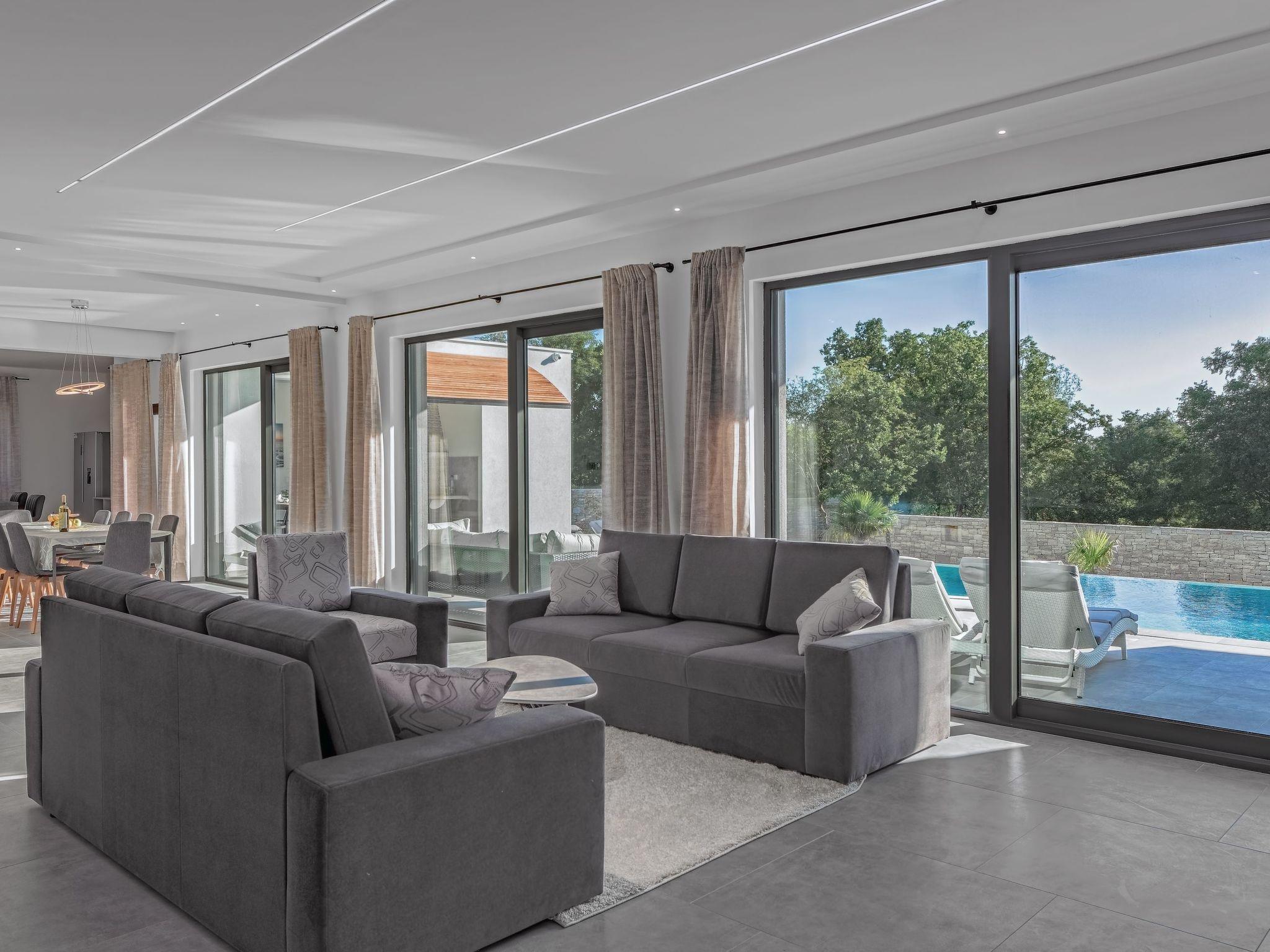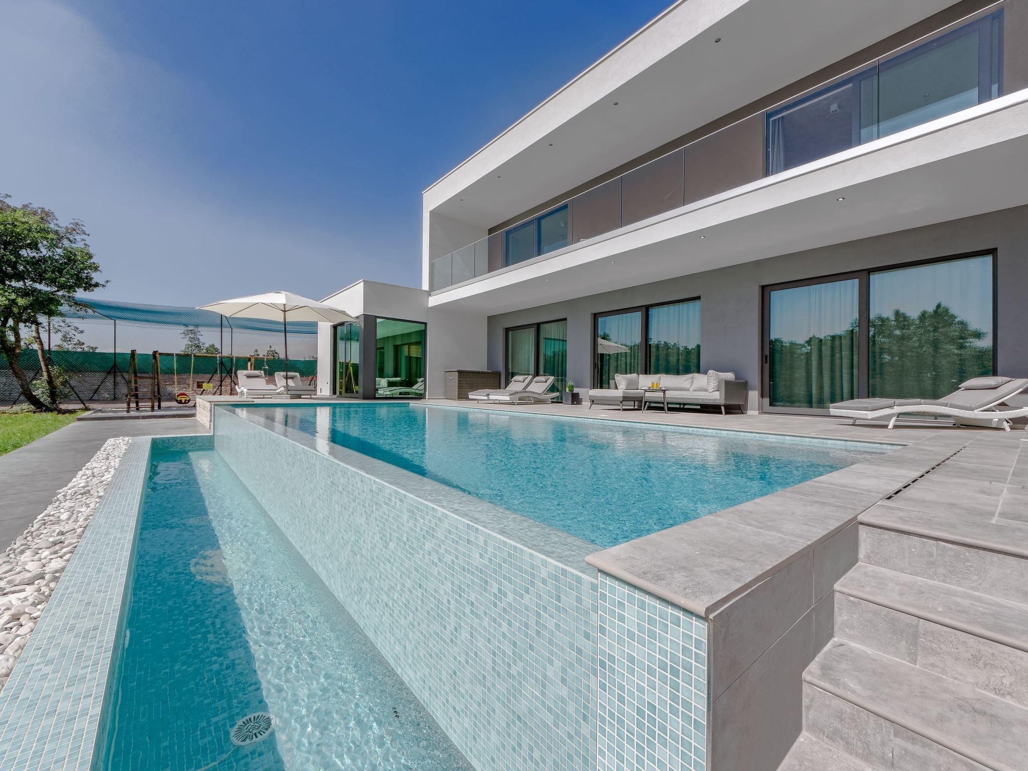 The property is completely surrounded by an Istrian stone wall and an electric gate, offering you unique privacy for your holiday. You can relax by the large infinity pool with massage jets and then sunbathe on the terrace. Comfortable loungers and lounge furniture with cushions and parasols are available for this purpose. In the evening, you can barbecue in the covered outdoor kitchen and sit comfortably at the large dining table. There is a sports and playing field measuring 15 x 7.5 metres and a large garden with a lawn and swings for your children and sporty types. Your cars are parked in three car parks, two of which have sun roofs, also on the property. A free private charging point is available for your electric vehicle.