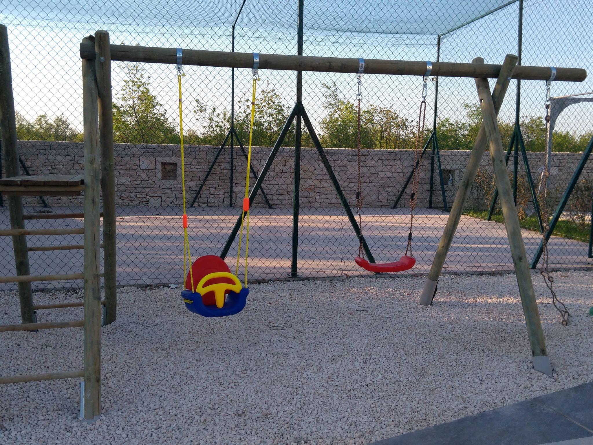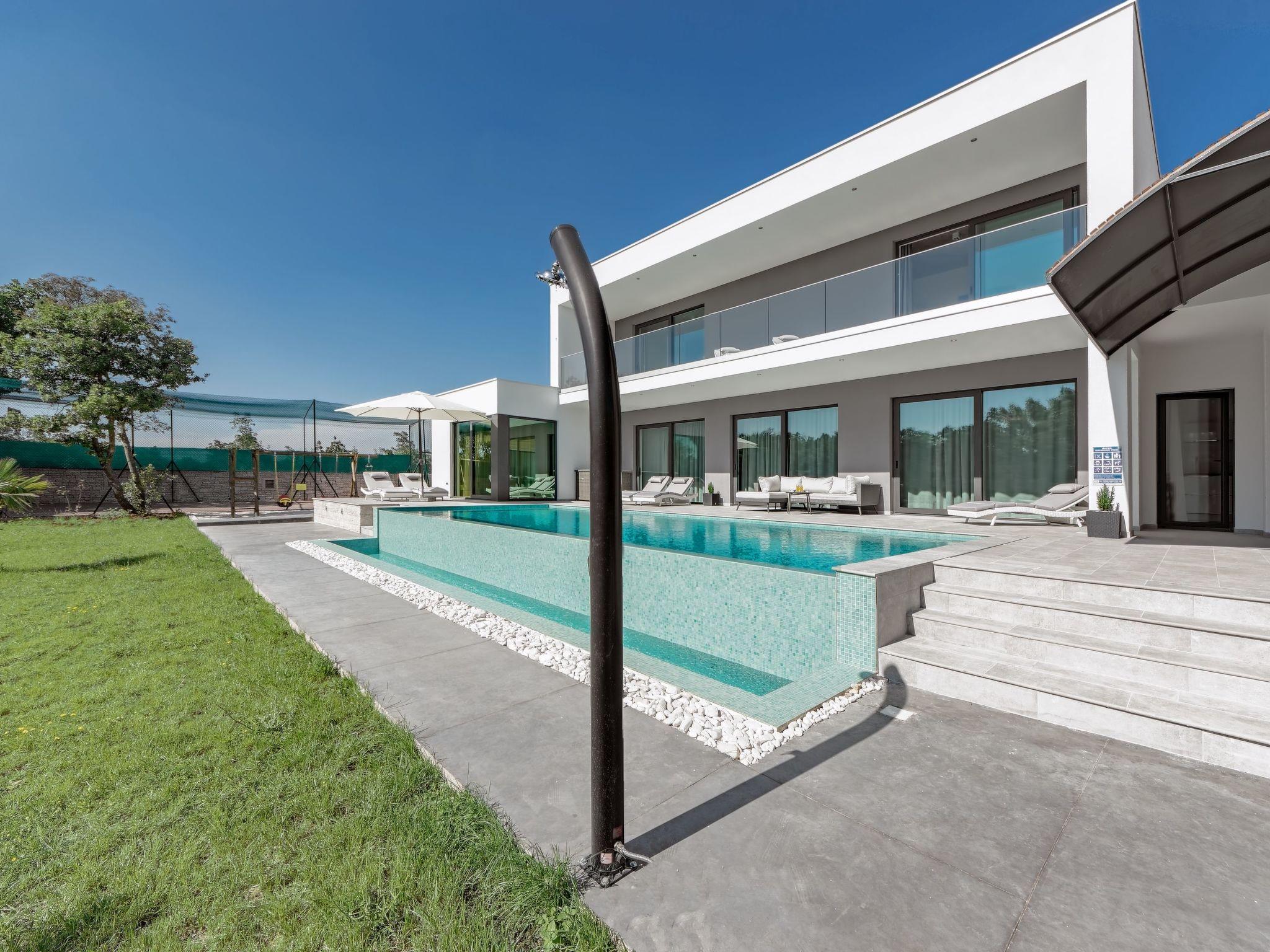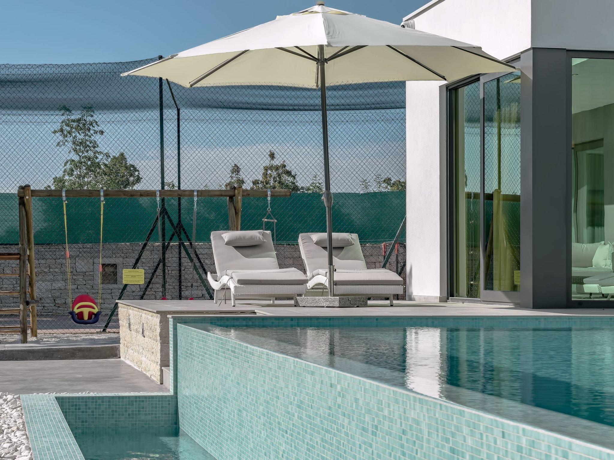 The property is completely surrounded by an Istrian stone wall and an electric gate, offering you unique privacy for your holiday. You can relax by the large infinity pool with massage jets and then sunbathe on the terrace. Comfortable loungers and lounge furniture with cushions and parasols are available for this purpose. In the evening, you can barbecue in the covered outdoor kitchen and sit comfortably at the large dining table. There is a sports and playing field measuring 15 x 7.5 metres and a large garden with a lawn and swings for your children and sporty types. Your cars are parked in three car parks, two of which have sun roofs, also on the property. A free private charging point is available for your electric vehicle.