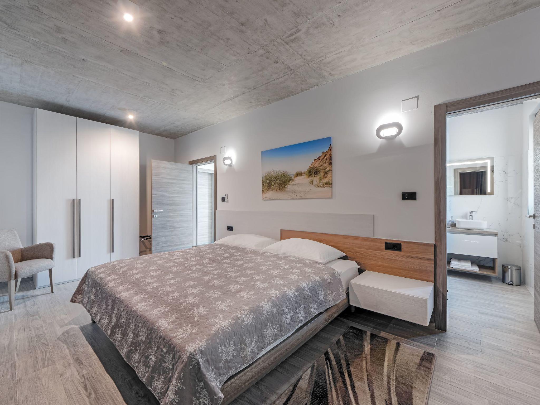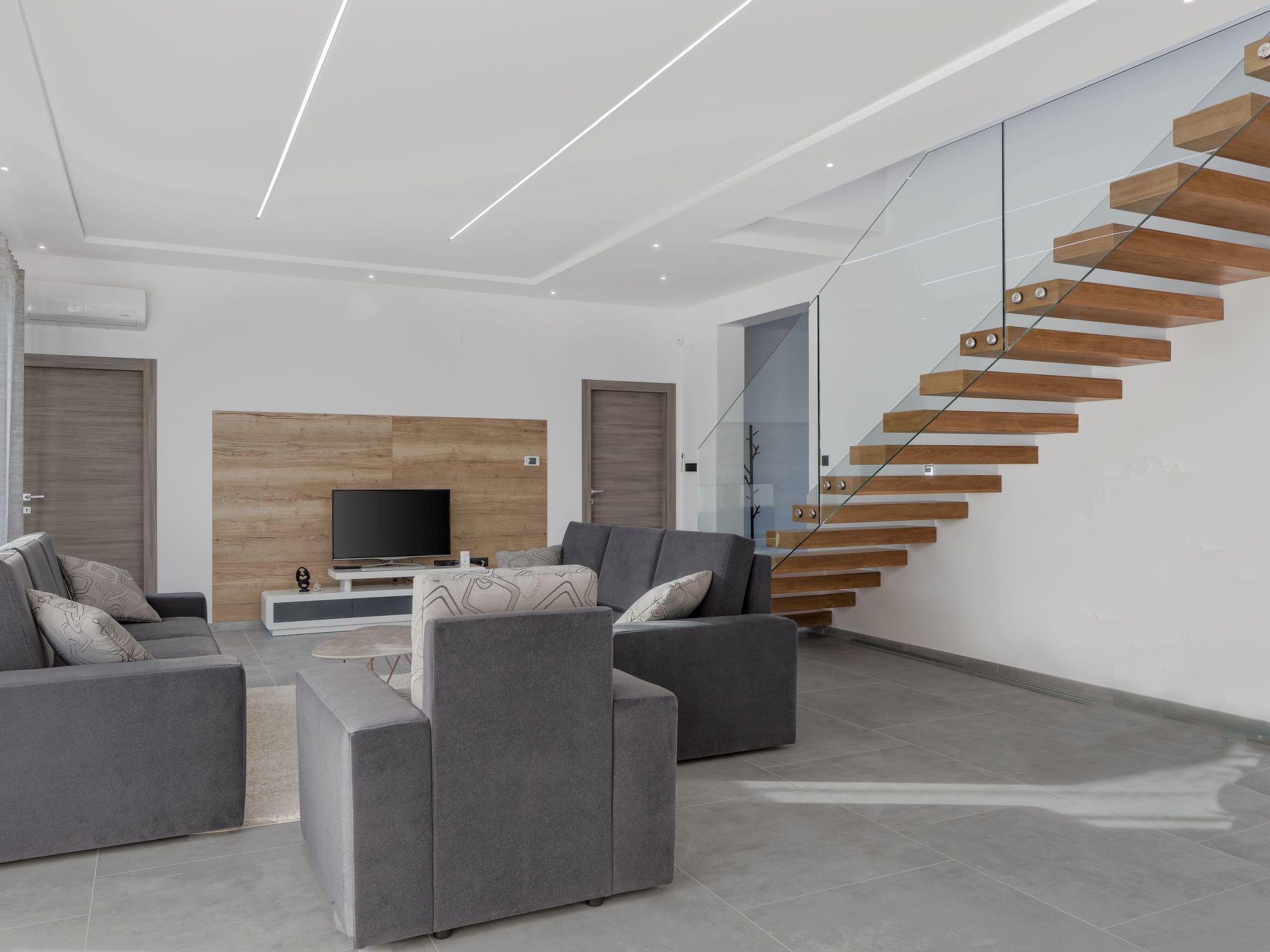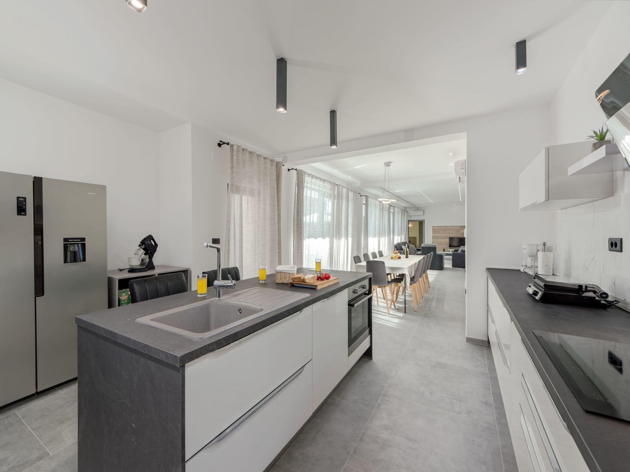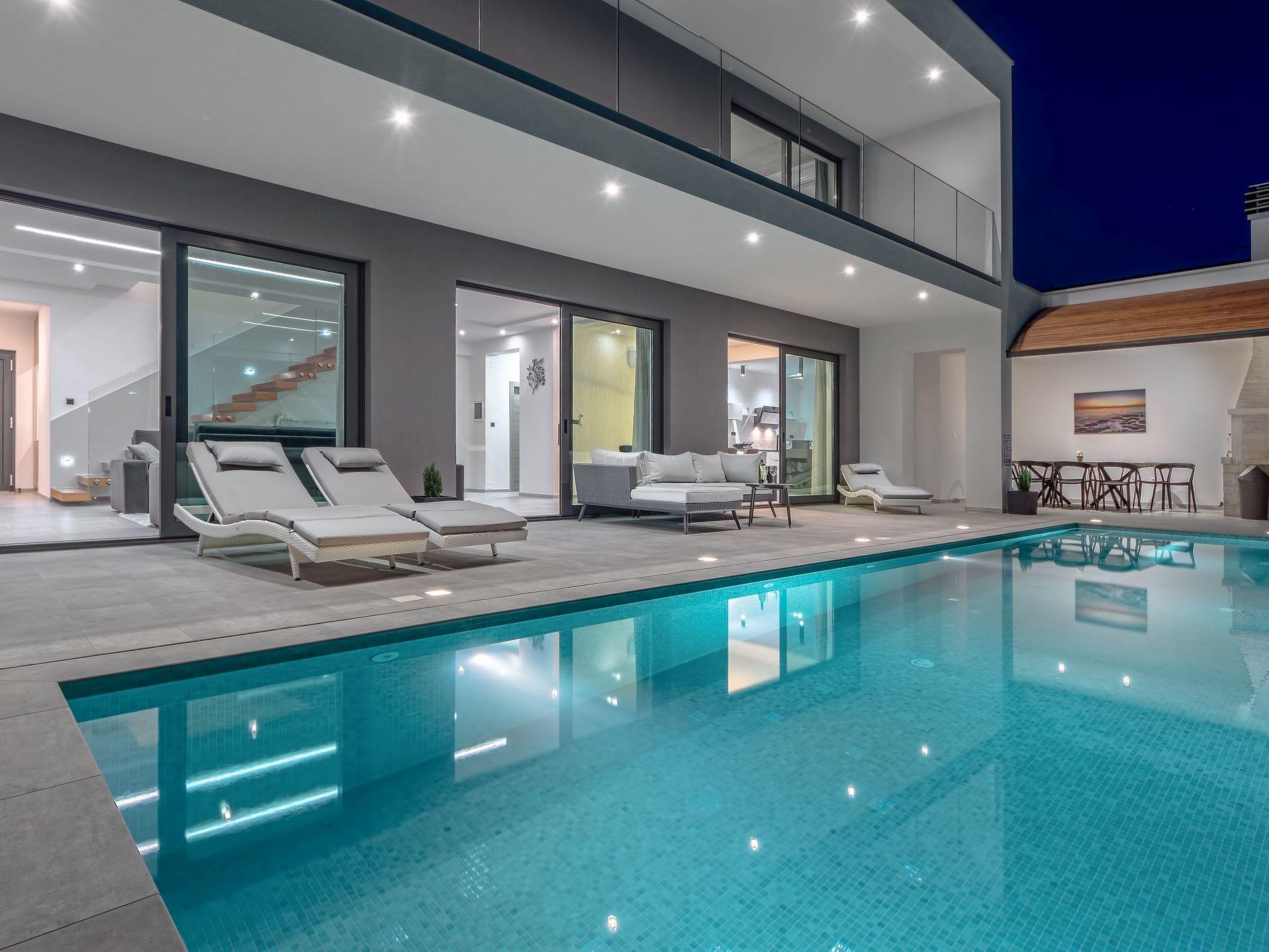 The property is completely surrounded by an Istrian stone wall and an electric gate, offering you unique privacy for your holiday. You can relax by the large infinity pool with massage jets and then sunbathe on the terrace. Comfortable loungers and lounge furniture with cushions and parasols are available for this purpose. In the evening, you can barbecue in the covered outdoor kitchen and sit comfortably at the large dining table. There is a sports and playing field measuring 15 x 7.5 metres and a large garden with a lawn and swings for your children and sporty types. Your cars are parked in three car parks, two of which have sun roofs, also on the property. A free private charging point is available for your electric vehicle.