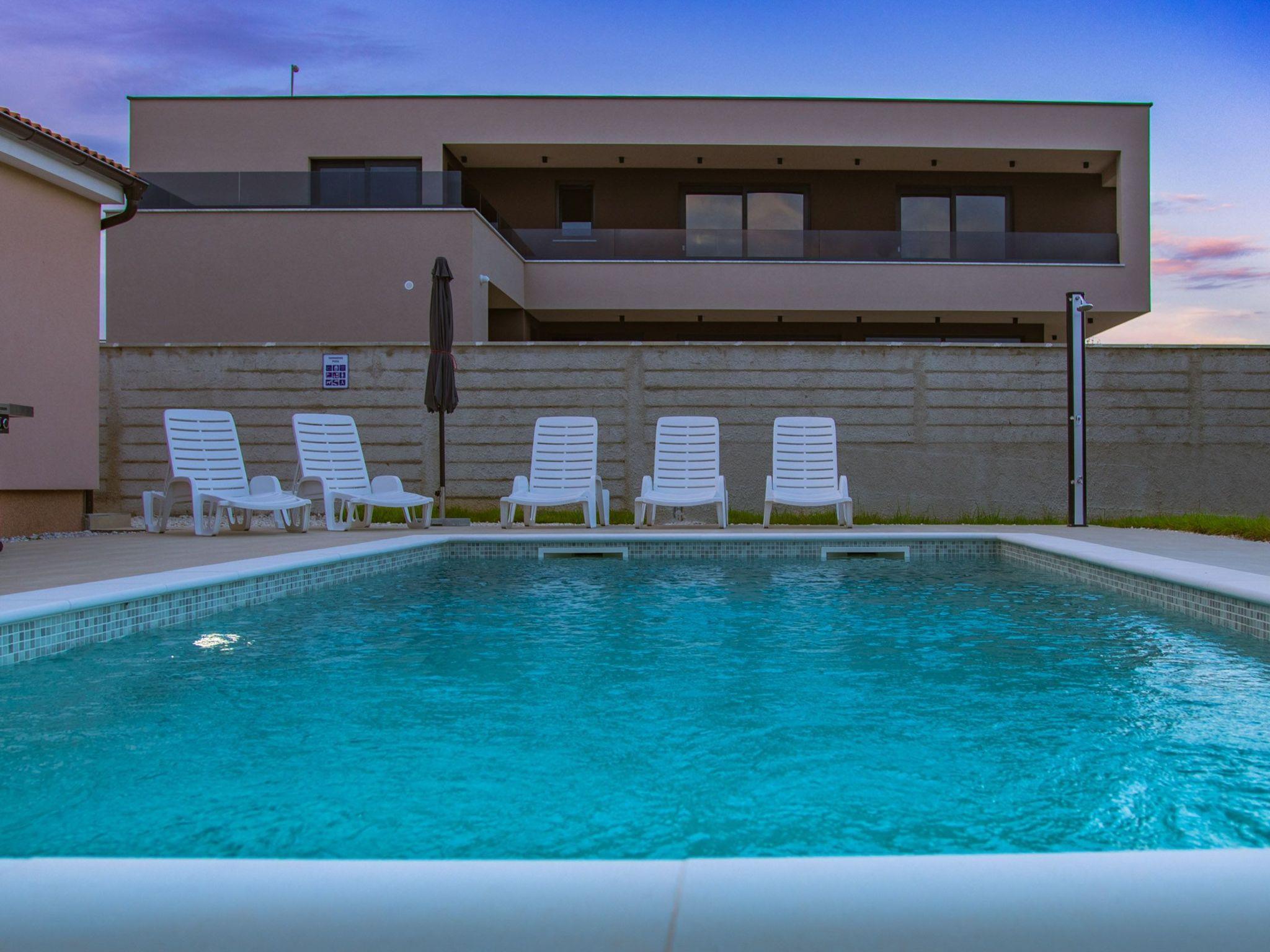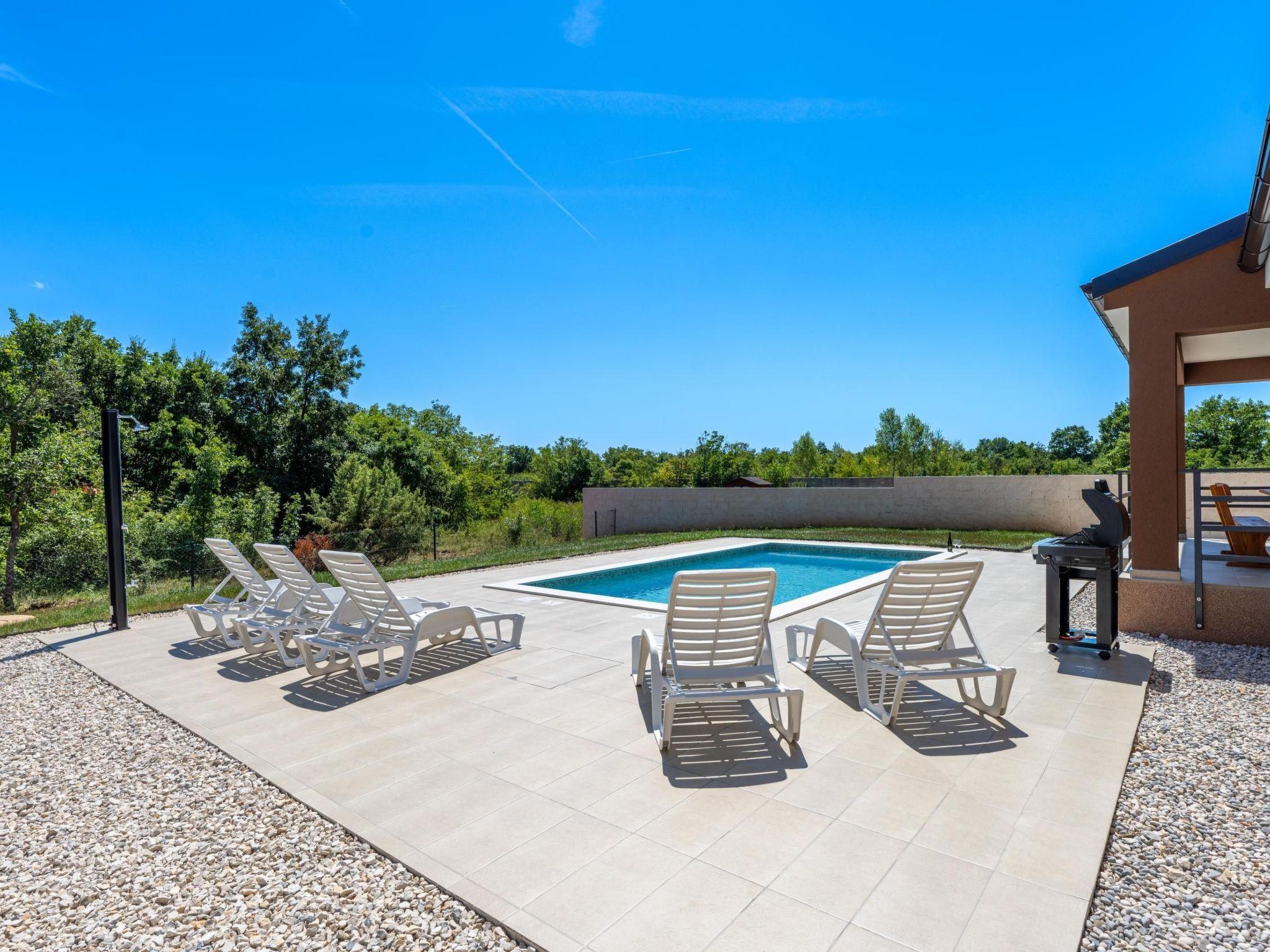24 m2 pool features 5 sun loungers for sunbathing and an outdoor shower.