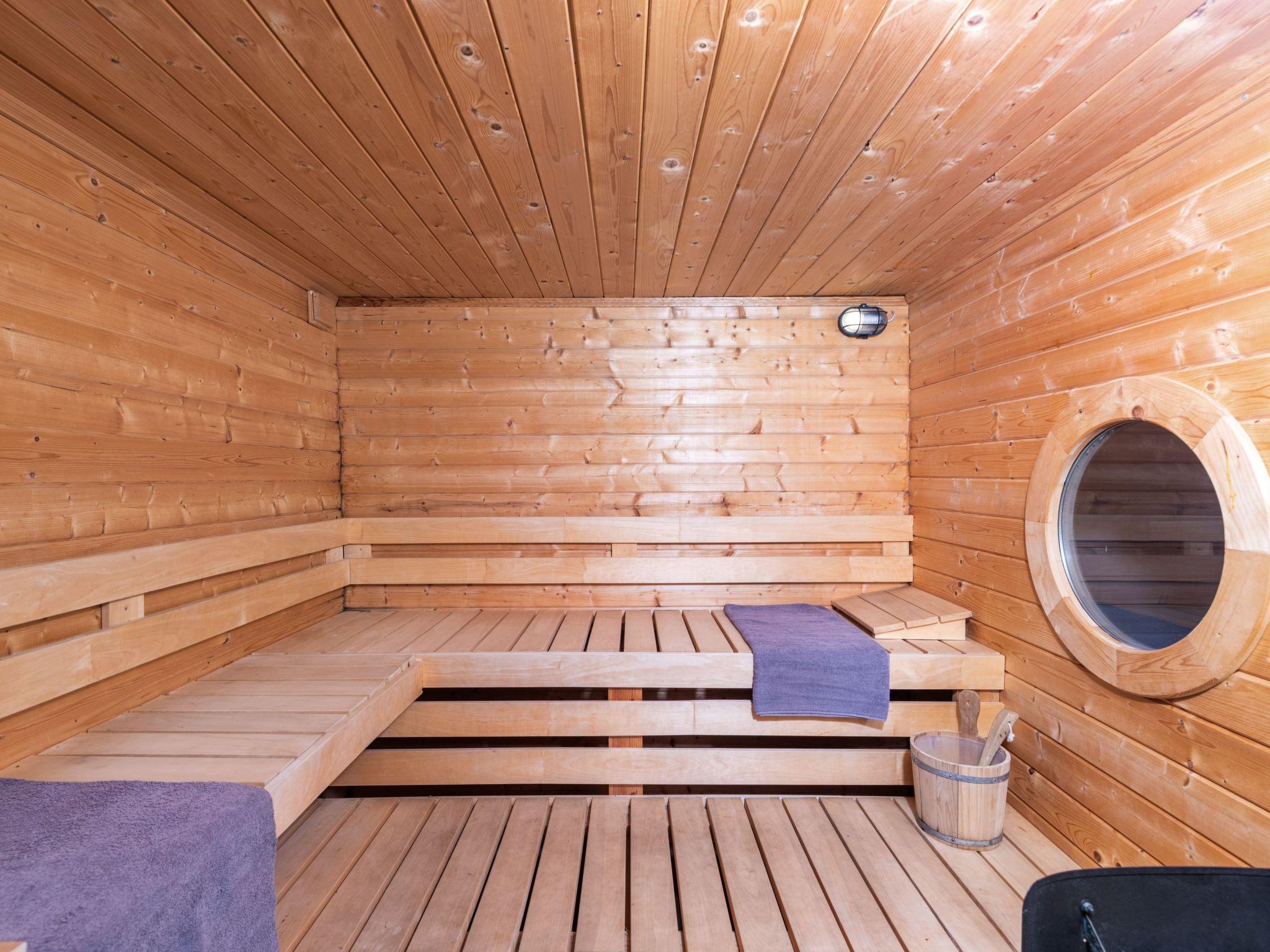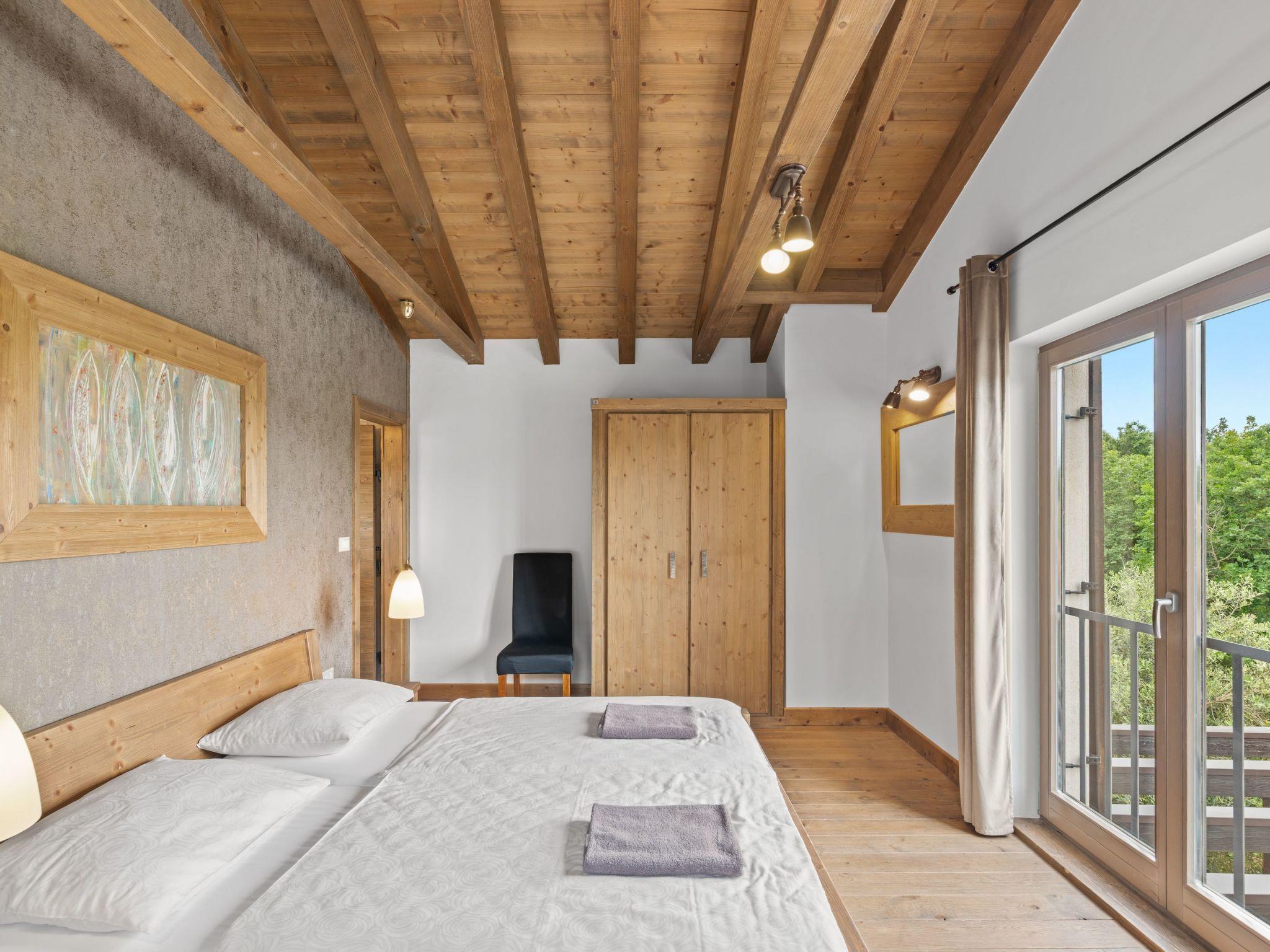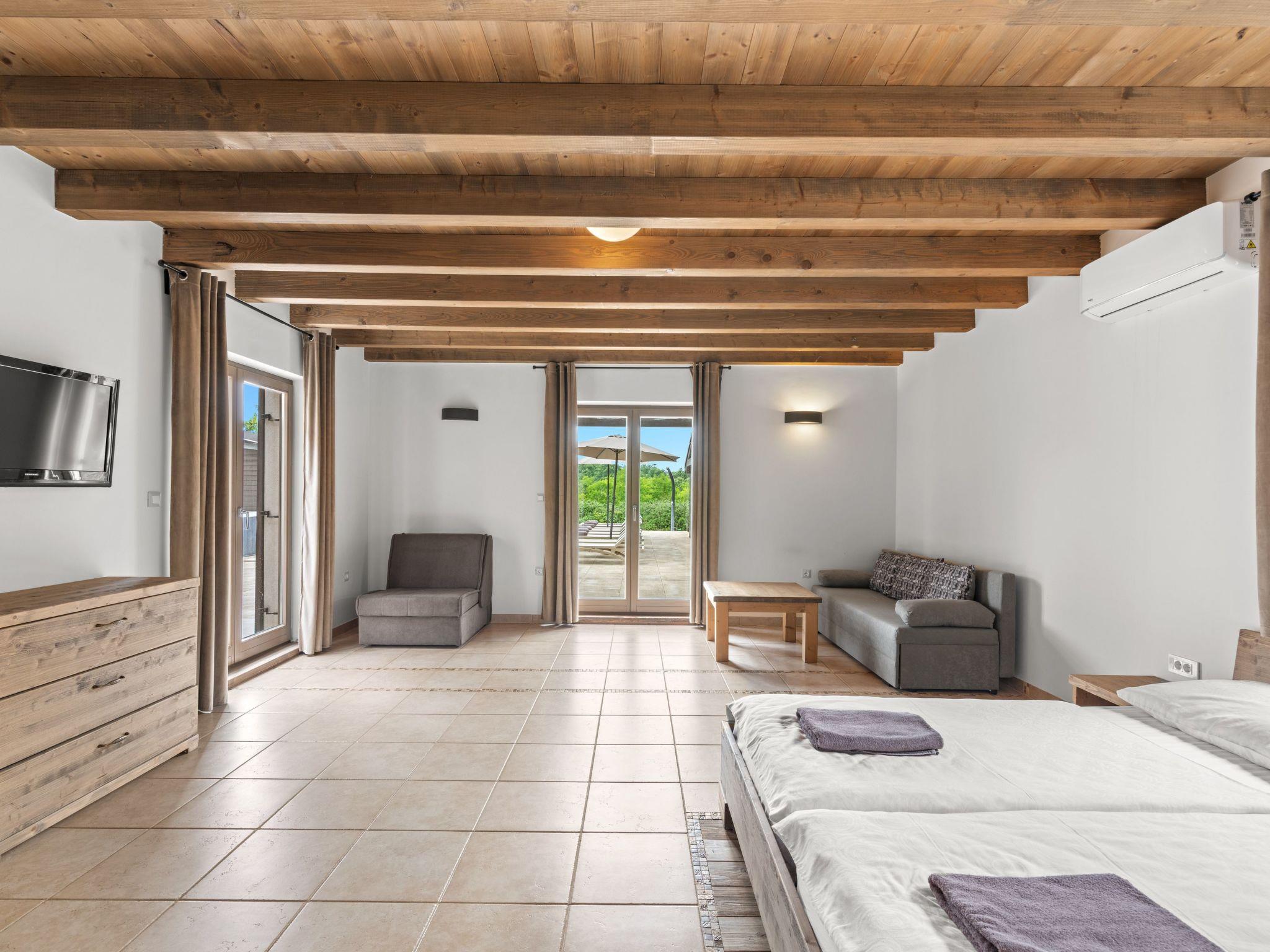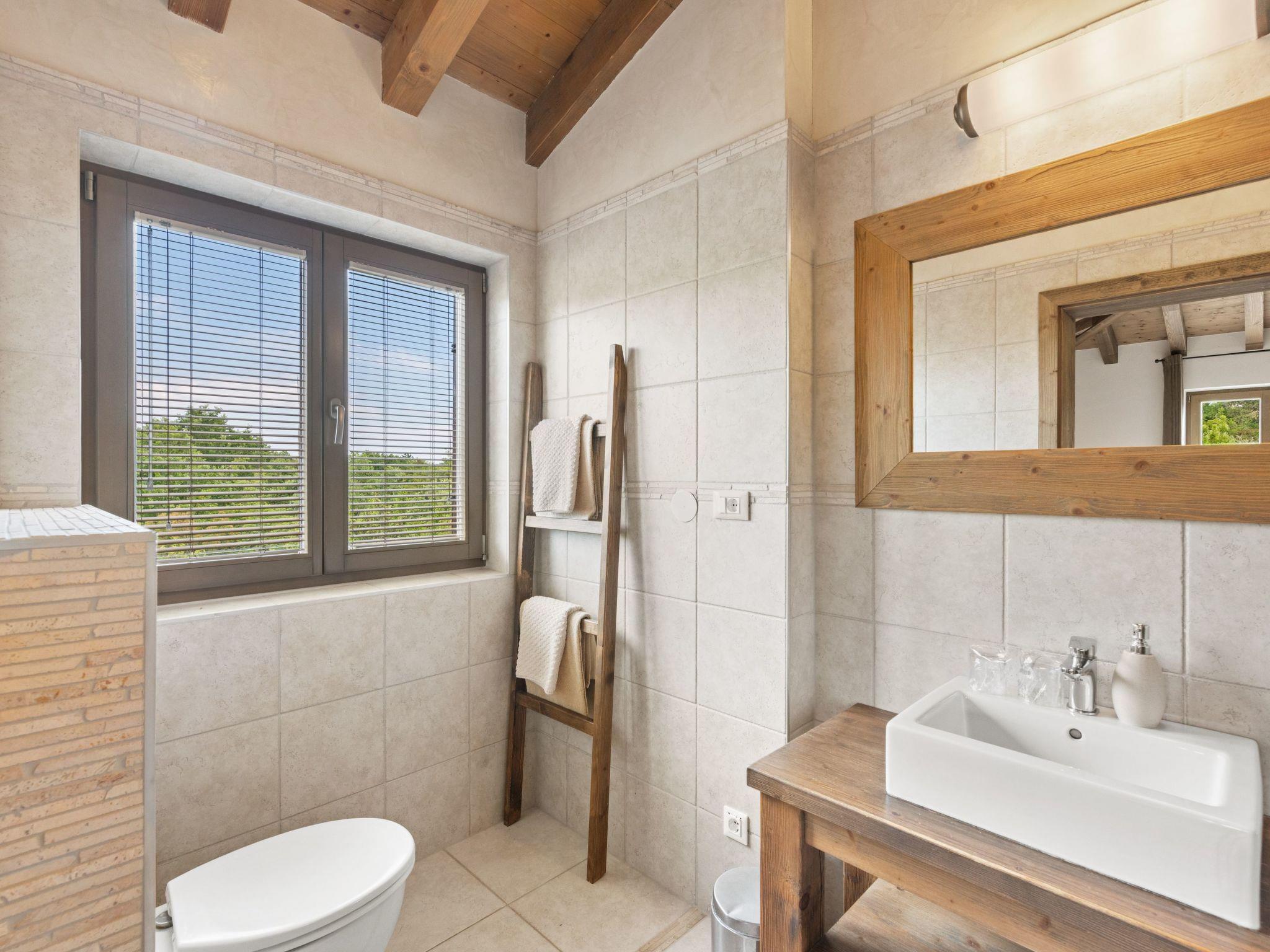 Inside, you will be greeted by a bright and friendly atmosphere characterised by the open-plan living, dining and kitchen area. A rustic wood-burning stove, beige-coloured sofa beds, a spacious dining area for 14 people and an exclusive corner kitchen with high-quality equipment, including a raised oven, microwave, dishwasher and much more, invite you to linger. The interior design, characterised by cream-coloured tiled floors with brown mosaic ornaments, brown roof beams and rustic, dark furniture, creates a warm and cosy country house atmosphere, which is rounded off by tasteful details and decorations.