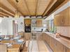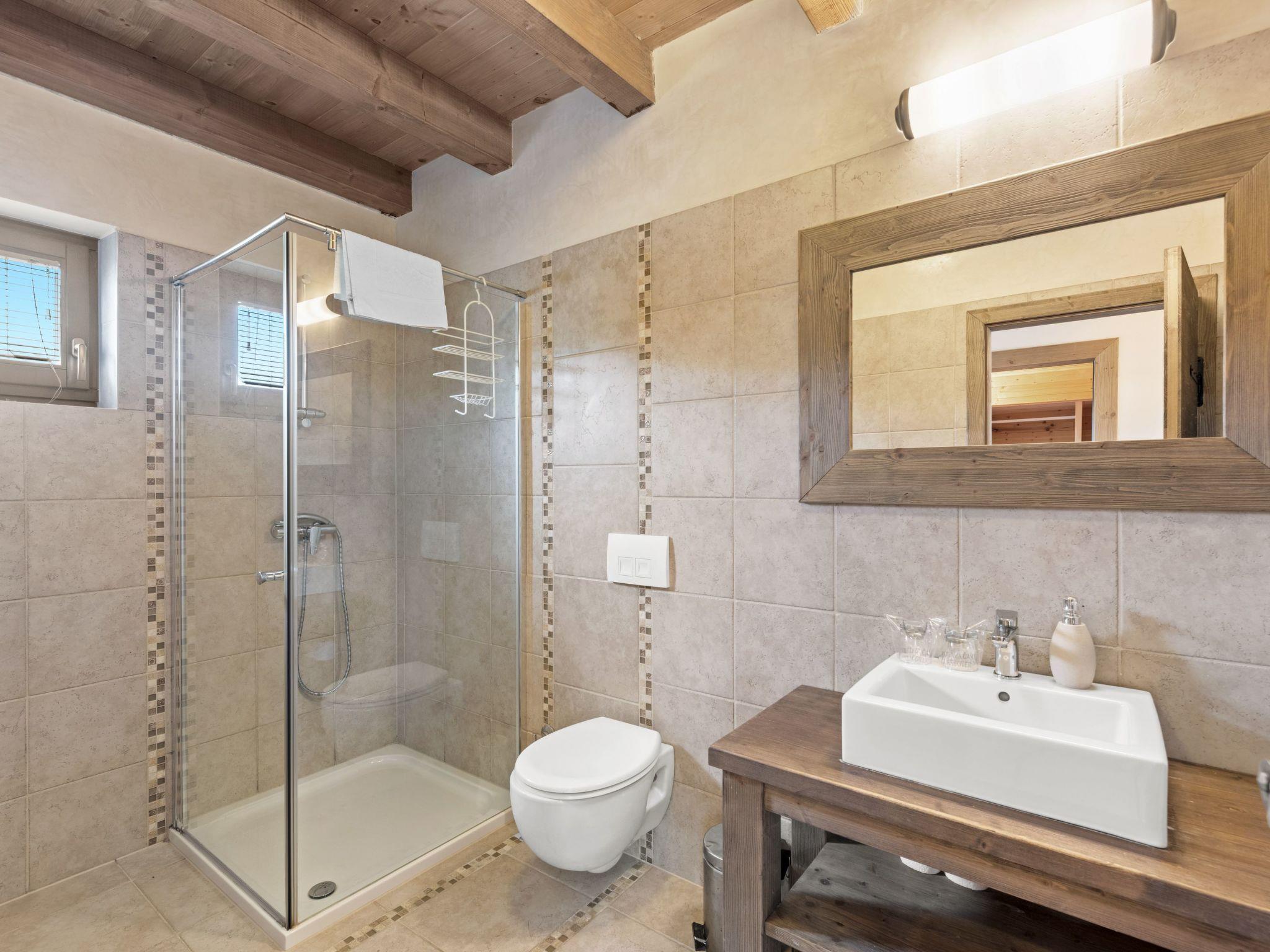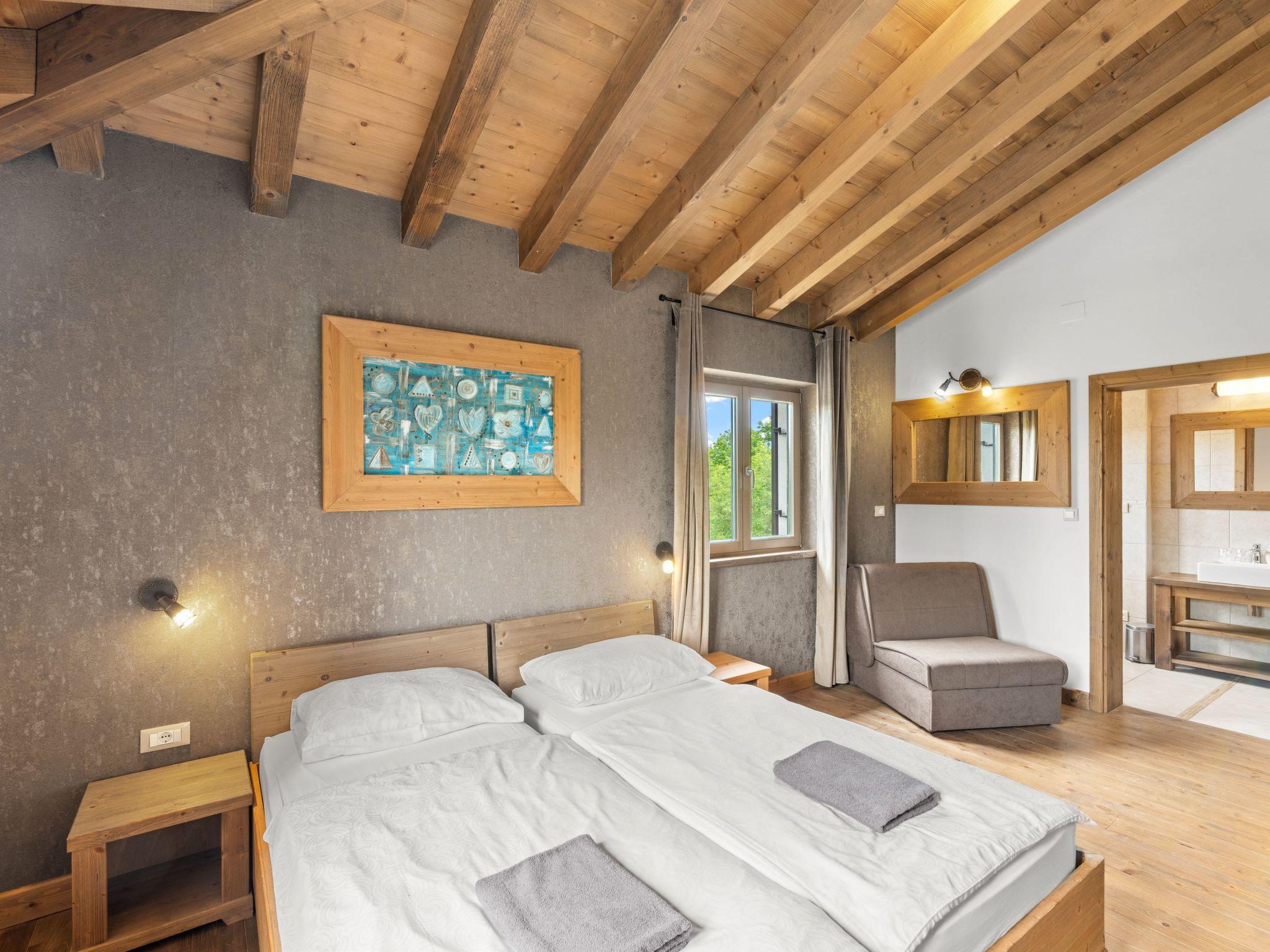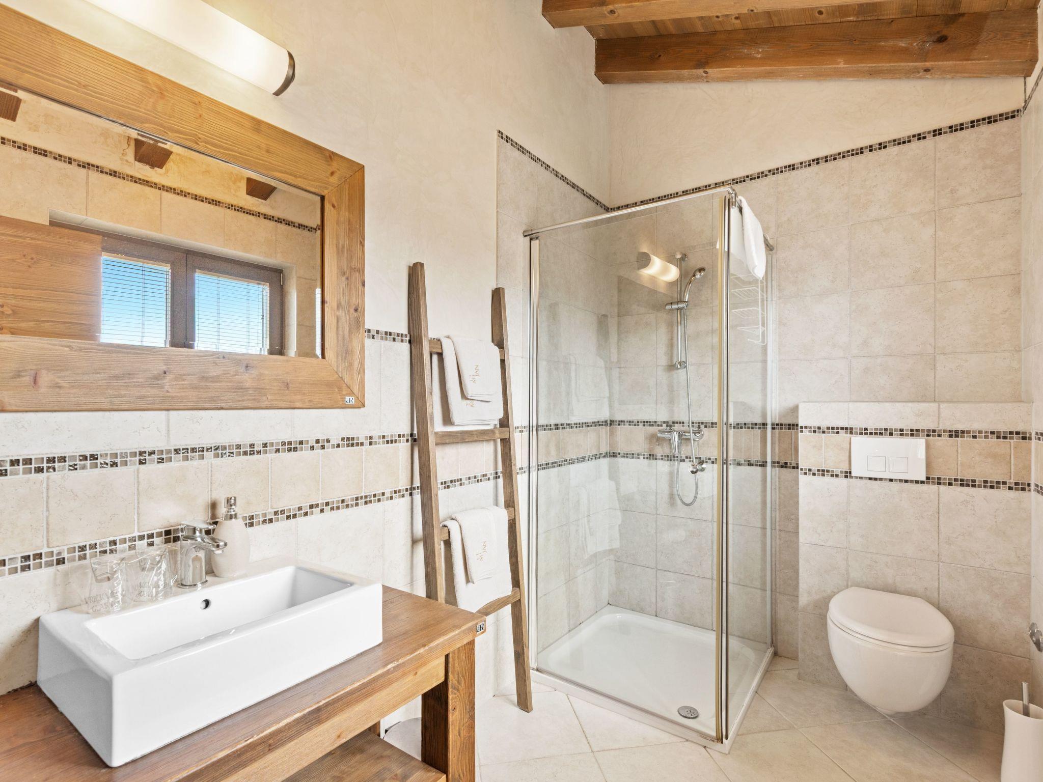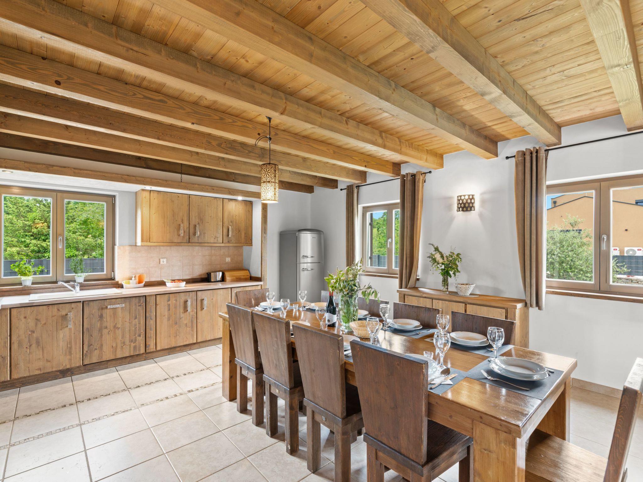 Inside, you will be greeted by a bright and friendly atmosphere characterised by the open-plan living, dining and kitchen area. A rustic wood-burning stove, beige-coloured sofa beds, a spacious dining area for 14 people and an exclusive corner kitchen with high-quality equipment, including a raised oven, microwave, dishwasher and much more, invite you to linger. The interior design, characterised by cream-coloured tiled floors with brown mosaic ornaments, brown roof beams and rustic, dark furniture, creates a warm and cosy country house atmosphere, which is rounded off by tasteful details and decorations.