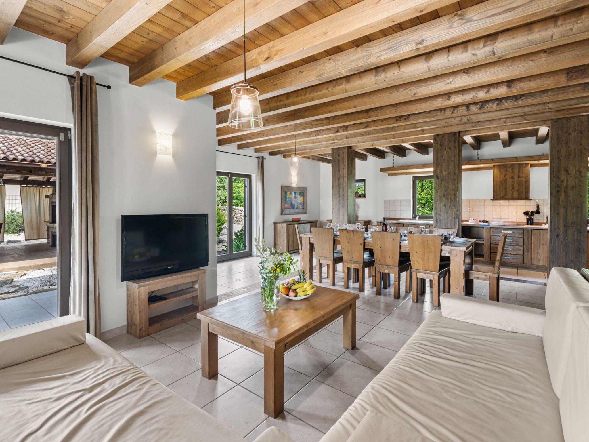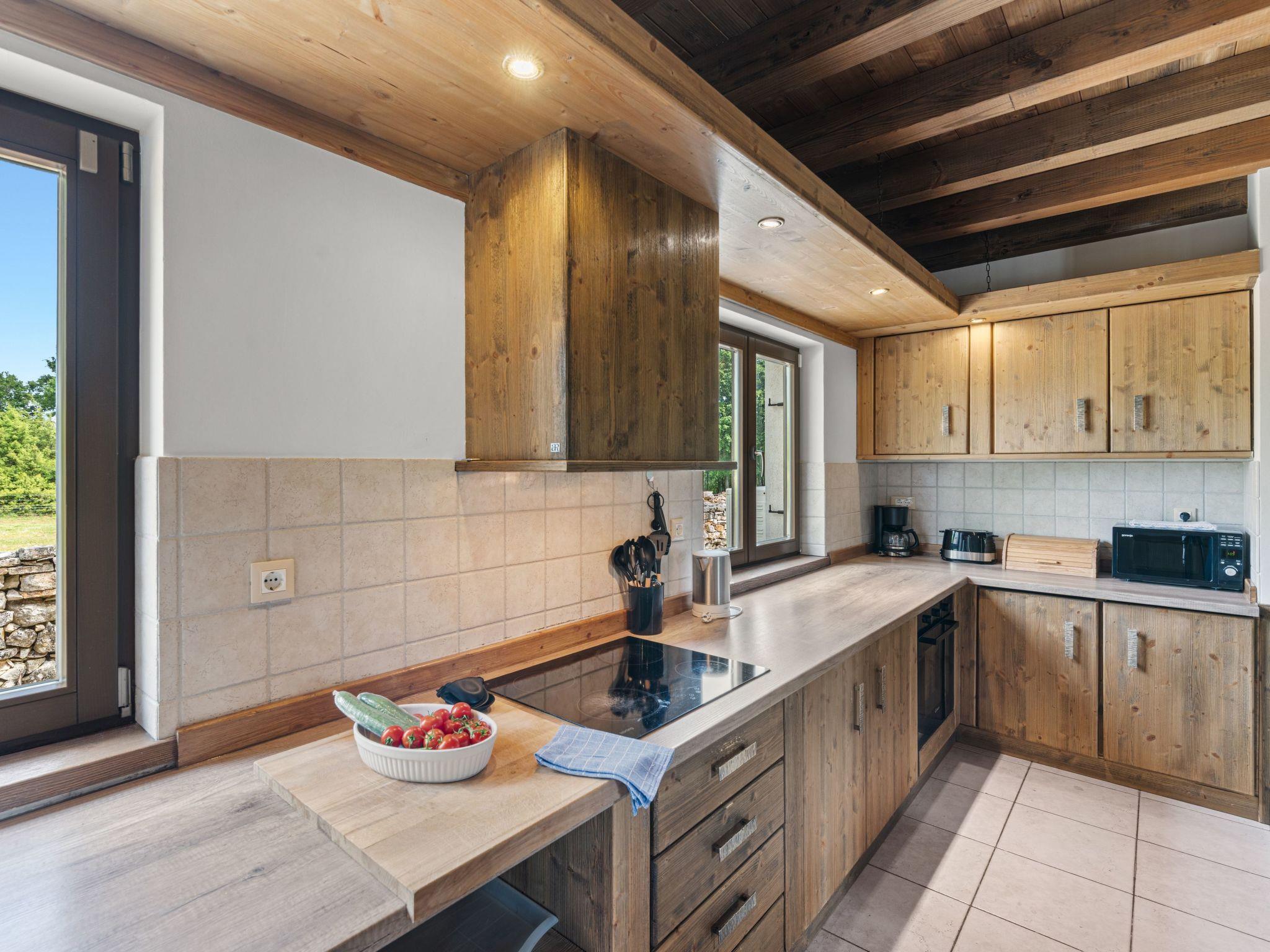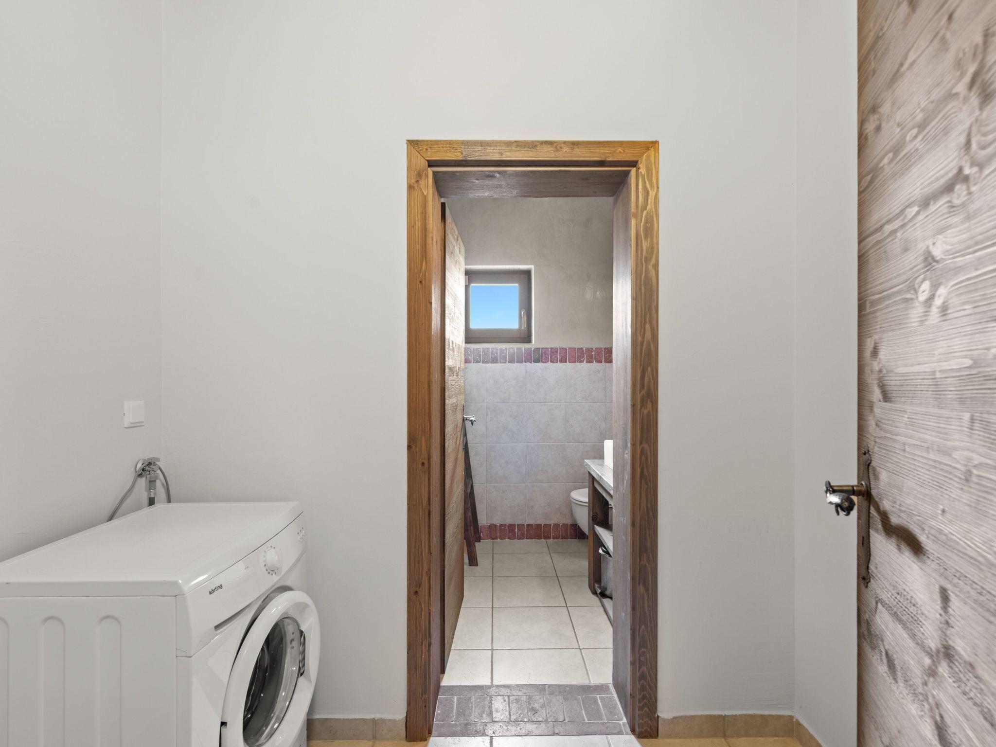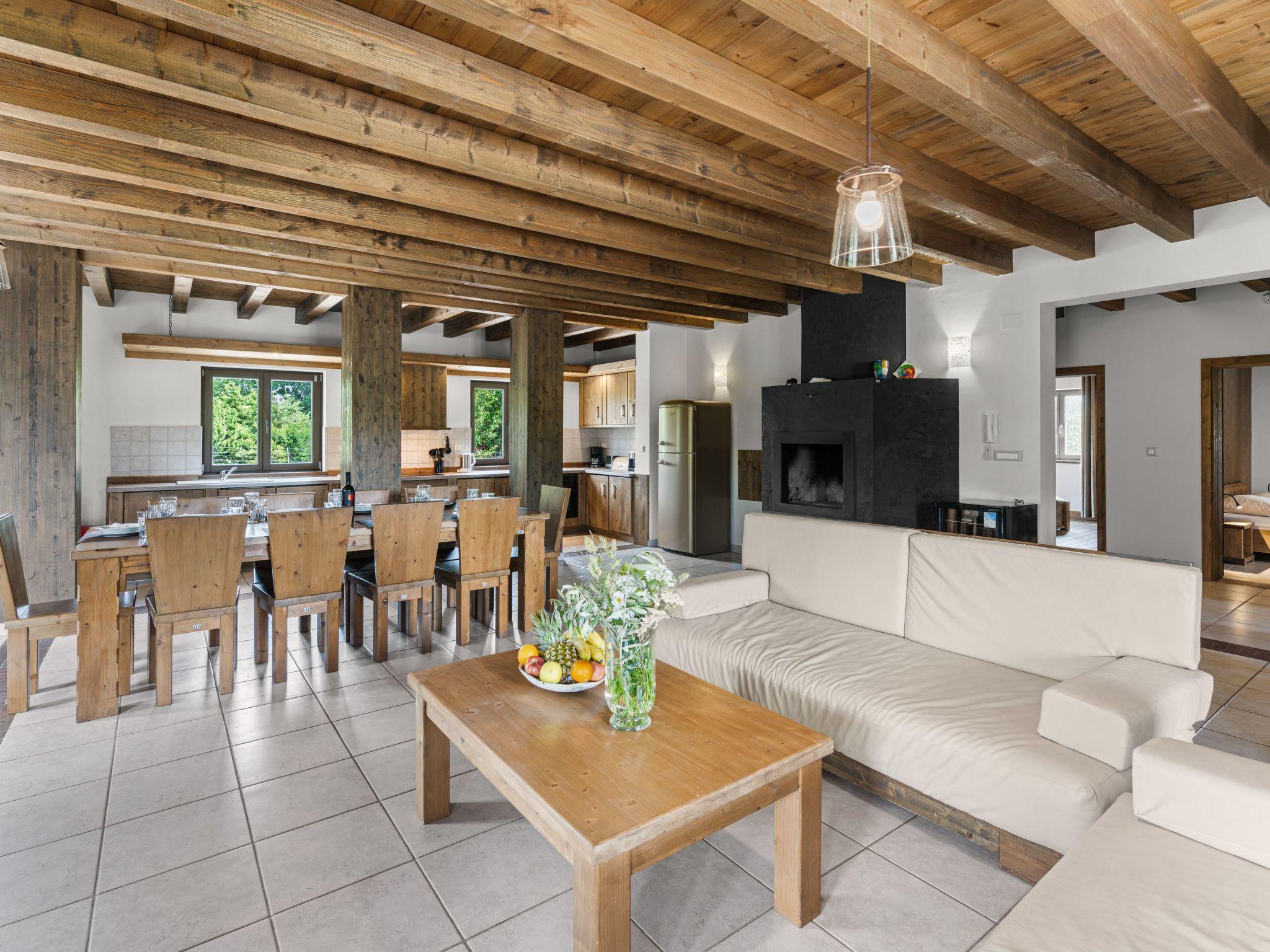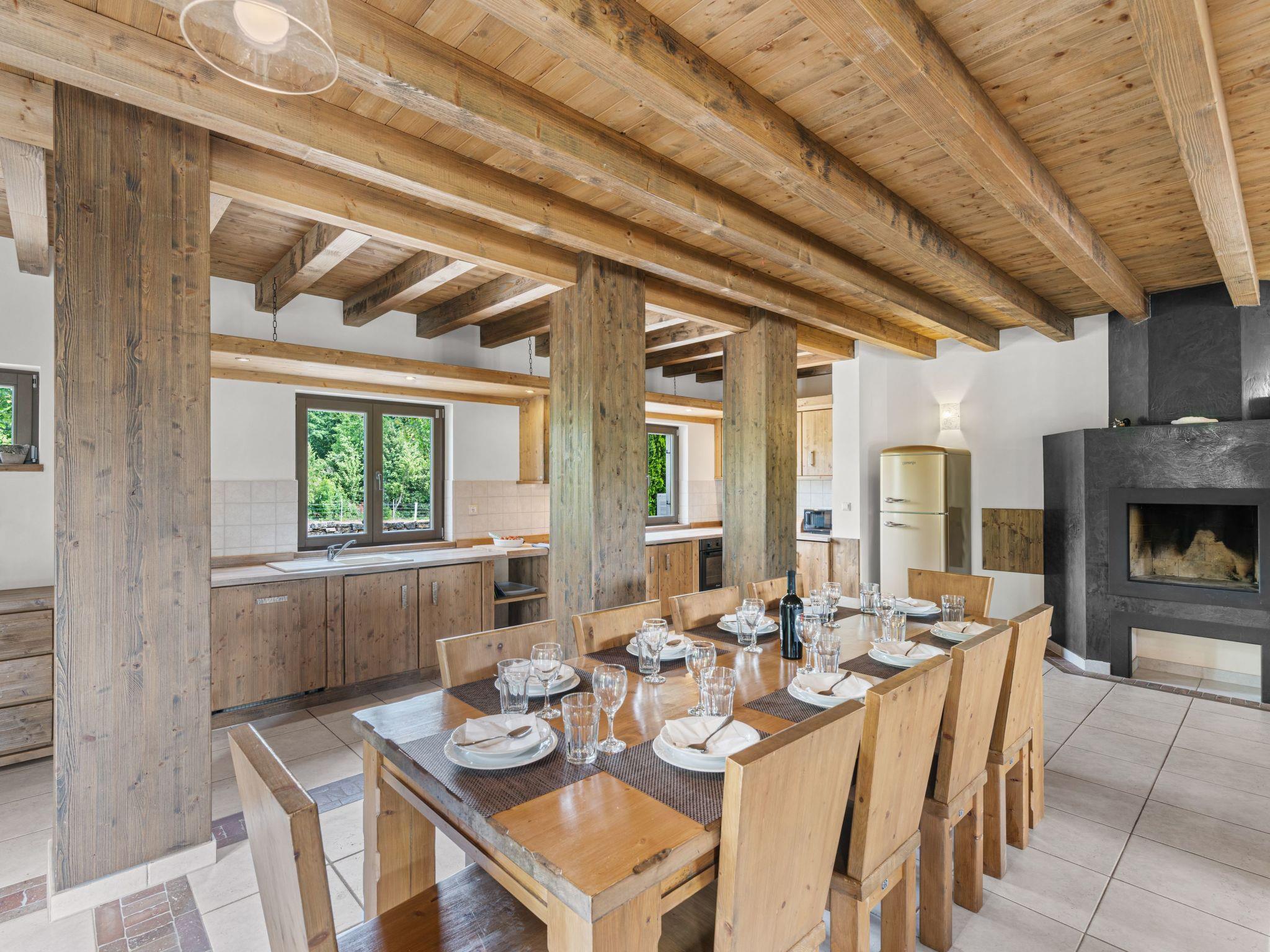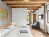 Inside, guests can expect an open-plan concept that conveys a spacious and airy atmosphere. Three wooden pillars separate the living area from the kitchen area, which invites guests to socialise with a large dining table and oversized sofa beds. A modern wood-burning fireplace provides cosy warmth on cool evenings. The entire villa is furnished with functional tiles, linen curtains and rustic roof beams - perfect for the unique country house look.