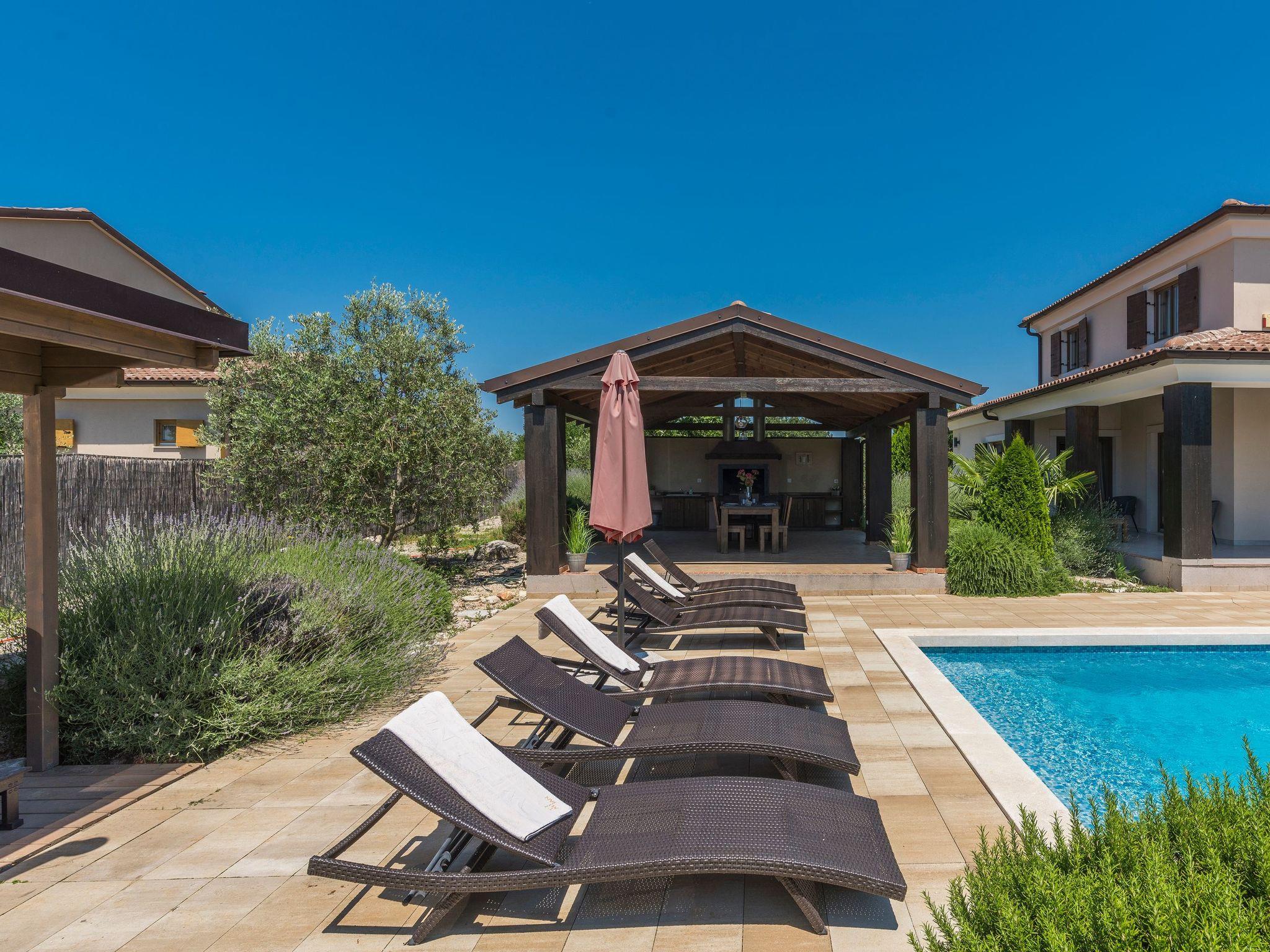 The exterior design leaves nothing to be desired: A private pool area with sun loungers, a spacious wooden terrace, a fine swimming pool and a covered summer kitchen with barbecue grill and dining area ensure unforgettable moments in the open air. The lovingly landscaped garden with green areas, gravel beds and a natural stone wall emphasises the Mediterranean ambience and offers plenty of space for personal development.