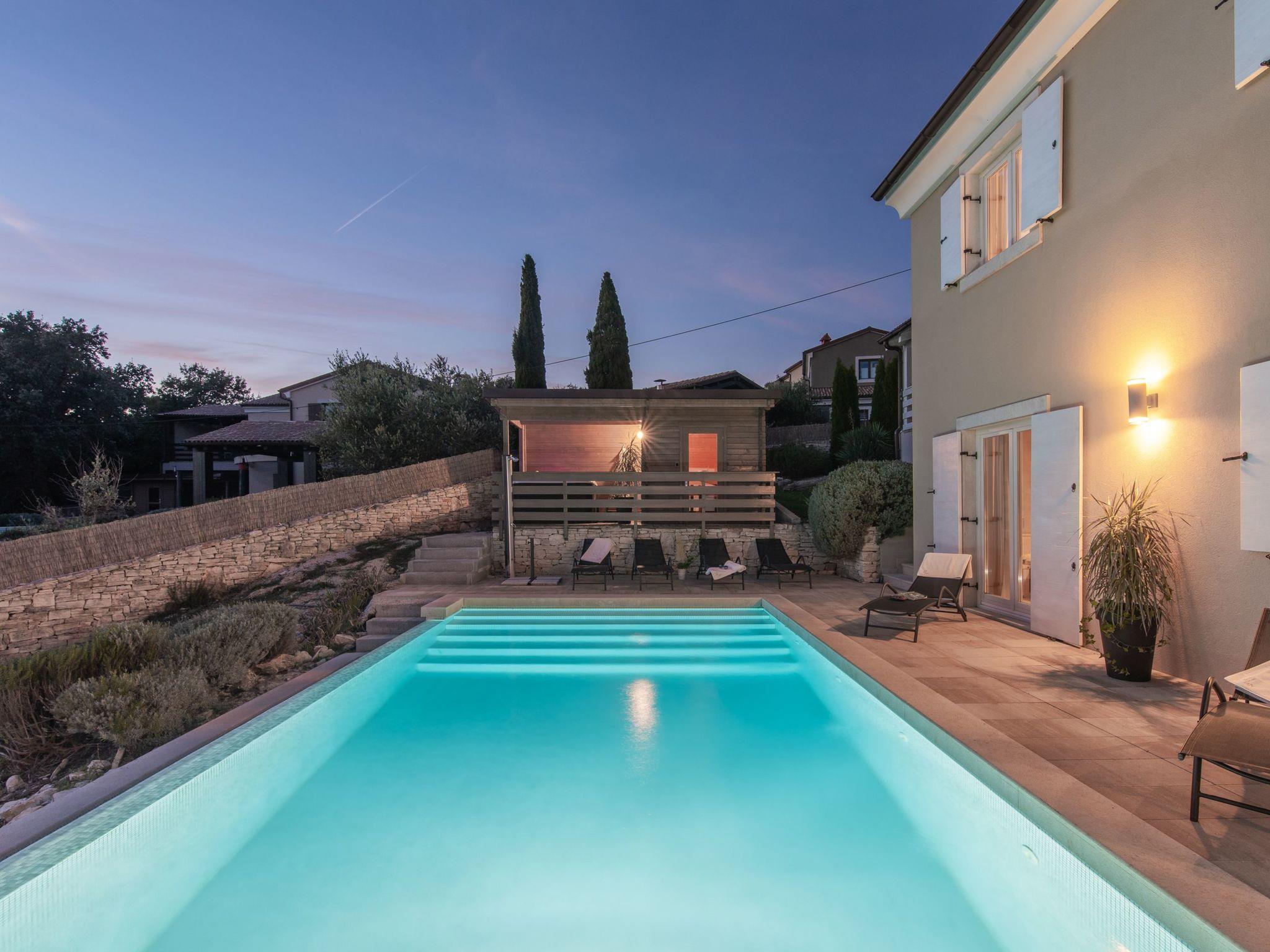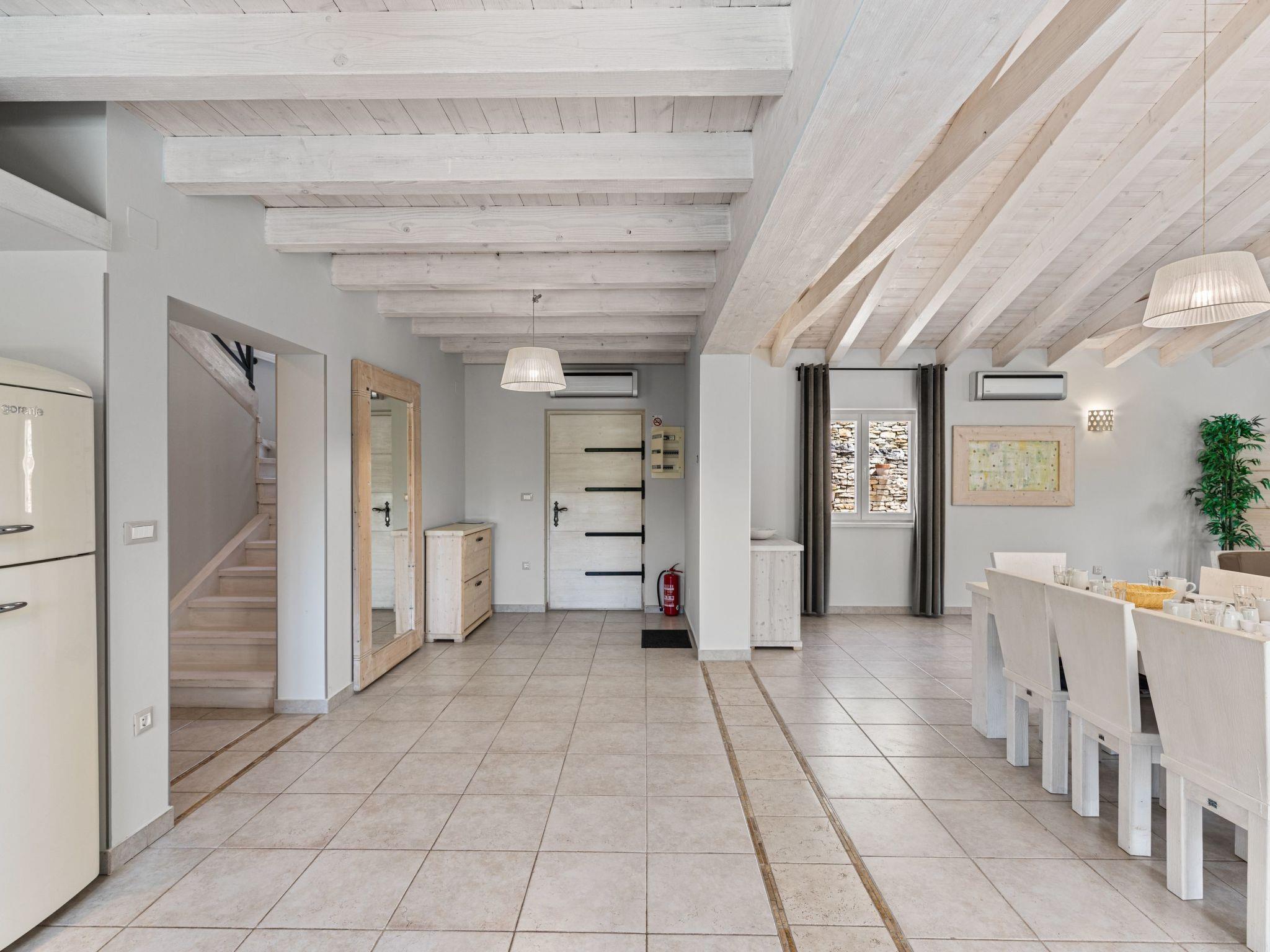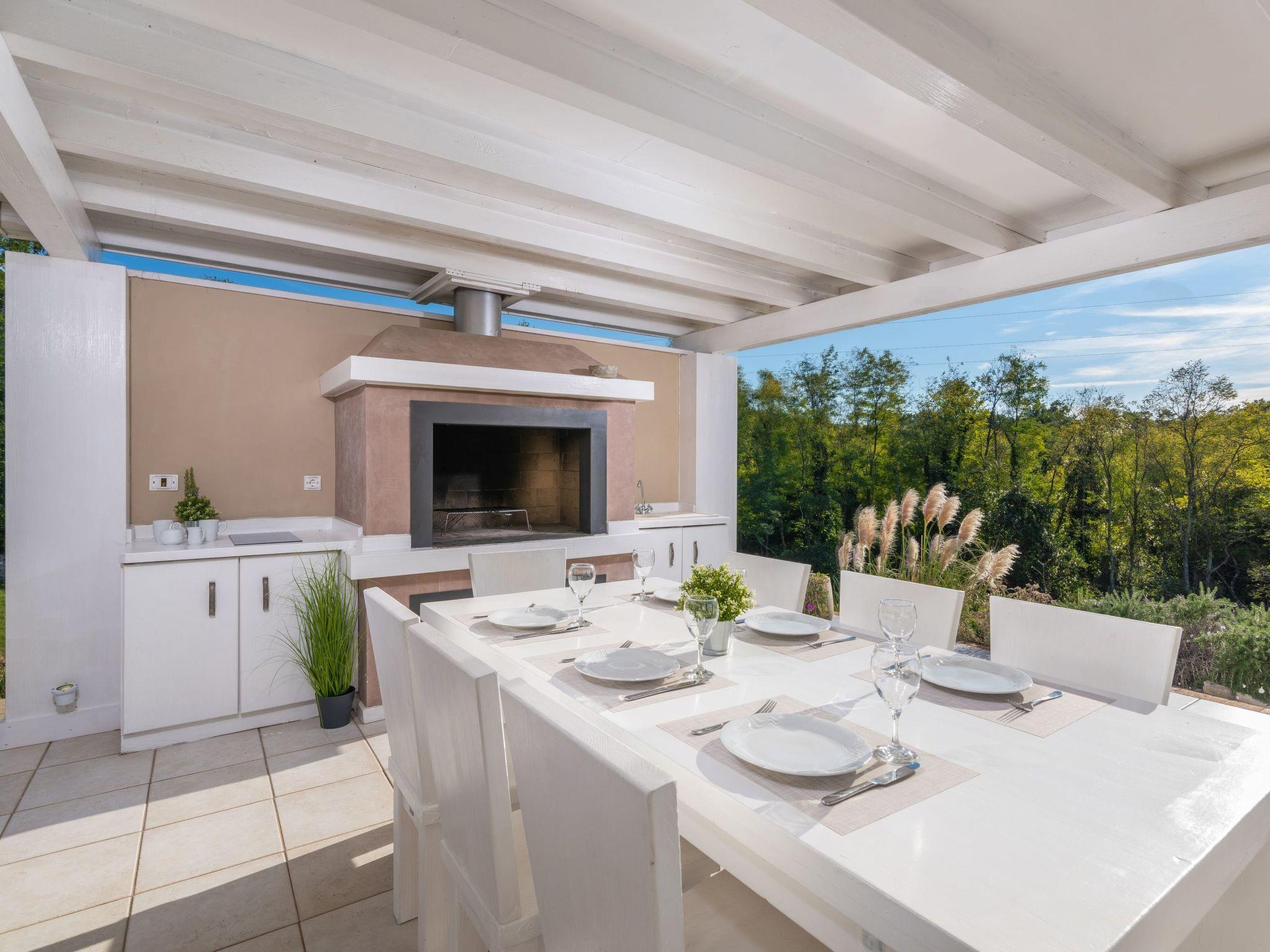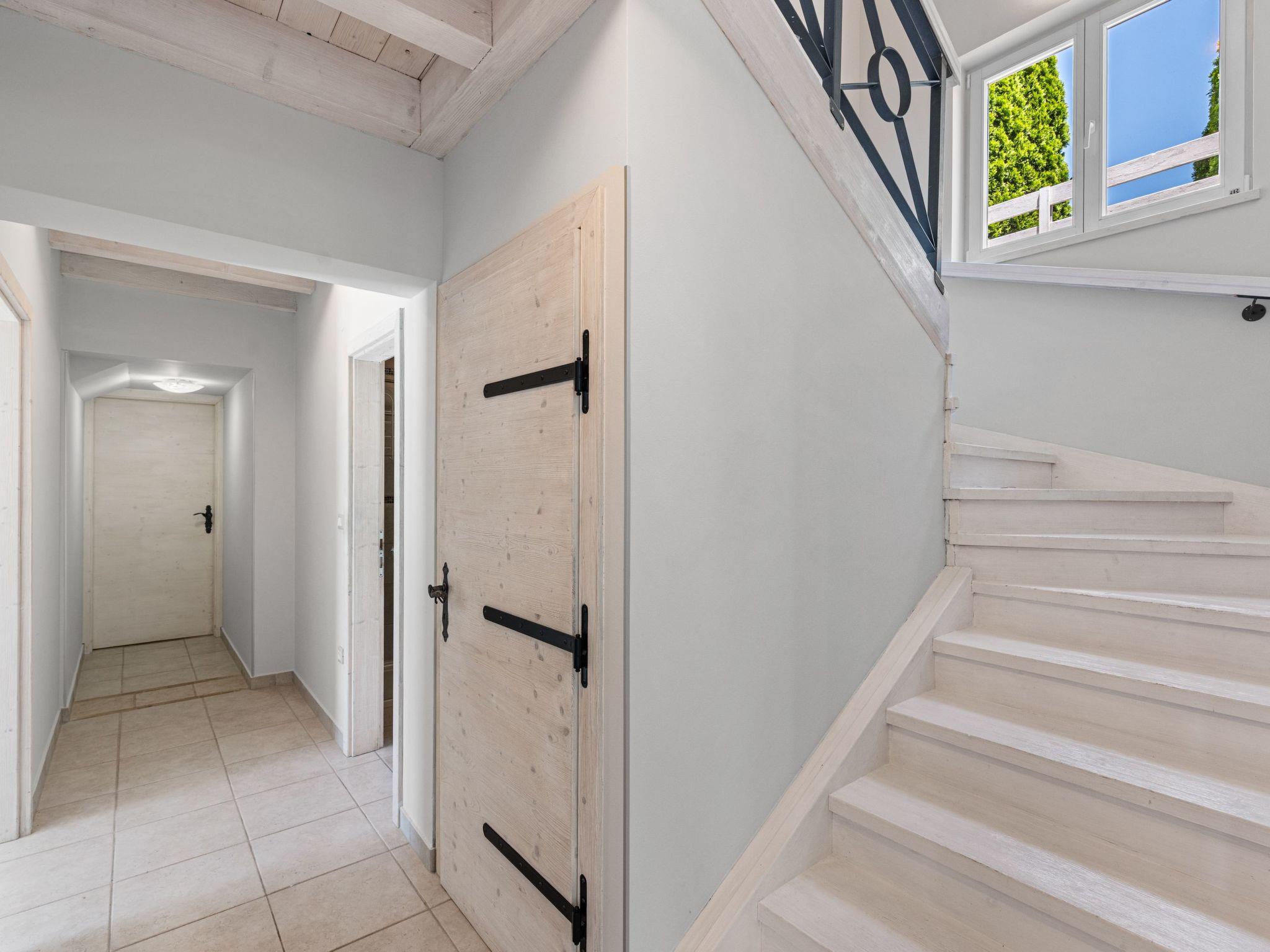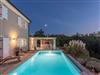 The outdoor area is an oasis of relaxation with a spacious sunbathing terrace, a pastel blue pool and a stone terrace with a rustic dining area for unforgettable evening barbecues. The outdoor kitchen and barbecue, the illuminated pool atmosphere and the summery lanterns create the perfect holiday feeling. In addition, the solid window and door shutters exude Mediterranean flair and emphasise the character of the villa.