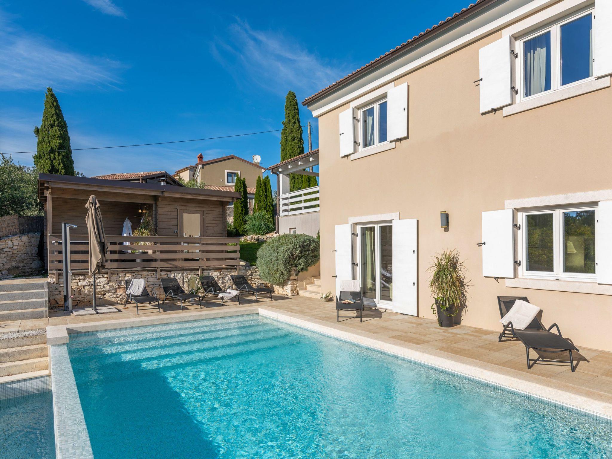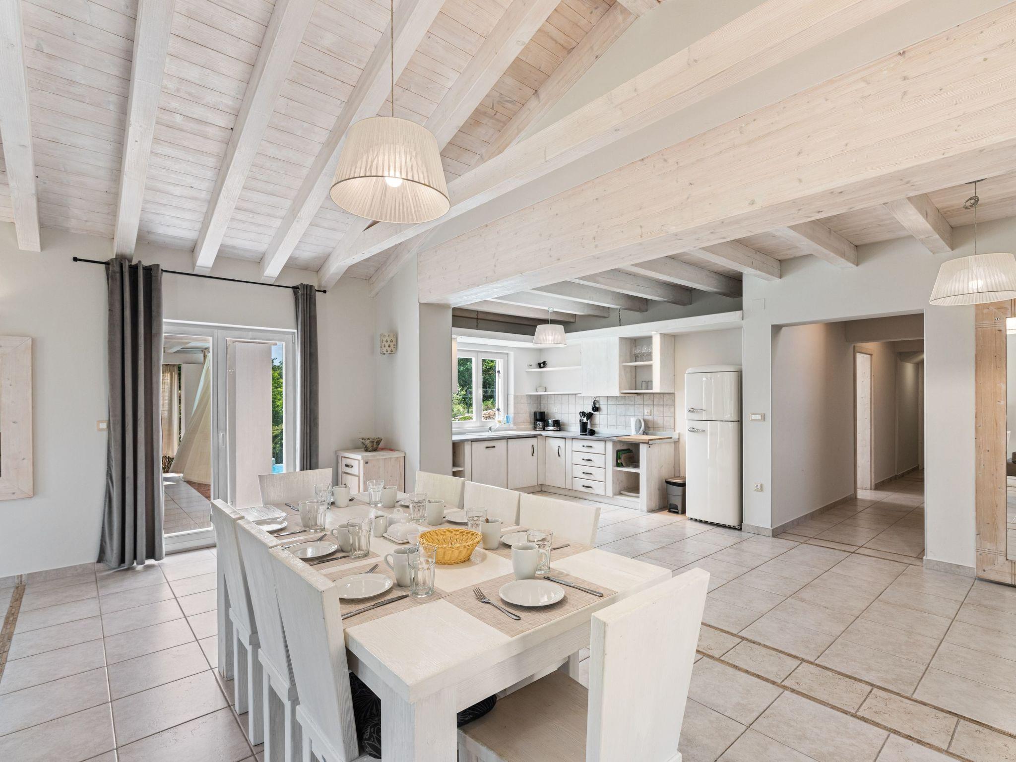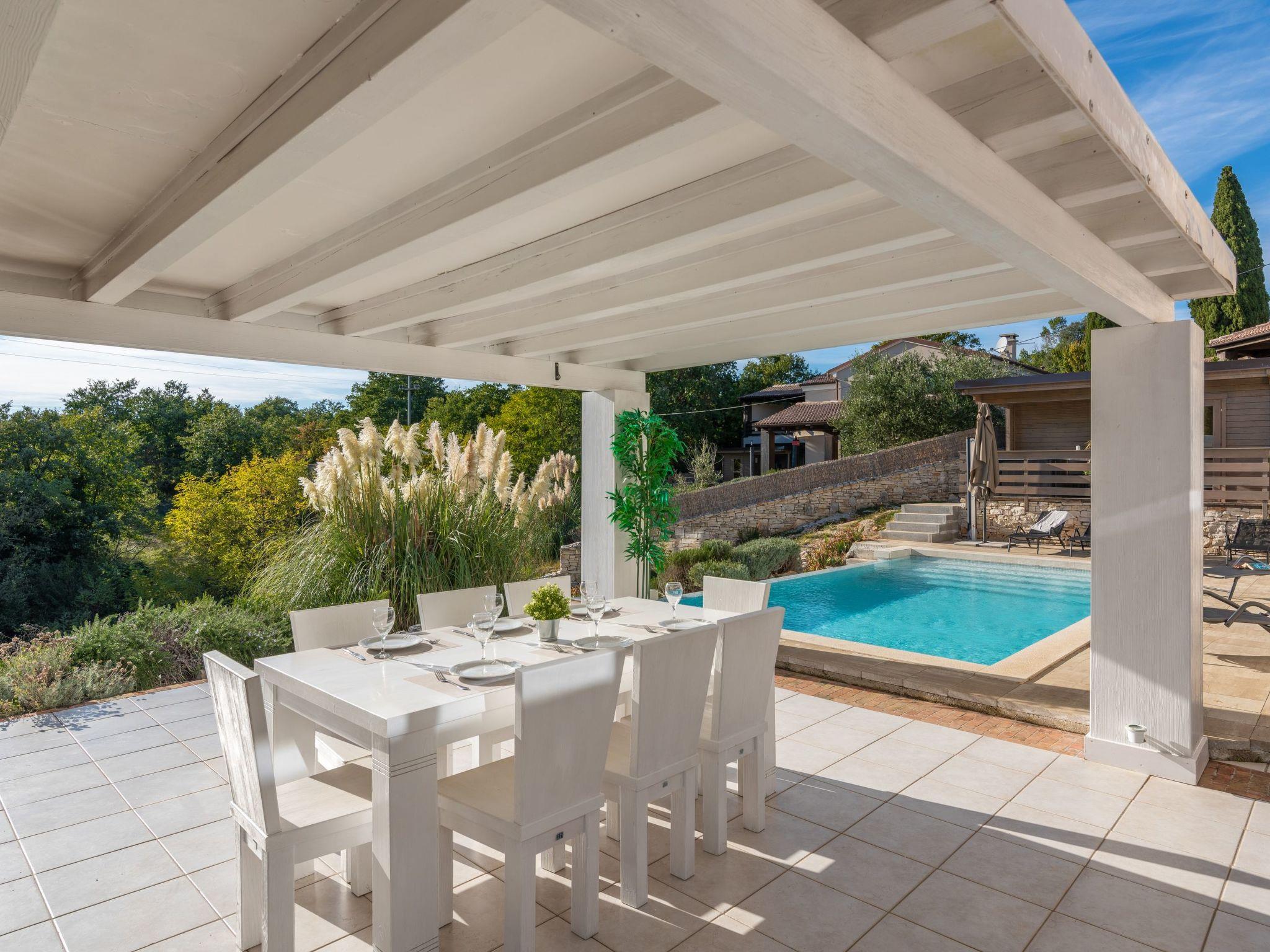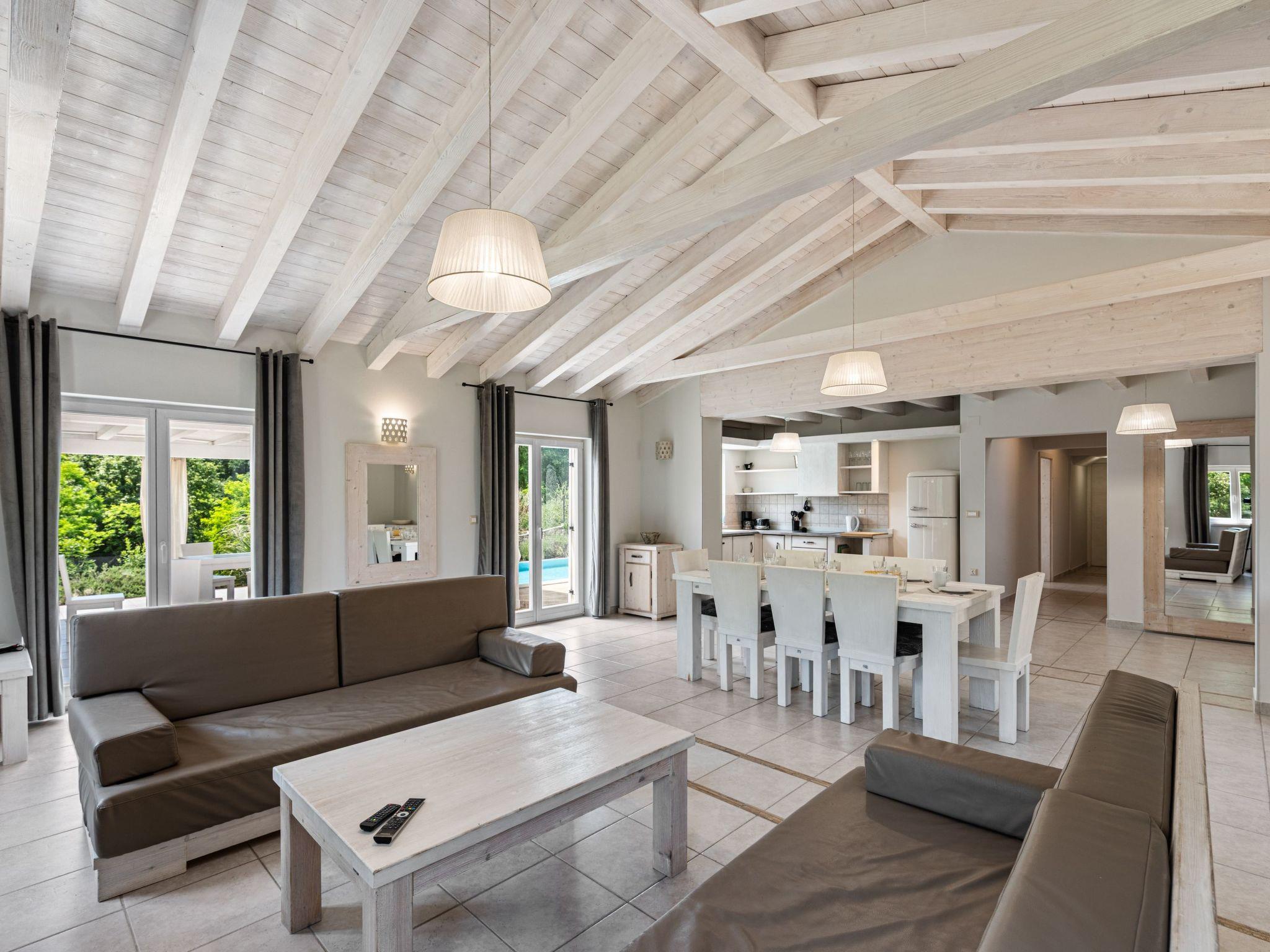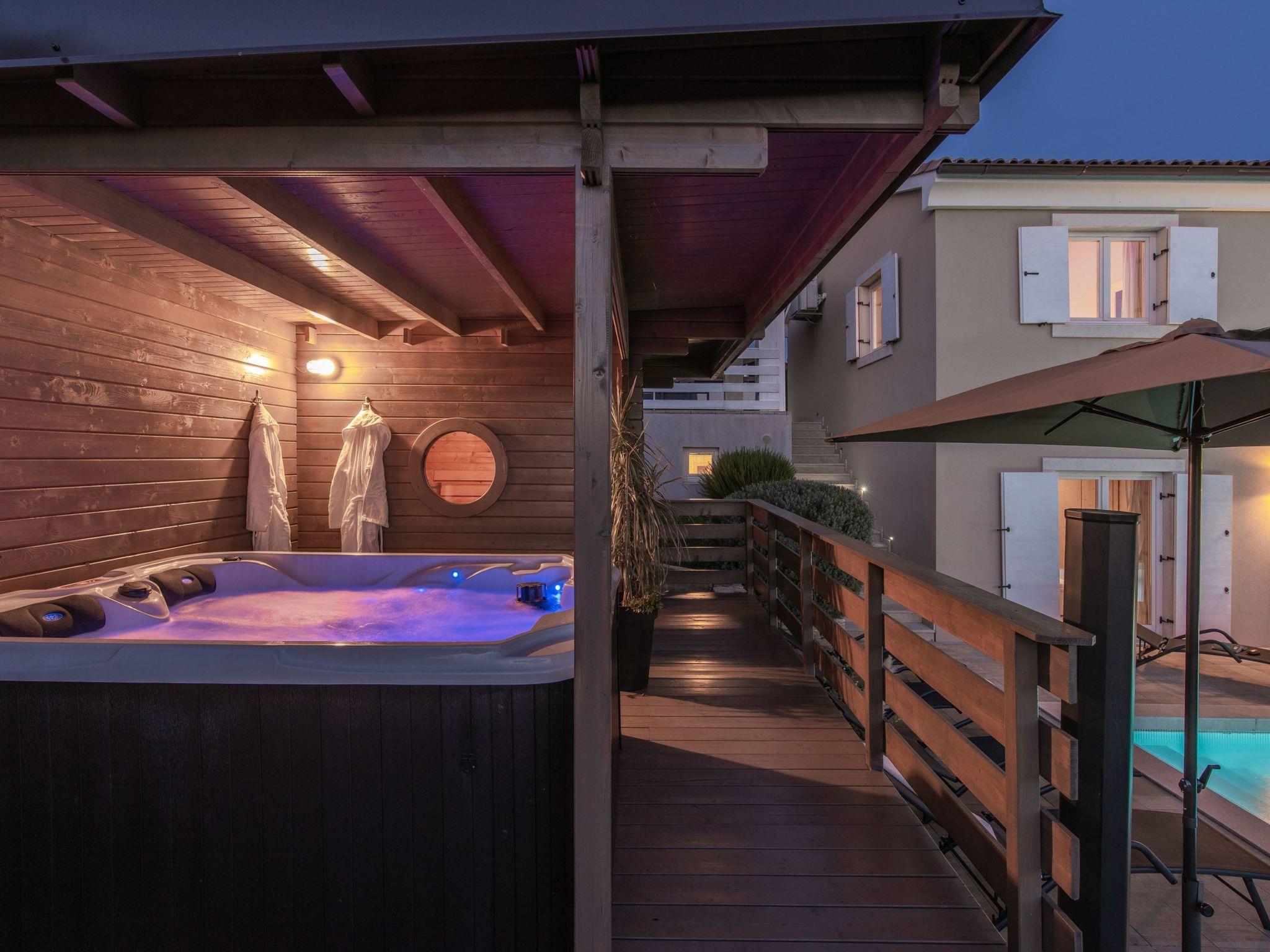 The outdoor area is an oasis of relaxation with a spacious sunbathing terrace, a pastel blue pool and a stone terrace with a rustic dining area for unforgettable evening barbecues. The outdoor kitchen and barbecue, the illuminated pool atmosphere and the summery lanterns create the perfect holiday feeling. In addition, the solid window and door shutters exude Mediterranean flair and emphasise the character of the villa.