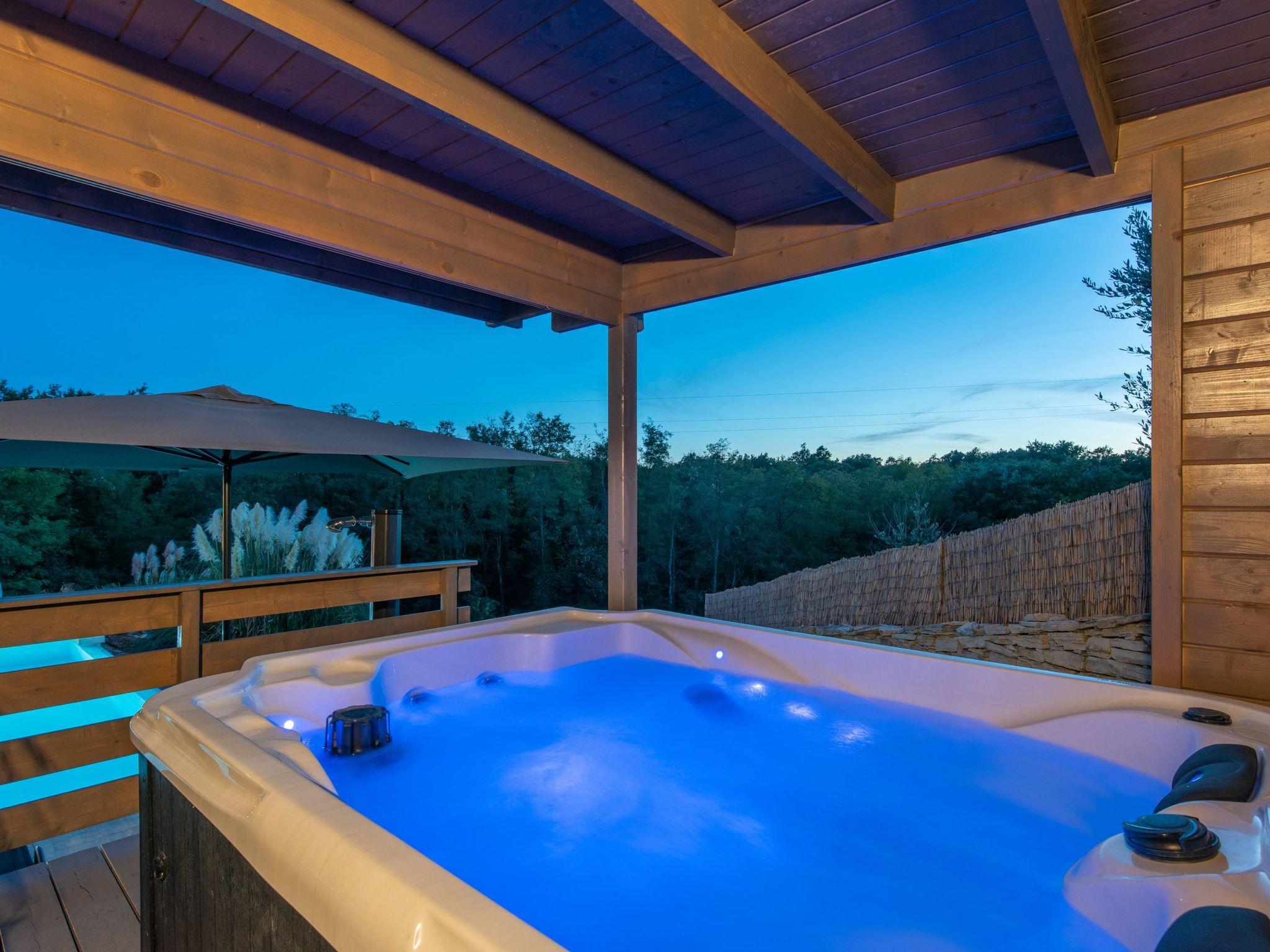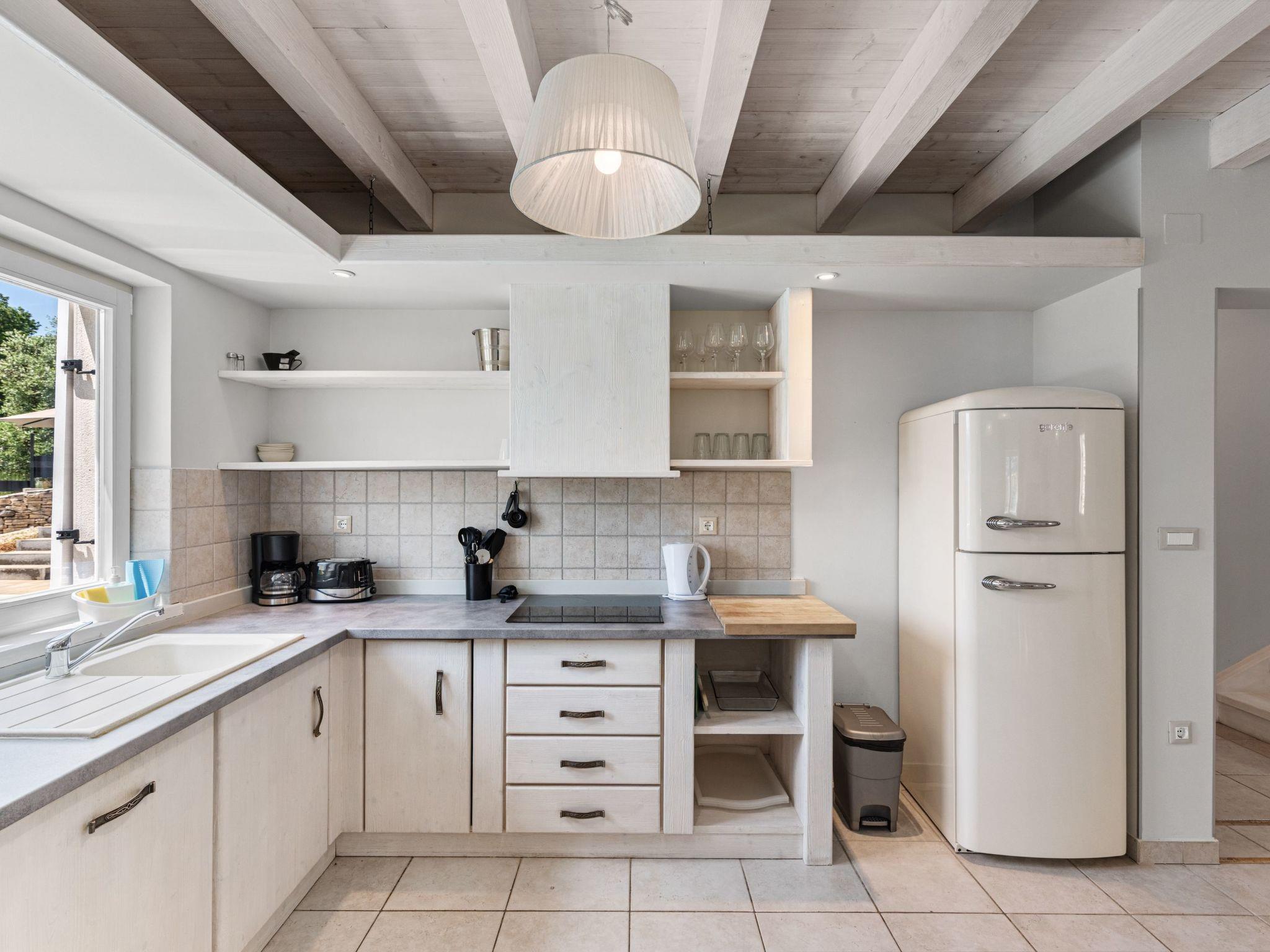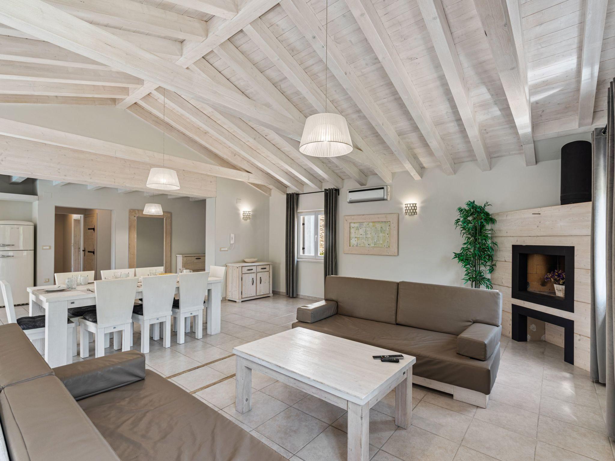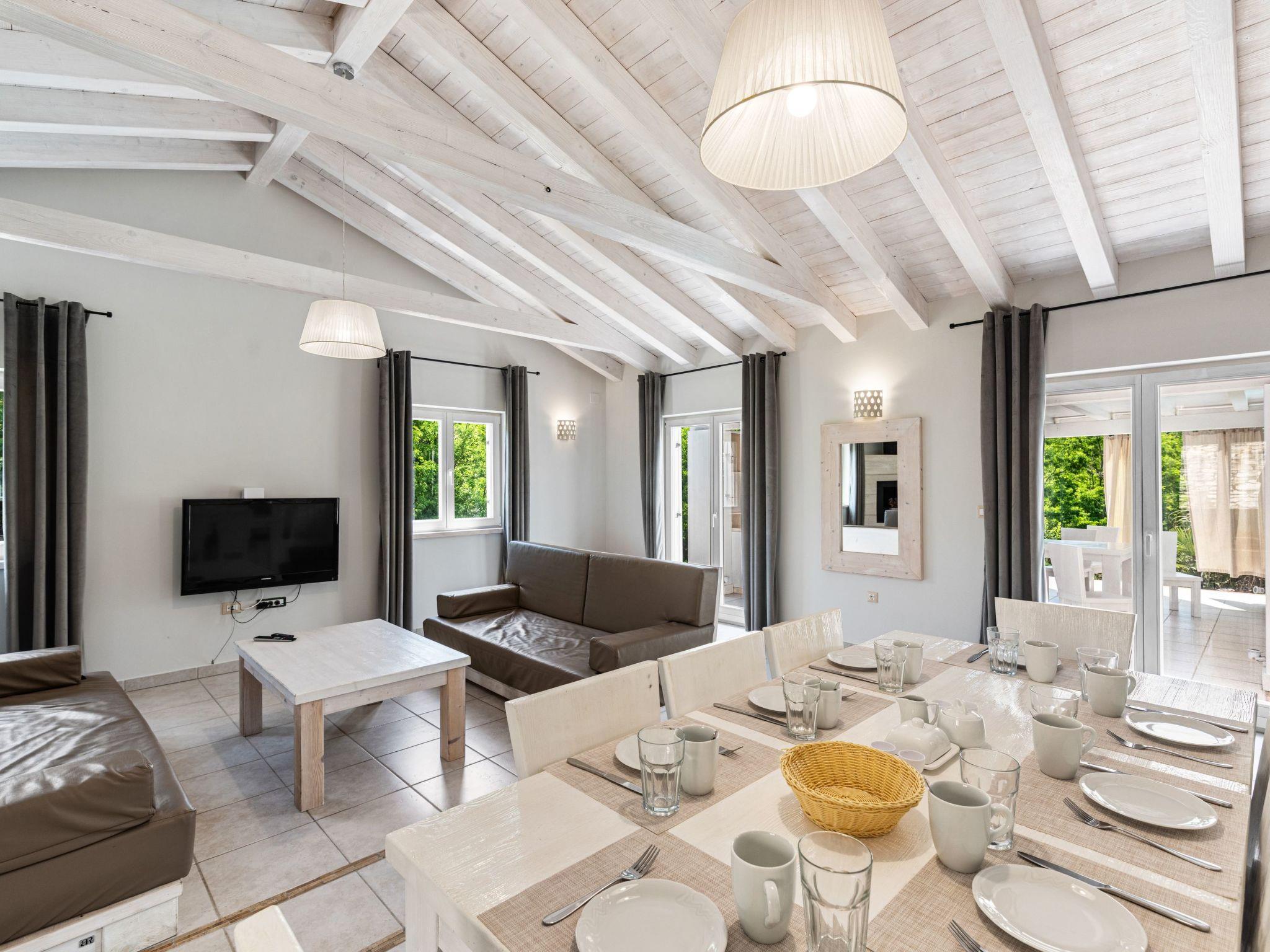 The outdoor area is an oasis of relaxation with a spacious sunbathing terrace, a pastel blue pool and a stone terrace with a rustic dining area for unforgettable evening barbecues. The outdoor kitchen and barbecue, the illuminated pool atmosphere and the summery lanterns create the perfect holiday feeling. In addition, the solid window and door shutters exude Mediterranean flair and emphasise the character of the villa.