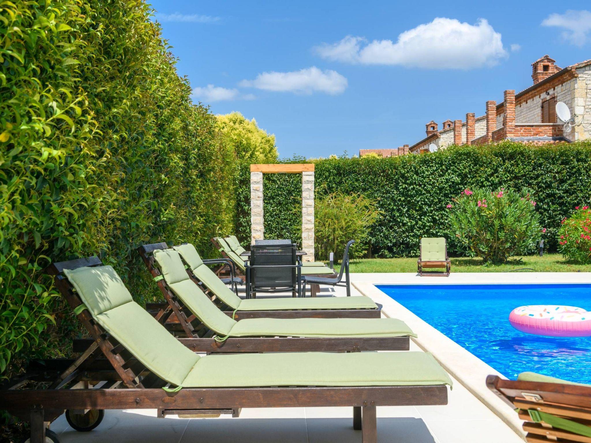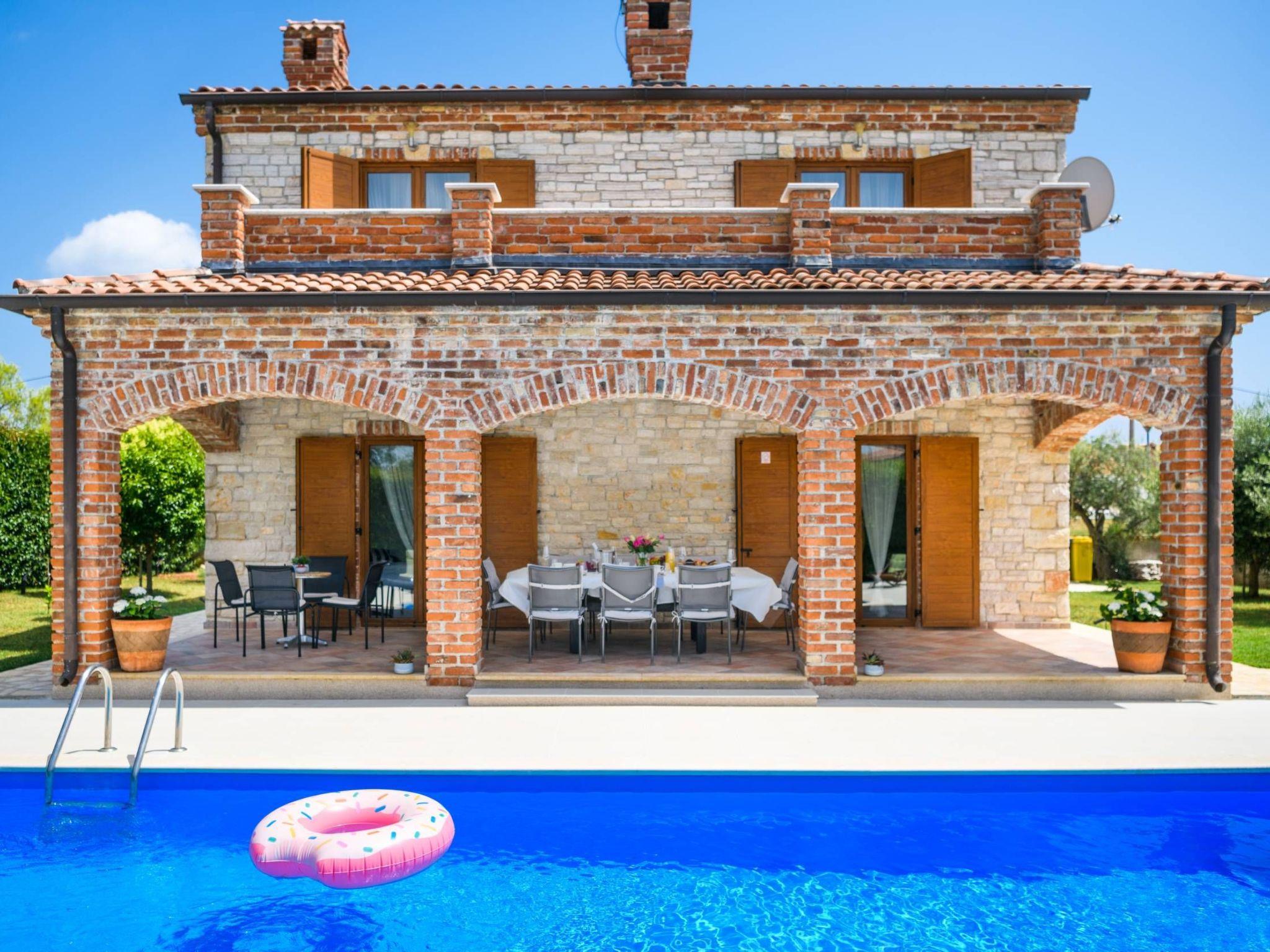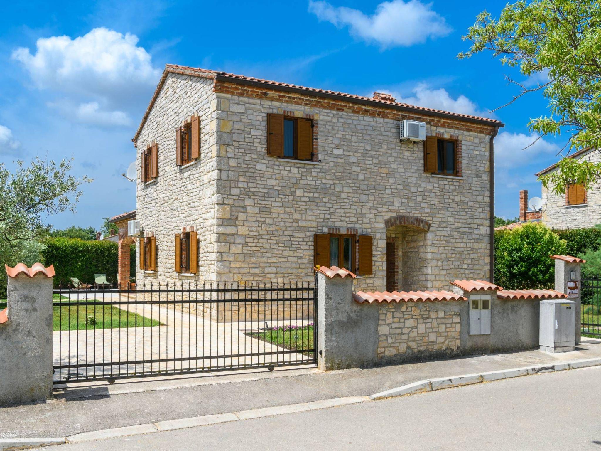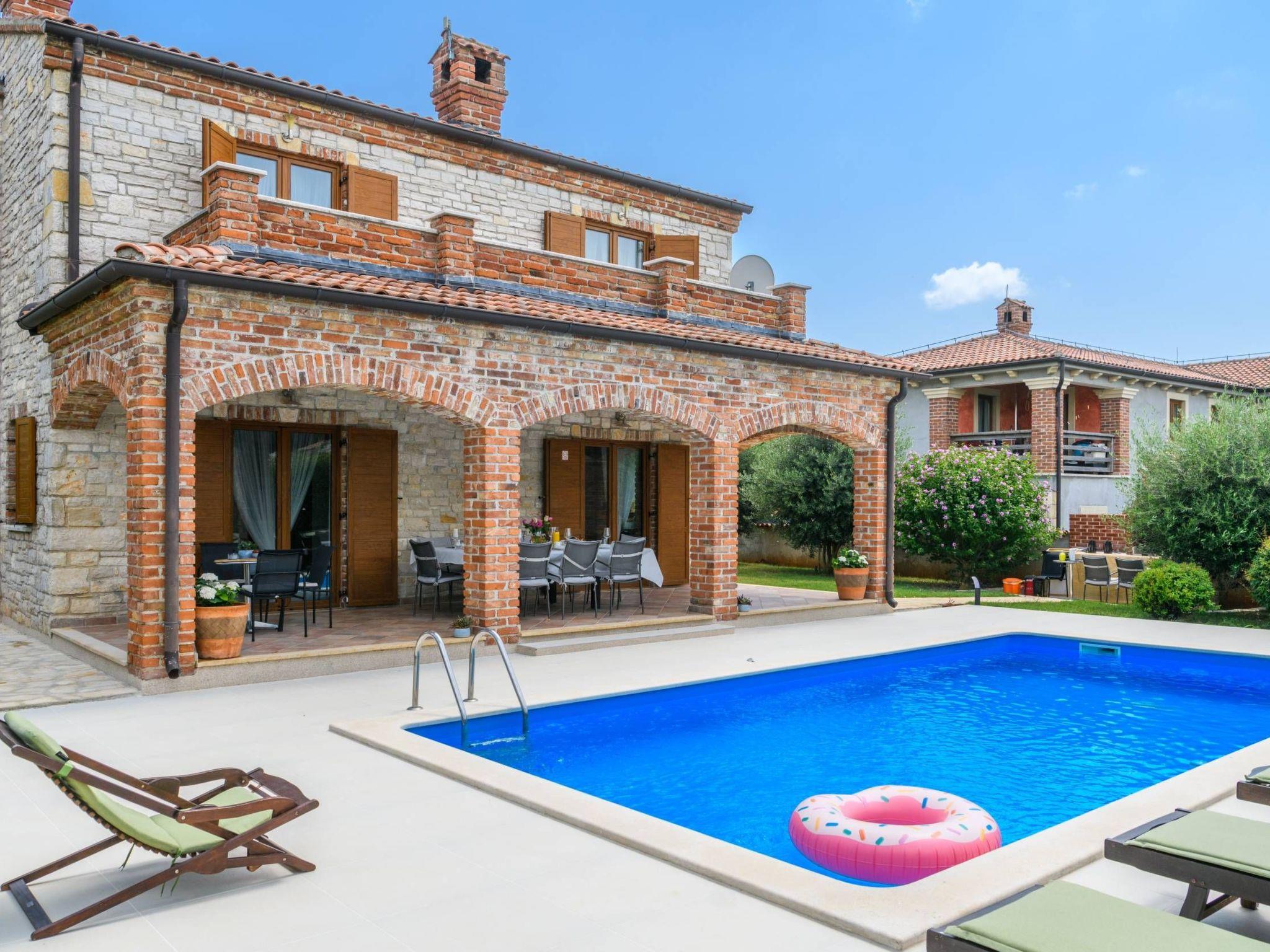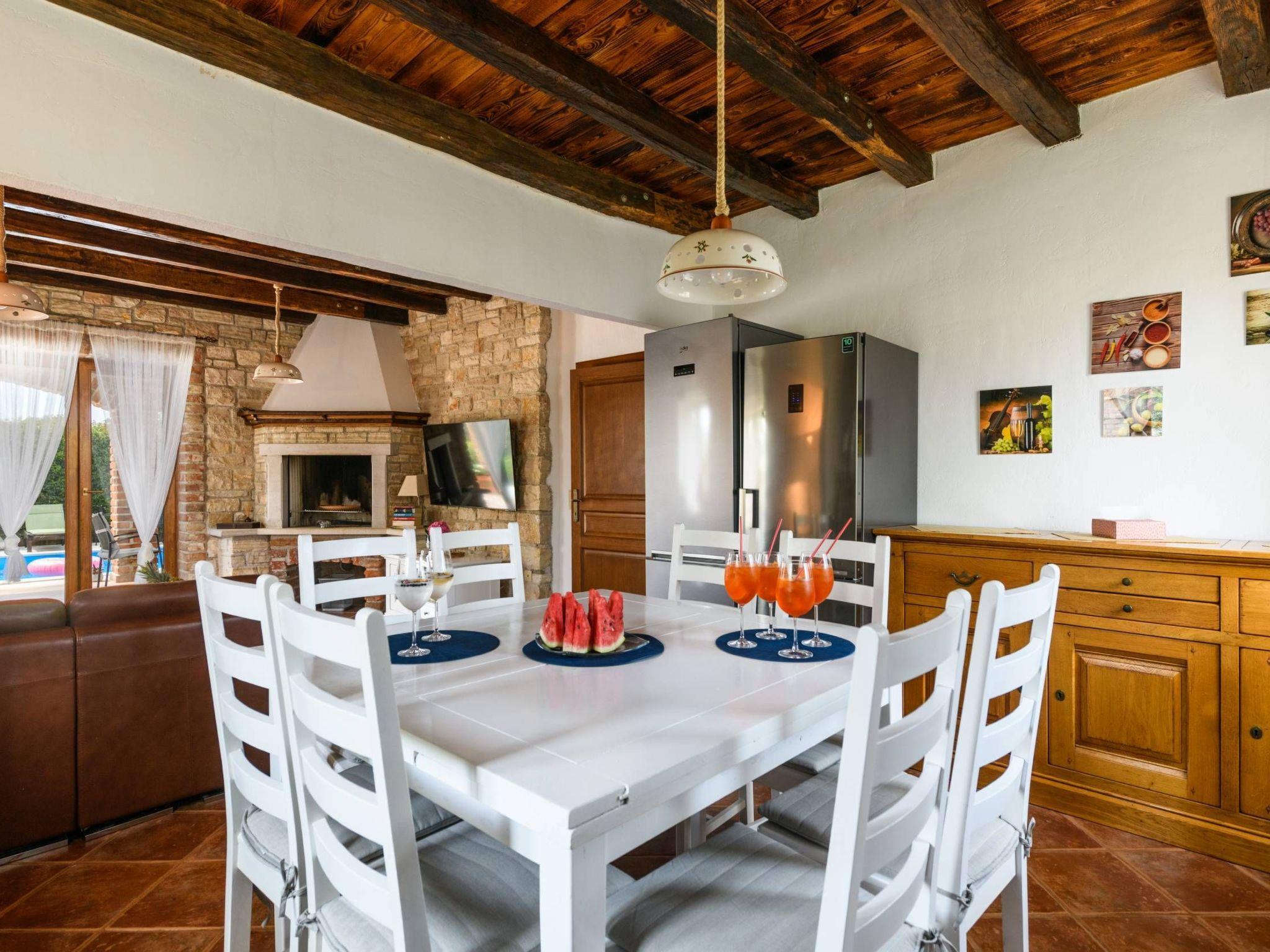 Villa Amani is a four-room holiday home with a private pool. It is located in the quiet tourist resort of Paradiž, near Vodnjan. Villa Amani is in the neighborhood of numerous holiday villas, and is completely fenced.The outdoor area of ??the house offers a private pool, barbecue and covered terrace.Out of a total of four rooms, three bedrooms have double beds. The fourth room contains two single beds. Two rooms have access to the balcony.Two bathrooms are equipped with a shower, toilet and sink.In the fully equipped kitchen there is also a table where 8 people can dine comfortably.Among the kitchen appliances, we would highlight the dishwasher, oven and two large refrigerators.The living room has a corner sofa, an indoor fireplace and a TV with satellite channels.The living room leads to the terrace, which contains a large table for eight people and a small table for afternoon coffee with four chairs.The house is equipped with 2 air conditioners, a washing machine, WiFi internet connection and satellite television.