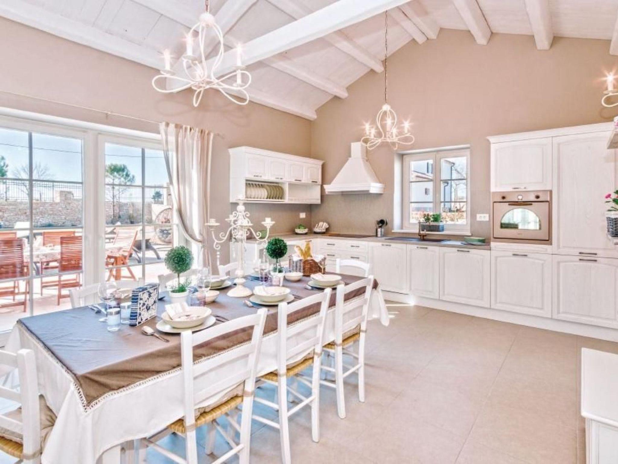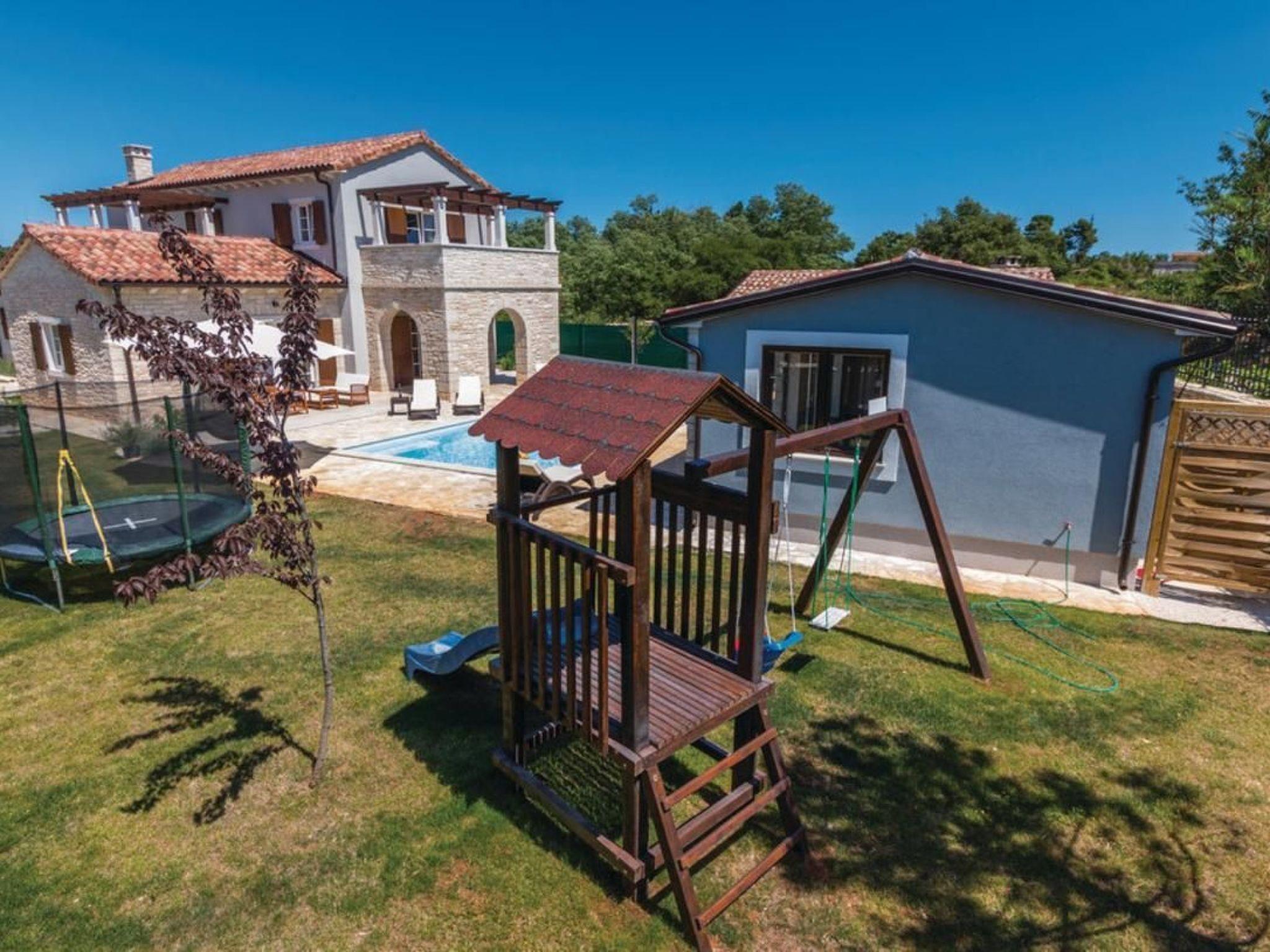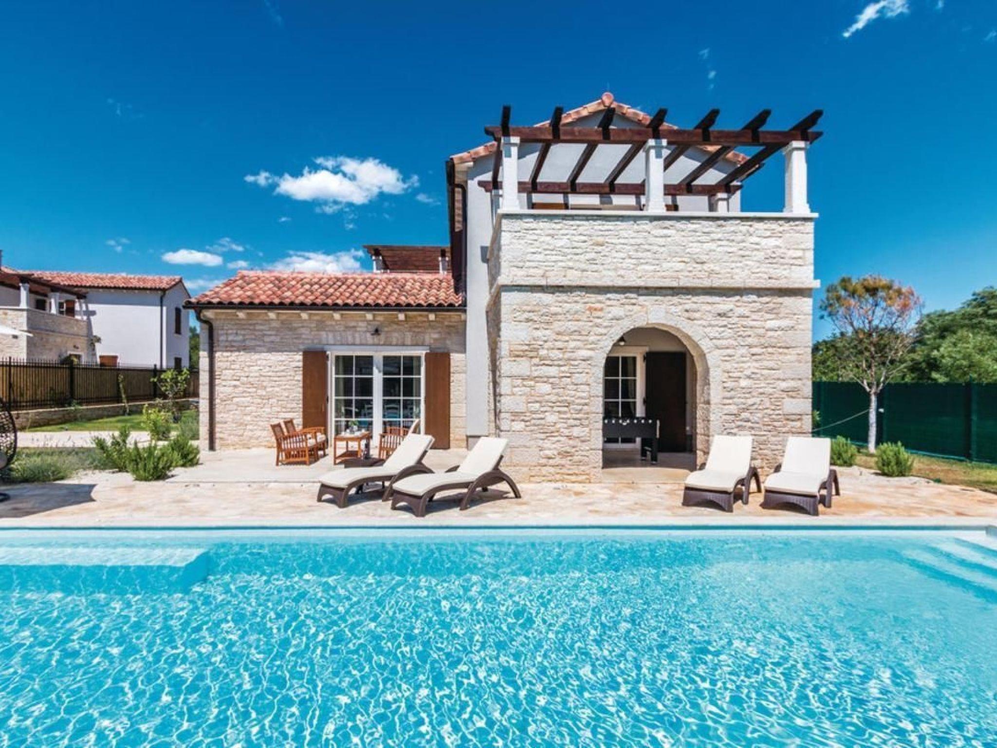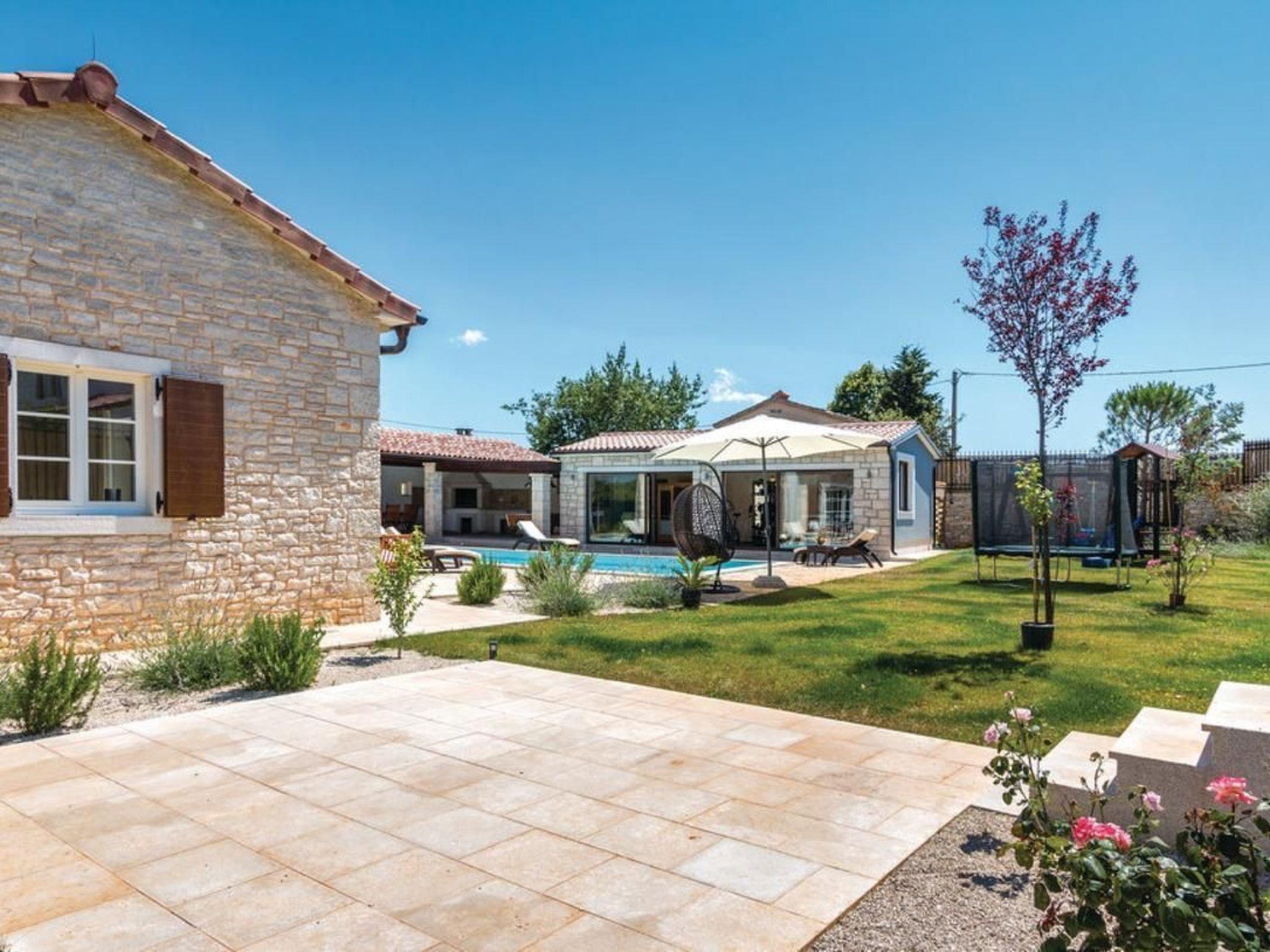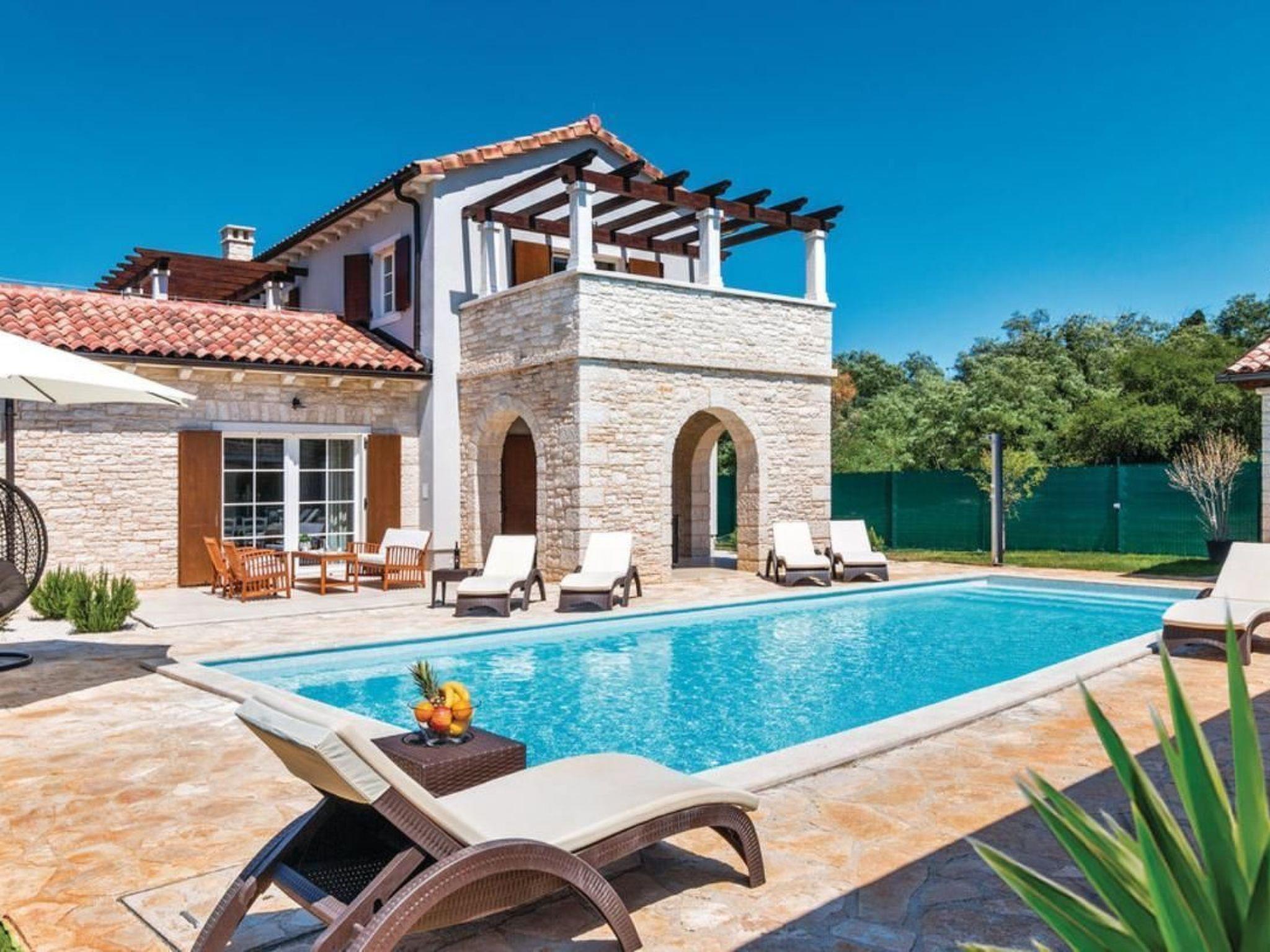 Make your dream vacation come true in this beautiful holiday home located in the small town of Sv. Kirin. This high-quality holiday home is a blend of traditional architecture and modern interiors that fully meets today's living standards. The spacious and stylishly furnished rooms have been decorated with great attention to detail and invite you to relax. The living room with kitchen and fireplace, as well as two bedrooms, are located on the ground floor, while two more bedrooms are upstairs. Billiards, table tennis, darts, and table football ensure fun times with your friends. The well-kept garden features a wellness and relaxation room for lovers of active relaxation who never want to give up their daily routine. This wellness area is separated by glass walls that can be opened, allowing you to enjoy wellness in the open air. The numerous facilities, as well as the green garden and the peaceful surroundings, will delight children and adults alike. We recommend visiting the romantic towns of Rovinj, Porec, and Rabac with their unforgettable beaches. Also worth seeing are the ancient city of Pula with its monuments, such as the Roman Forum. For example, the Roman amphitheater, known as the Arena, or the triumphal arch known as the Golden Gate. The city of Pula, in addition to a rich cultural and historical heritage, also offers several summer events and excellent restaurants. Visit the Barba Tone ranch in Manjadvorci and try horseback riding and hiking through the beautiful forests. Those seeking more adventure should visit the Adrenalin Park rope park in the neighboring town of Glavani. Short description: Other: Non-smoking house. Short description: 1. Number of kitchens: 1. Surroundings: Rental options: Car rental, bicycle rental. Sports opportunities in the area: Fishing, golf course, hunting, mountain biking, cycling, sailing, surfing, diving, tennis, water skiing. Garden and outdoor facilities: Outdoor pool (exclusive use), sauna, swimming pool, whirlpool. Garden facilities: Barbecue, gazebo (gym/fitness not available).