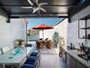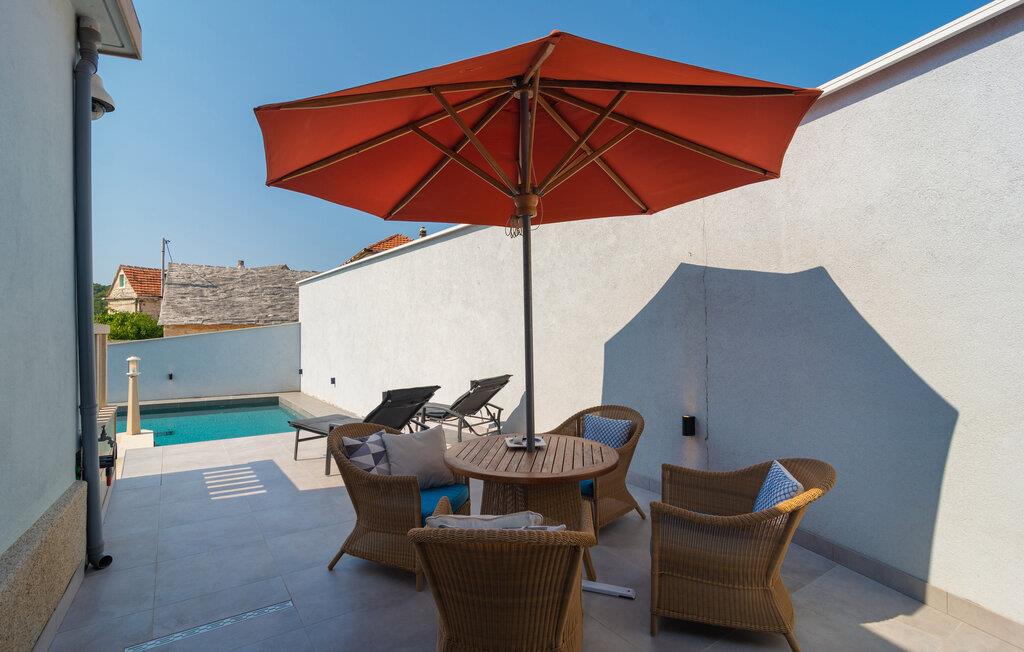 Den rummelige terrasse med udsigt over swimmingpoolen indbyder til solbadning og ophold. Her kan I nyde roen i omgivelserne og mærke den friske havbrise. Glæd jer over det udendørs køkken, hvor I kan lave lækre måltider, som I også kan nyde derude.