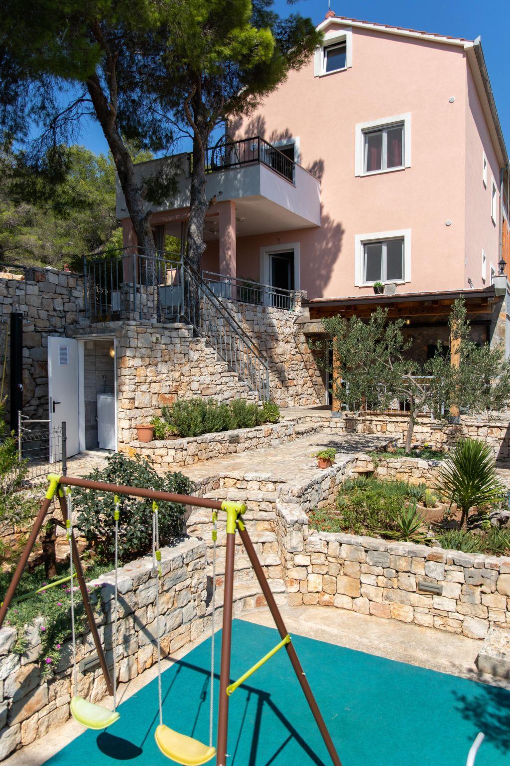 House Anka is ideal house for family's with children and/or group of friends. House Anka is located 40 m from the sea and only 2 km from the center of Milna on the island of Brac. House Anka has 4 bedrooms, 4 bathrooms, and is ideal for comfortable accommodation for up to 8+2 people. There is also playground located in the garden and 3 terraces with dining and/or sitting area and barbecue. House has private parking for 2 cars. House has sweeping sea views across both Duboka and Lucice Bays, amongst the most stunning bays in the Adriatic. Surrounded by a beautiful natural landscape and crystal-clear waters nestled among the pine trees, this is a perfect place to relax and connect again with nature, friends, and family.